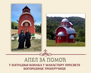 За помоћ у грађевинском и другим неопходним материјалима можете се обратити настојатељици манастира монахињи Евгенији на број: 064 14 51 015