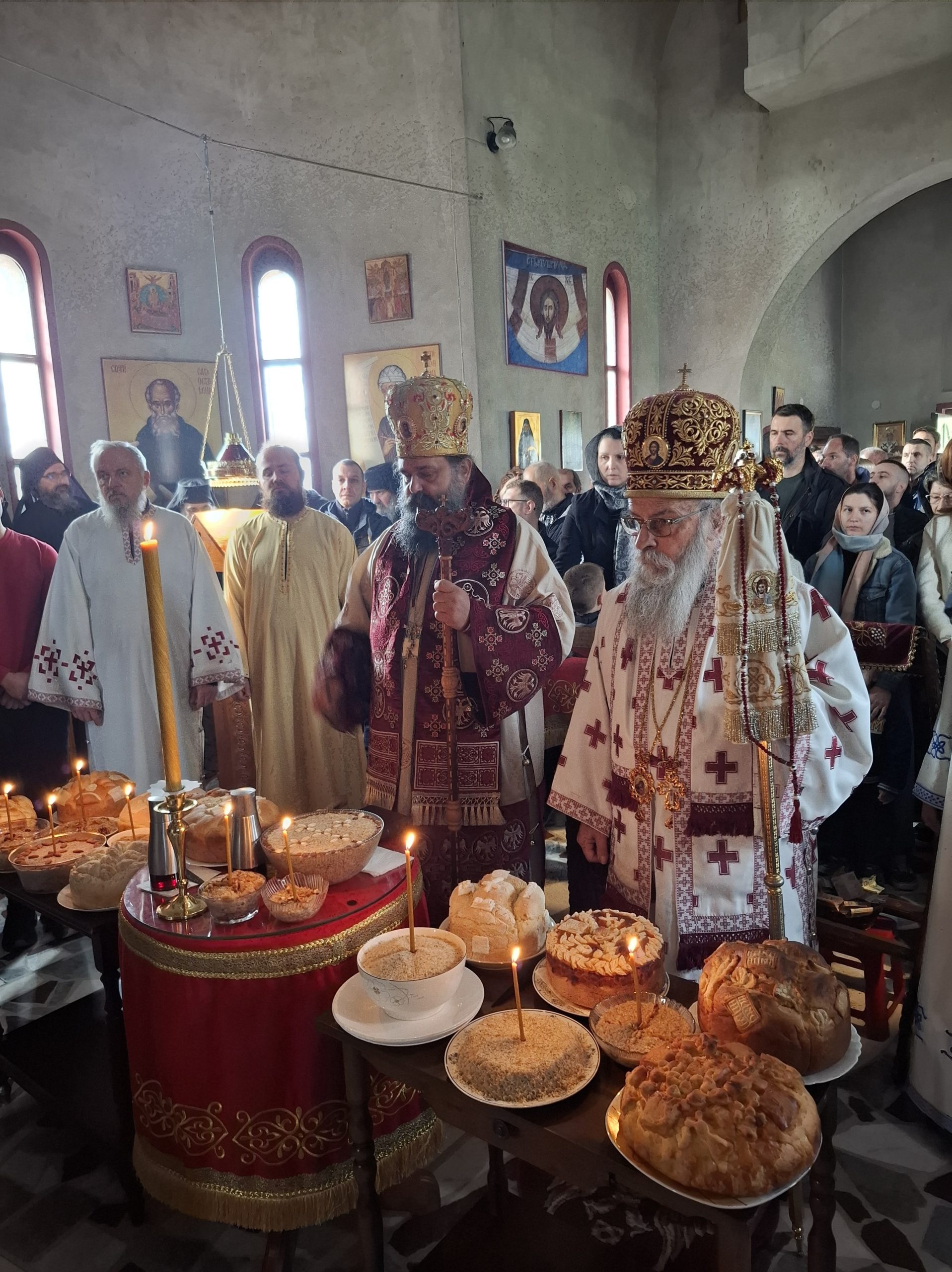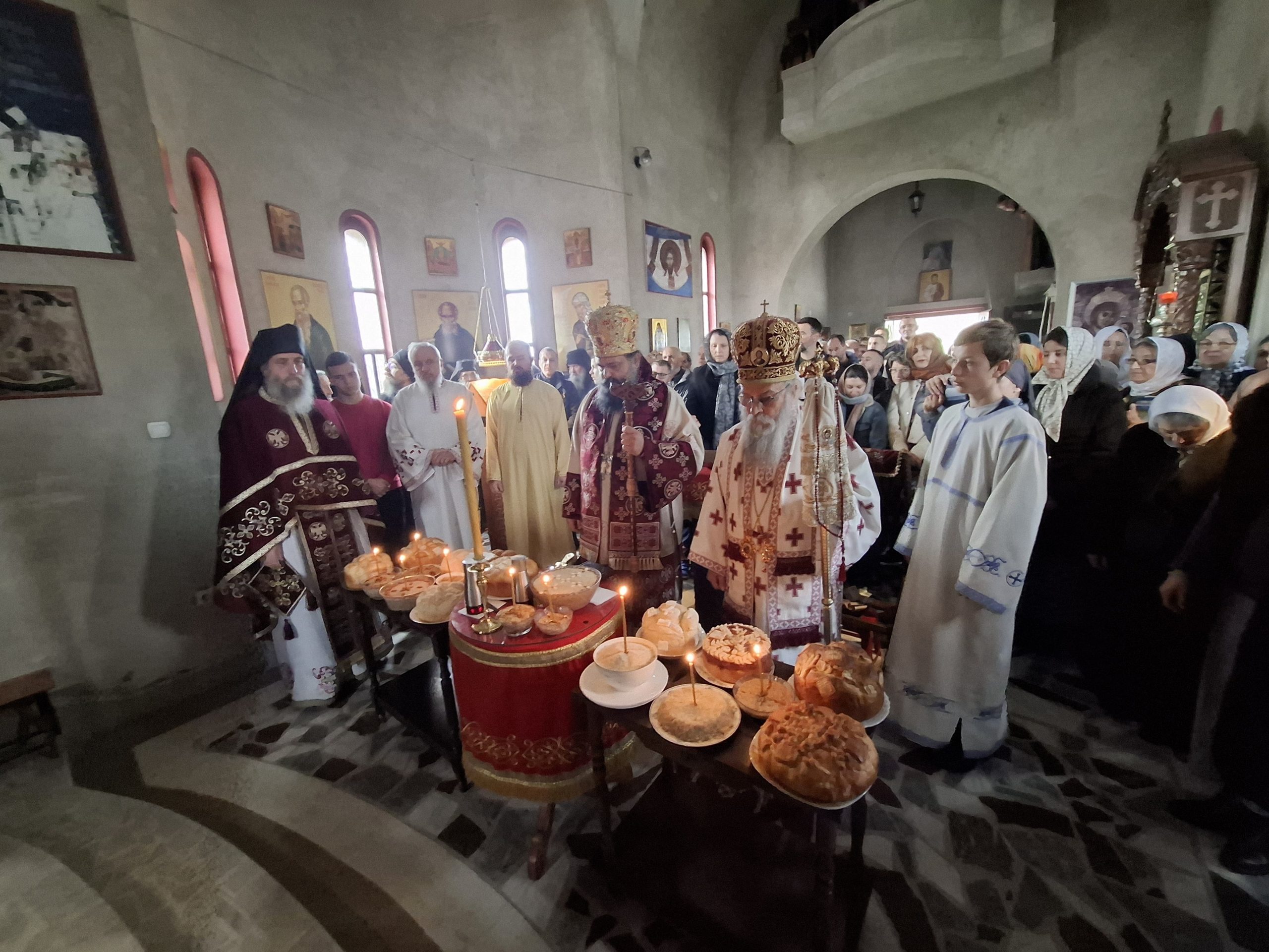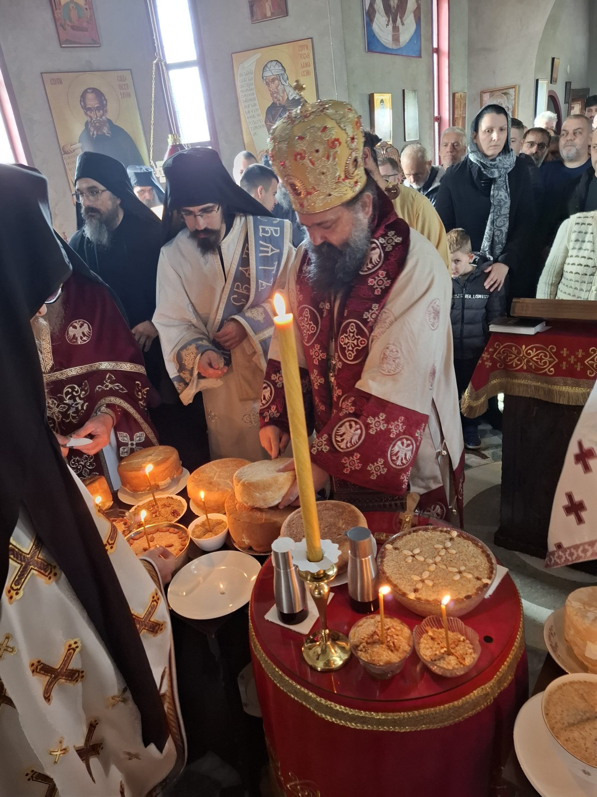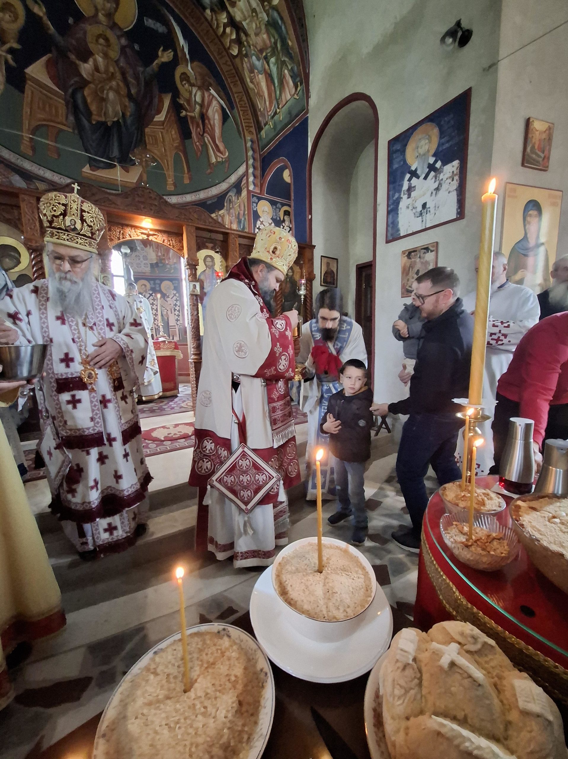 Након Свете Литургије Владика Ксенофонт обавио је чин резања славског колача и благосиљања жита које је у част Светог великомученика Георгија принео Владика Николај.