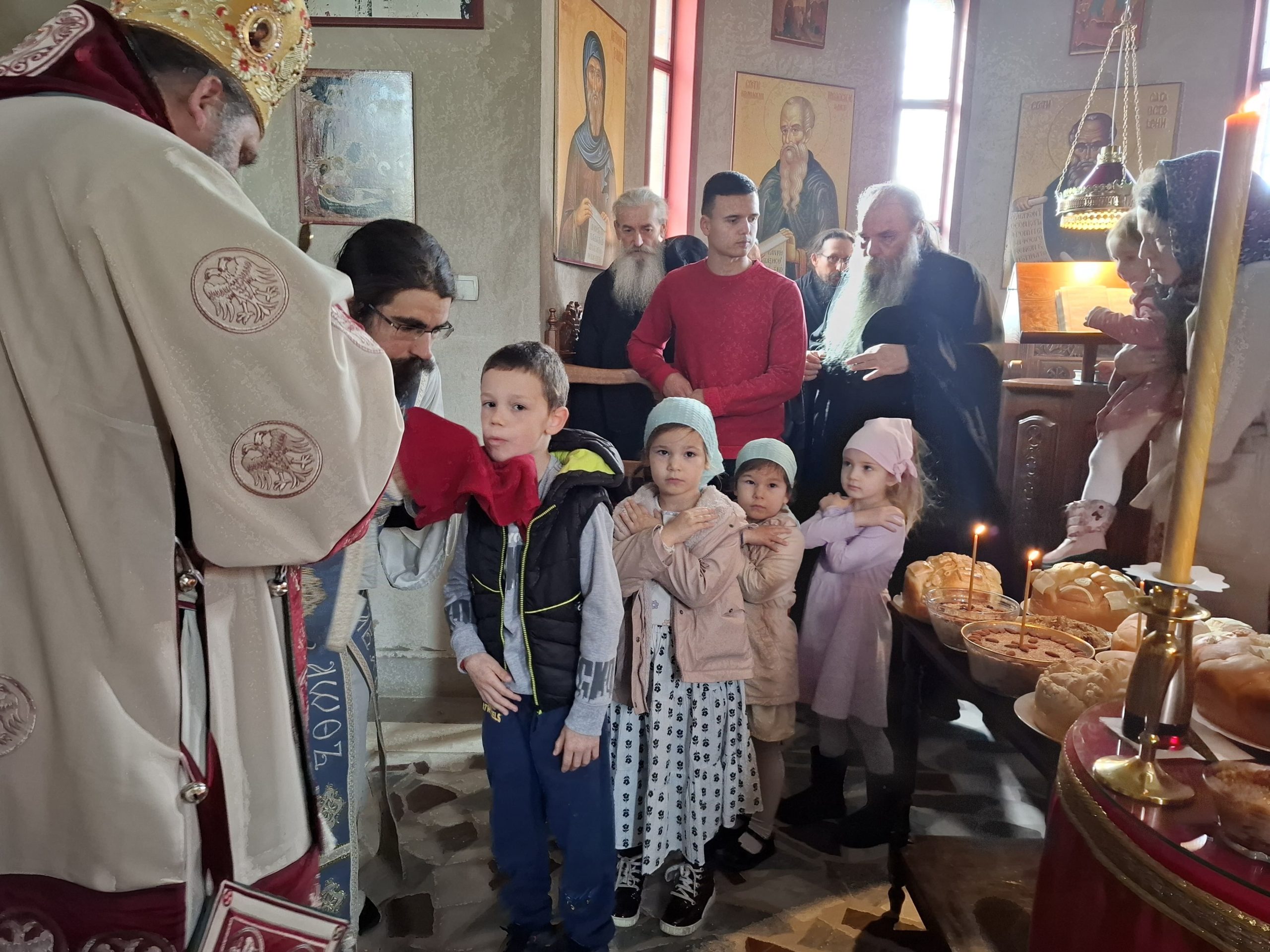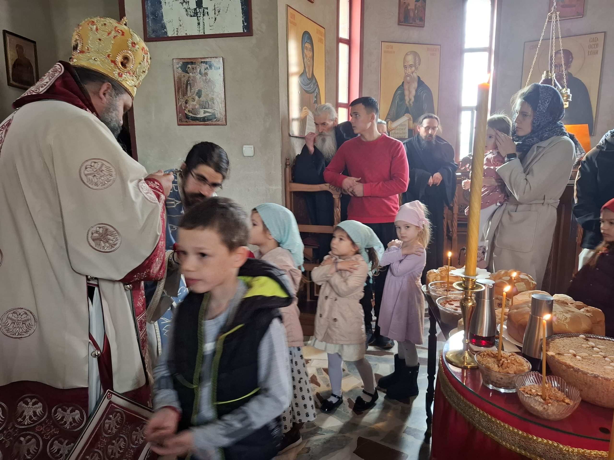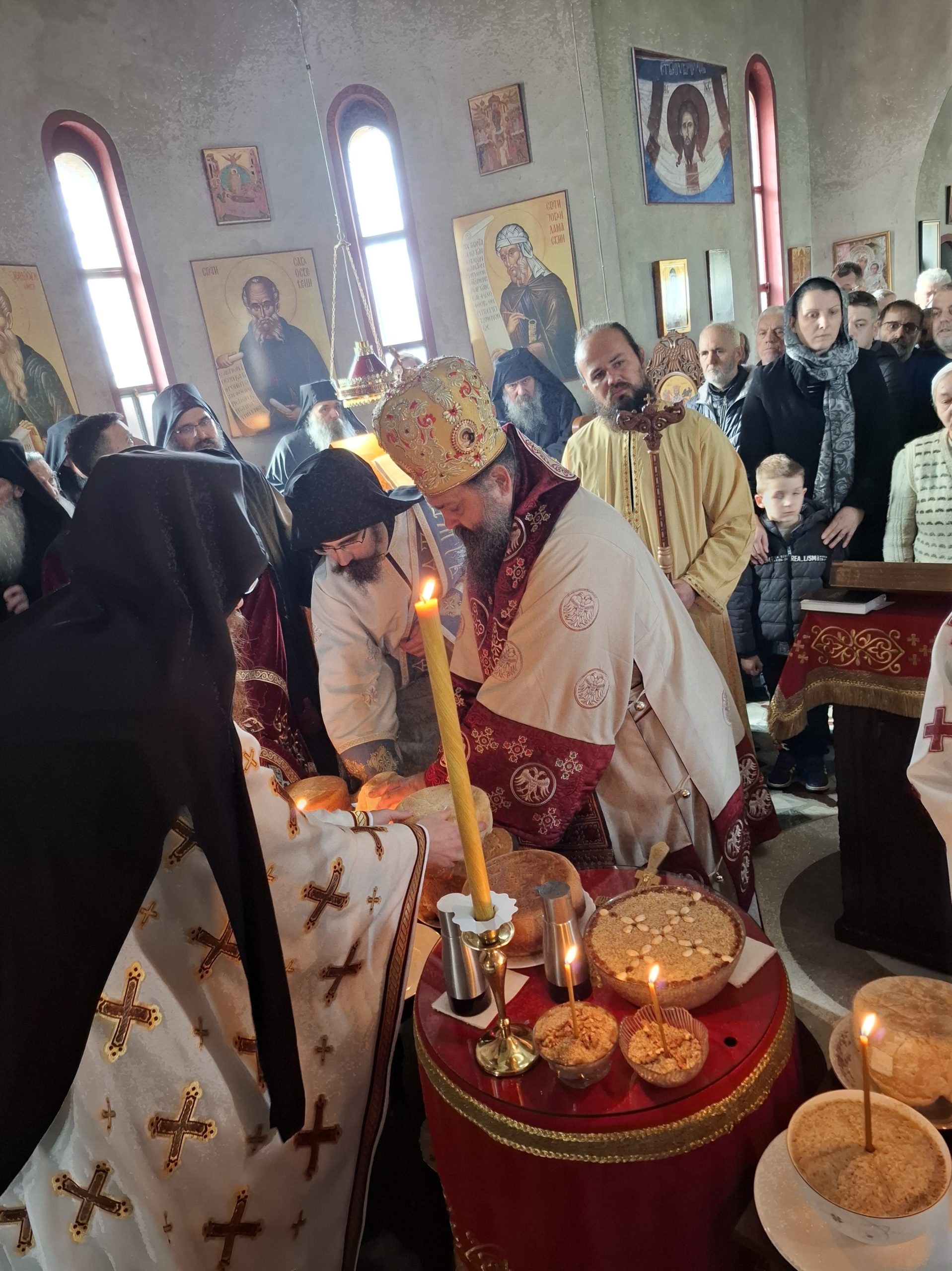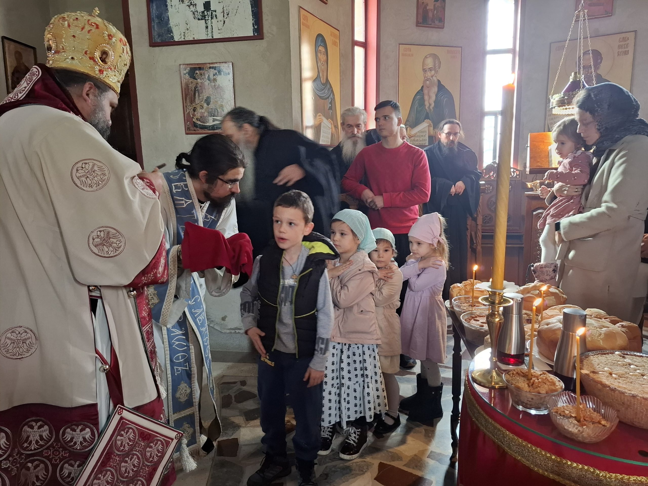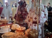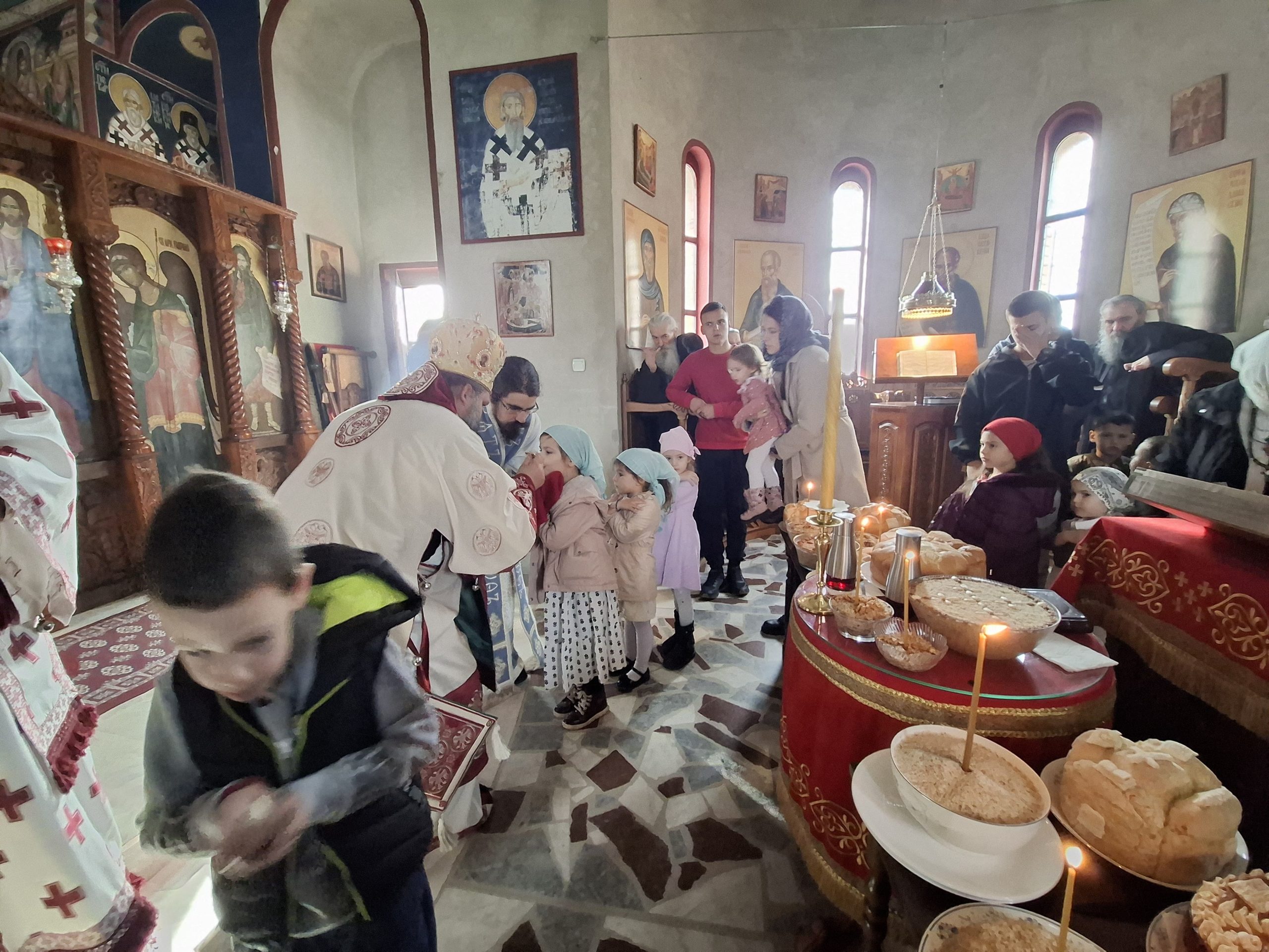 Након Свете Литургије Владика Ксенофонт обавио је чин резања славског колача и благосиљања жита које је у част Светог великомученика Георгија принео Владика Николај.
