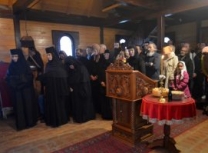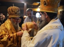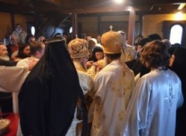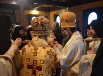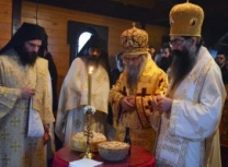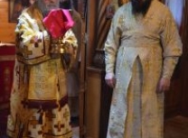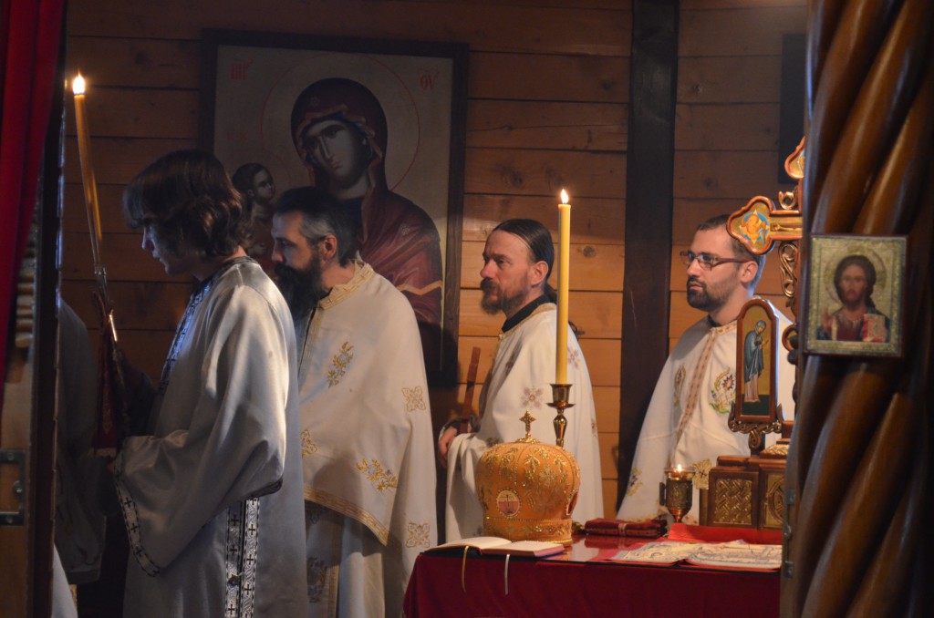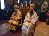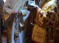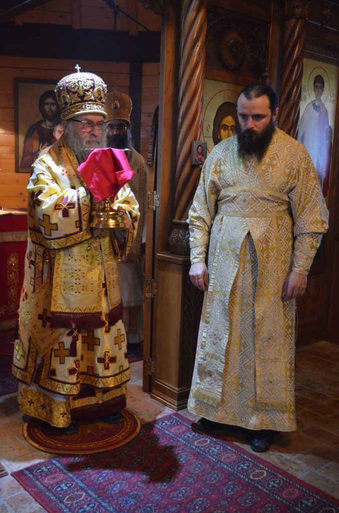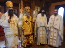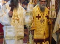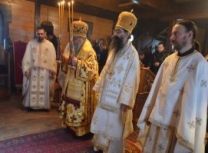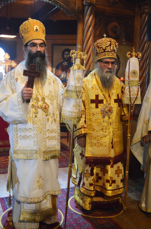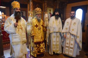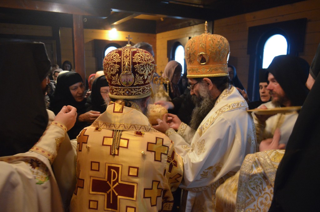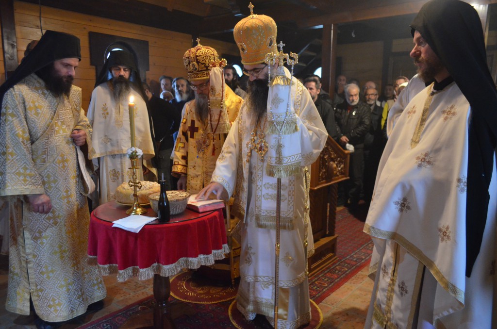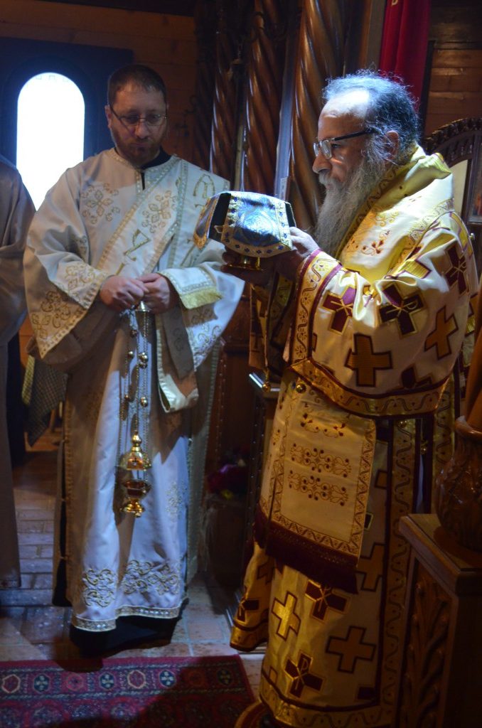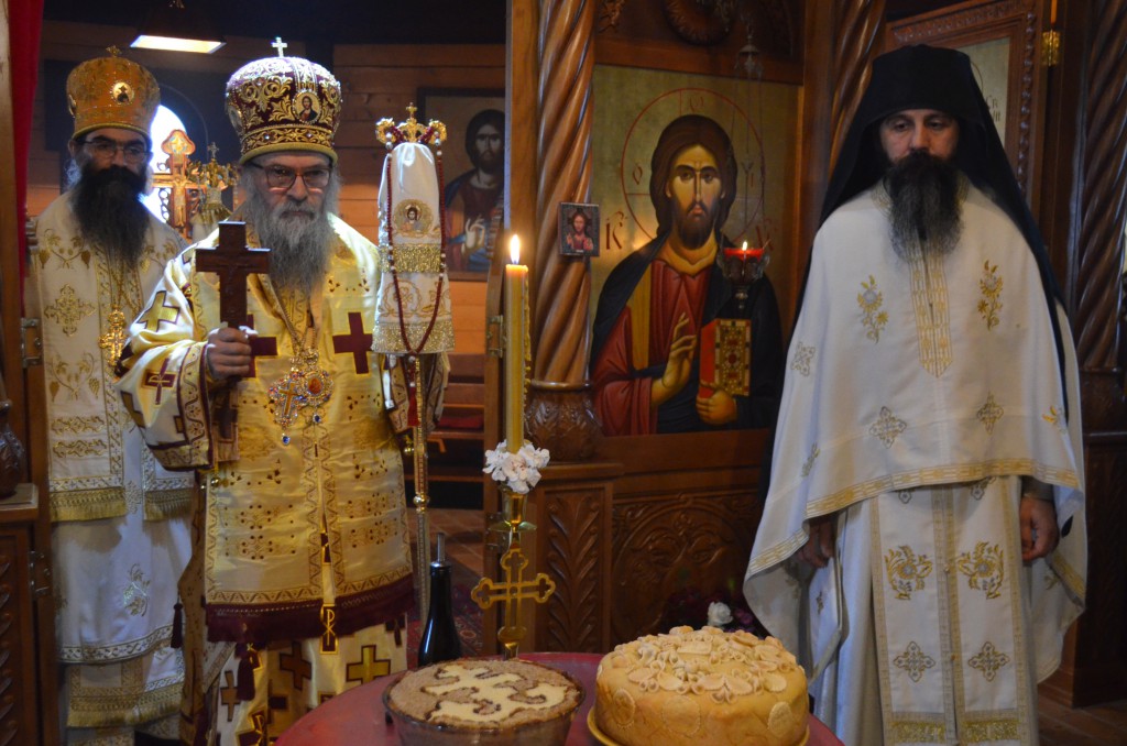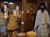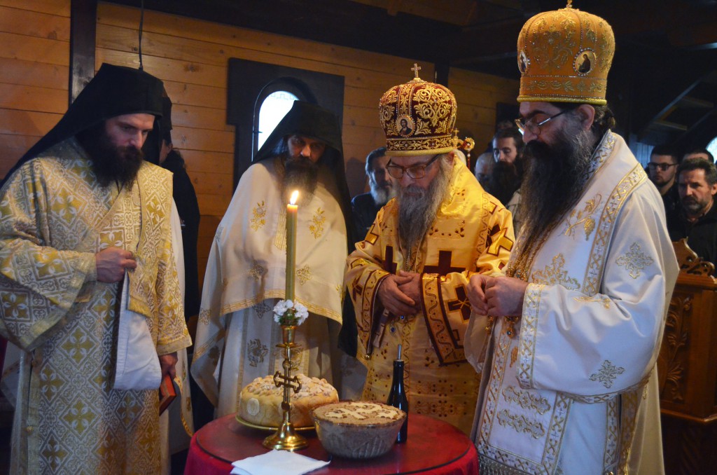 Након Свете Литургије Владика Наум је обавио чин резања славског колача и благосиљања жита које је у част светог великомученика Георгија принео Владика Николај.