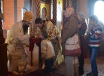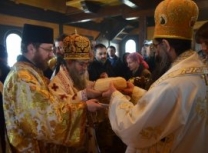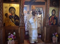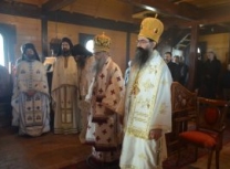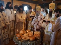 Након Свете Литургије владика Наум је обавио чин резања славског колача и благосиљања жита које је у част светог великомученика Георгија принео владика Николај.