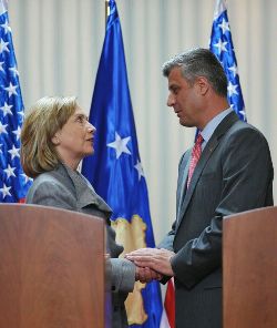 И, шта ће садa Вашингтон да уради с „нашим“ делијом Тачијем? Само потражите његове фотографије на Google претраживачу, са готово свим главним актерима САД-а којих можете да се сетите, и видећете га како се топло рукује или често другарски грли са скоро свима из Ко је ко? америчког естаблишмента: Џорџом Бушем, Конди Рајс, Бил Гејтсом, обојим Клинтоновима, Џозефом Бајденом, Медлин Олбрајт, Весли Кларком итд (види фото-прилог „Змија и пријатељи“ на крају текста). Човек би волео да помисли да нека од ових фаца има бар пристојности да каже (па чак и притворно[13]): Шта! Па ја нисам имао појма! НИКАД не бих овог подржавао да сам знао! Но, проблем је, чак и без ових ситних грехова трговином органима, што естаблишмент САД-а[14] ЈЕСТЕ знао, ОД ПРВОГ ДАНА, да су Тачи и компанија (Ослободилачка војска Косова, ОВК) само гомила битанги. Исто то су знале и обавештајне службе наших савезника. (А не варајте се, није само Тачи у питању. Ако треба да се Тачи одбаци, можемо да нагађамо да је „план Б“ да се на његово место углави неки од његових једнако злих ОВК другара[15].) Они, тј. наша влада, ЗНАЛИ су да су ОВК уствари злочинци који ваљају дрогу, робље и оружје читавом Европом. Знали су да ОВК подржава Осама бин Ладен (са којим се, по сведочењу бившег шефа албанске тајне службе[16], Тачи лично у Тирани састао 1998. године да испланирају џихад на Косову[17]), Иранци, Саудијци и Турци, као и други следбеници исламске ре-реконквисте[18] на Балкану. Ми смо их упркос томе подржавали, уништавајући у том процесу сваку трунку владавинe закона и пристојности. И шта сад? По свој прилици, ушанчити се у досадашње положаје, у нади да ће све да прође, а за то време силом по свету наметати[19] подршку илегалној сепаратистичкој и терористичкој творевини званој „КосовА“.