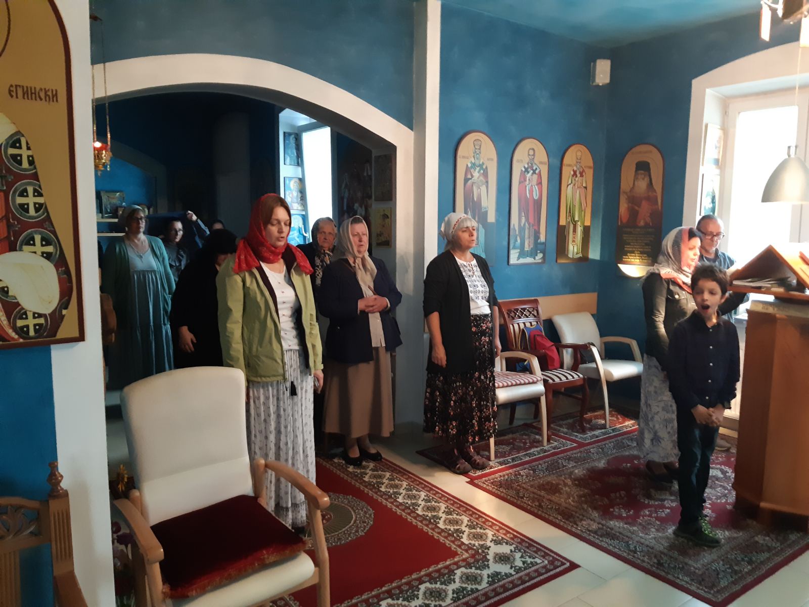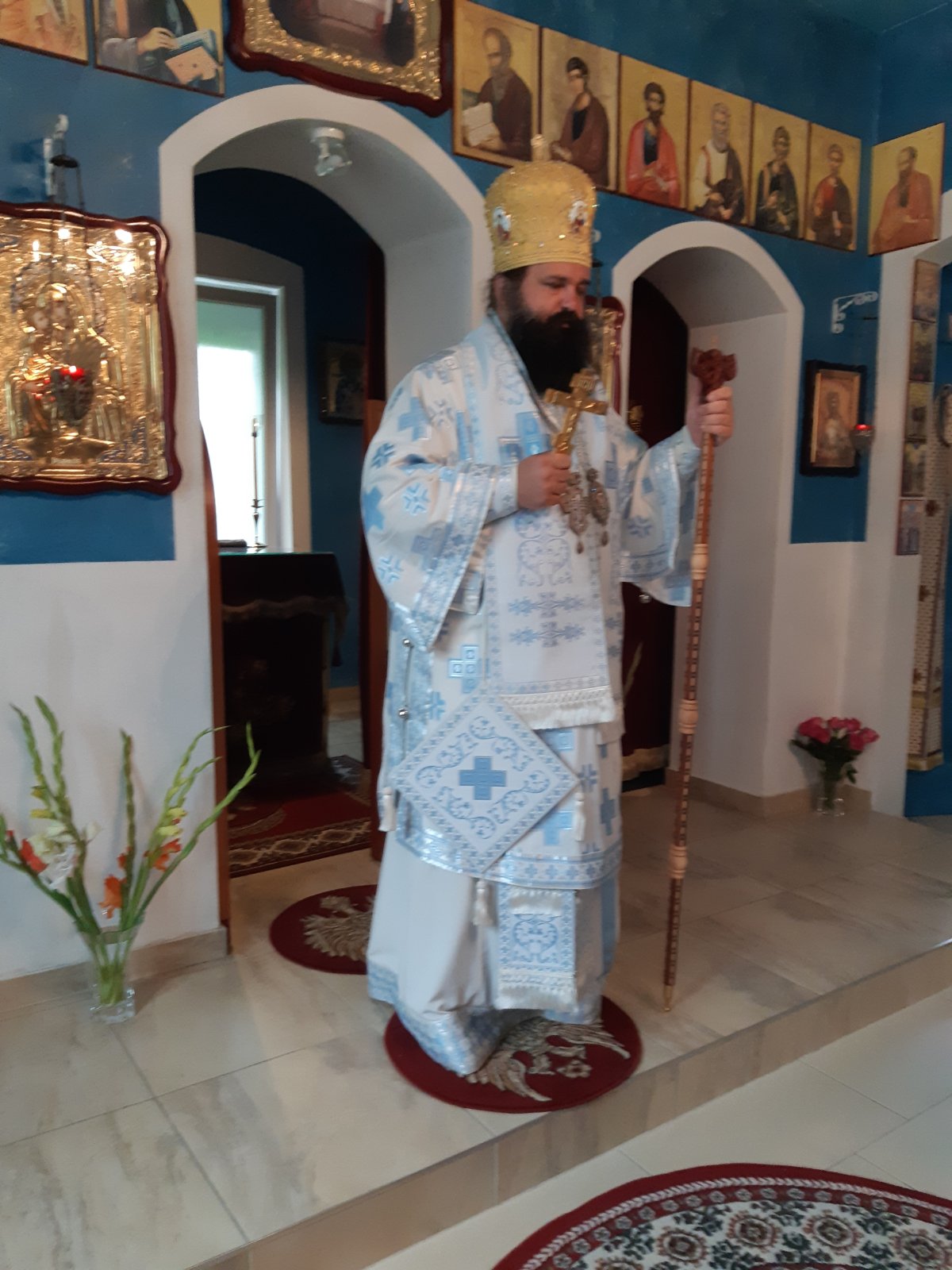 Владика је рекао: „Нека би дао Бог да се не уплашимо, да нас не преваре лажни учитељи, да нас не преваре лажни пророци, лажни христоси којих је много данас, браћо и сестре, око нас свуда по свијету, поготово у овој туђој земљи у којој сте се сакупили, у коју сте дошли, што каже изрека `трбухом за крухом`, да нешто зарадите за себе и за своје породице, да им нешто обезбједите. Видите и сами како је тешка ситуација, у храмове Божије уђе мрзост опустошења, да се вјера Божија квари, да се вјера Христова мијења, да нас заводе разни и лажни учитељи, чак и под митрама, чак и у свештеничким одеждама, чак и у монашким расама. Нека би дао Бог да за таквима не пође ниједан од нас, него да иде право путем Христовим, да исповиједа Вјеру Христову као што су исповиједали сви Свети Срби. Гледајмо примјере свих Светих Срба који су прије нас живјели, од онога највећега Србина који се родио у српском народу, Светога Саве, првога архиепископа српског, па свих оних осталих кроз историју – ево данас прослављамо још једног великог Србина, Светог Саву Трећег, архиепископа српског. Прослављамо и Свету преподобномученицу Параскеву која је живот свој дала за Христа. Након што је монашке завјете дала, живот свој Христу предала, није се, дакле, гнушала, либила и плашила да и живот свој и мученичку крв своју пролије за Христа. Славимо и учитеља Светог Пантелејмона, великог исцјелитеља и бесребреника кога ћемо сутра прославити, његовог учитеља Ермолаја који га је учио медицинској науци, али прије свега учио га ономе што је најважније хришћанину, учио га светој вјери православној, светој вјери хришћанској. О, Господе Христе, један од Тројице, удостој нас да и Тебе видимо у Царству Небескоме, да нам Ти будеш у овом животу помоћник, да бисмо прославили Тебе са Оцем и Духом Светим, сада и увијек и кроза сву вјечност. Амин, Боже, дај!“