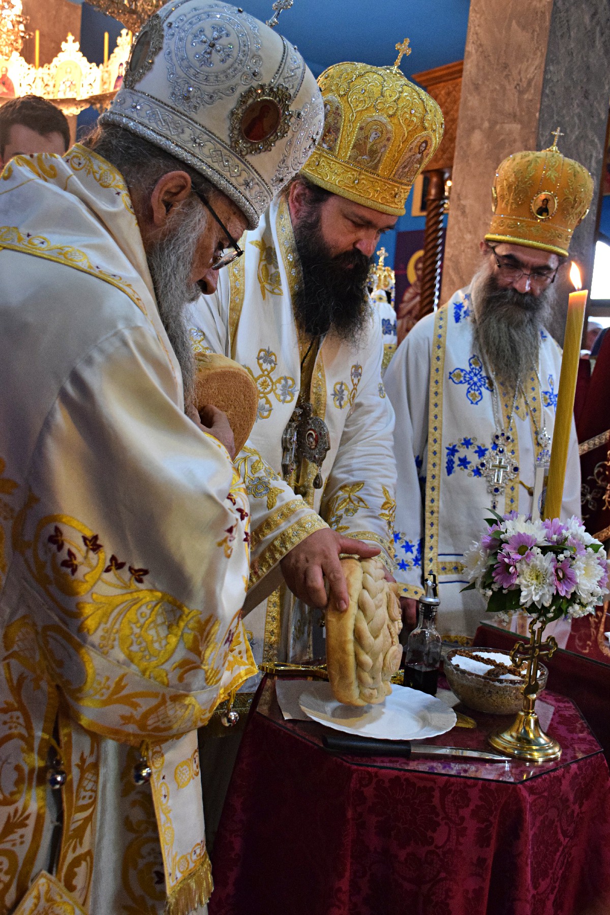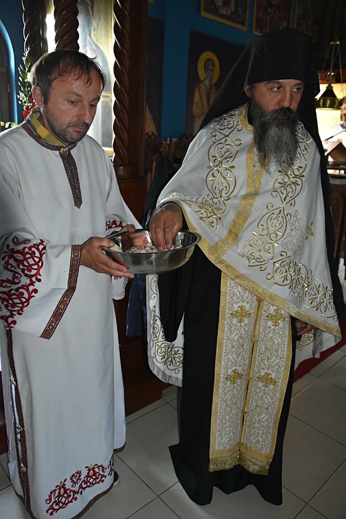 Након Литургије Владика Ксенофонт је извршио чин резања славског колача и благосиљања жита које су у част преподобног Јустина Ћелијског принели манастирско братство и овогодишњи домаћини славе: Андреј и Андријана Делић из Београда и Мирослав Станић из Земуна. За наредну годину пријавили су се: Радомир Дедић из Сремчице, Лазар Станковић из Сремчице и Александар Станковић из Гетингена (Немачка).