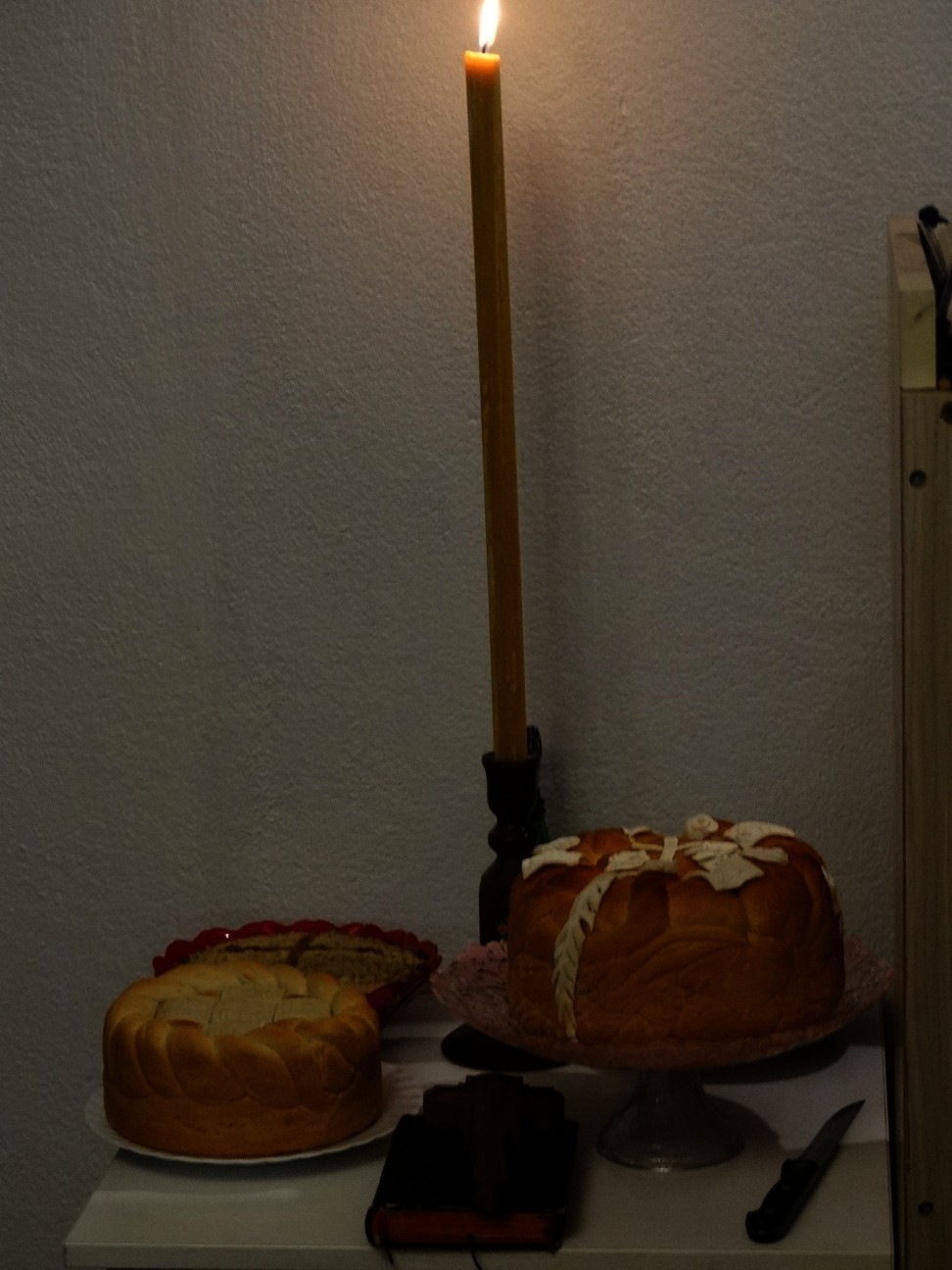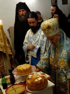 Након Литургије Владика Артемије је извршио чин резања славског колача и благосиљања жита које су у част Преподобног Симеона Мироточивог принели манастирско братство и овогодишњи домаћини славе: Богослав, Дејан и Дарко Томовић из Новог Пазара. За наредну годину пријавили су се: Марко Премовић, Иван Глишовић и Љиљана Глишовић из Рашке.