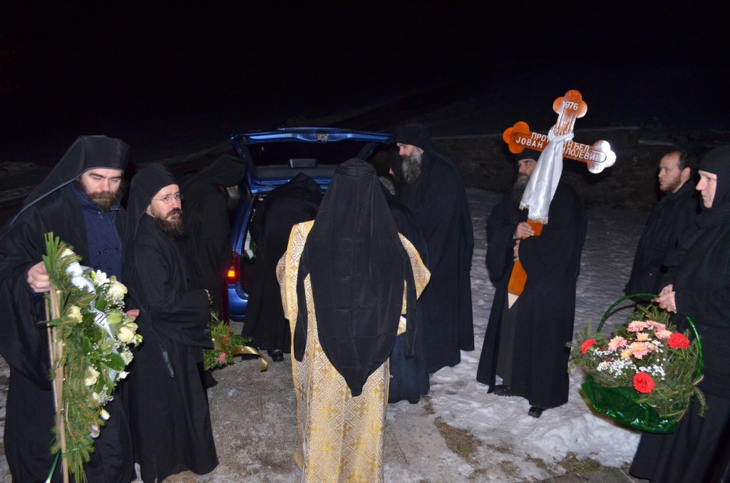 „По неиспитивом и неисказивом промислу Божијем, браћо и сестре, сабрали смо се на данашњи дан, не само да прославимо спомен великог угодника Божијег светог Јована Претече и Крститеља, већ и да испратимо нашег сабрата, протосинђела Јована, да његово тело предамо земљи, која ће га чувати до свеопштег васкрсења а његову душу да испратимо у Царство Небеско. Да се замолимо Богу да му свети Претеча буде сапутник, да га уведе у Царство Небеско. Да се помолимо Богу да и наш отац Јован свима нама, његовој сабраћи, његовим духовним чедима, припреми пут и да буде својеврсни претеча свима нама у Царству Небеском, које, нека би достигли заједно са њим, молитвама светог Пророка, Претече и Крститеља Јована. Амин. Боже дај“.