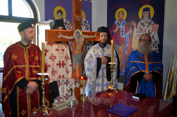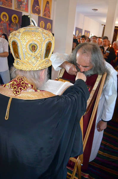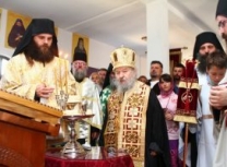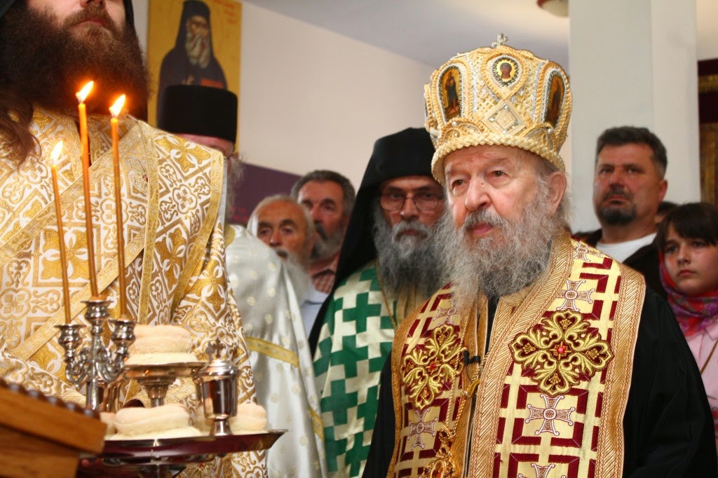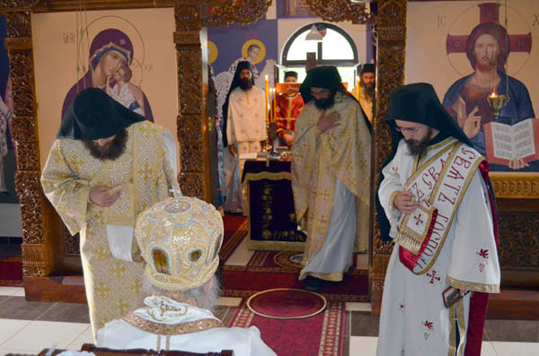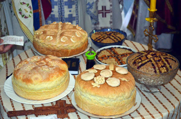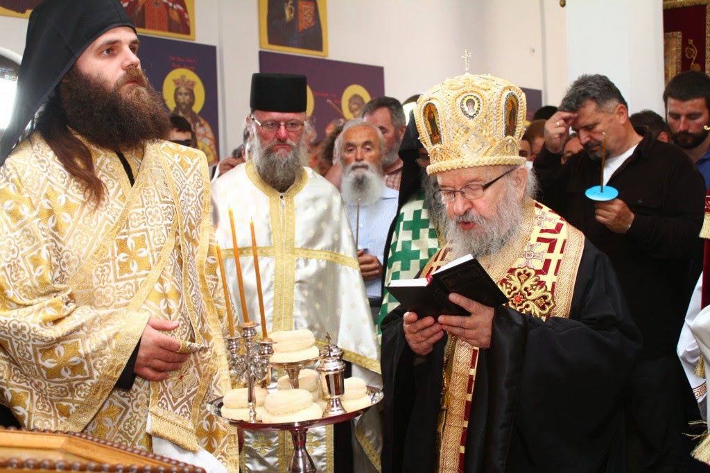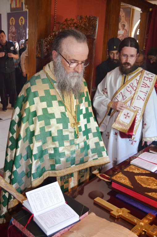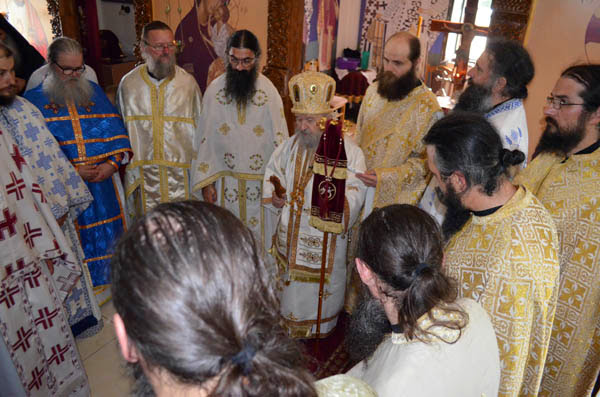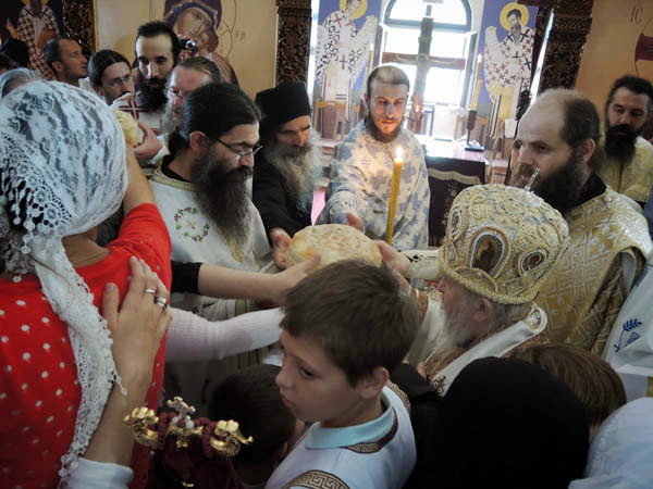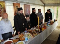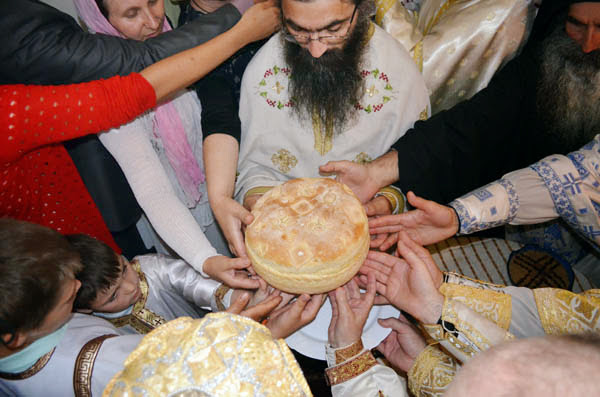 Владика Артемије је извршио чин резања славског колача и благосињања кољива, које су поред монаха Јустина, припремили и домаћини славе у Барајеву заједно са протосинђелом Наумом.