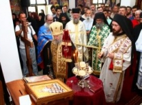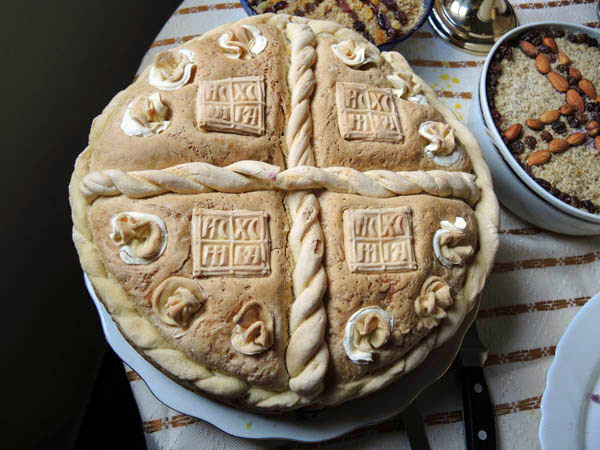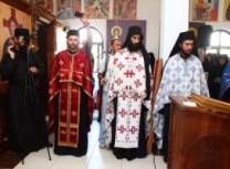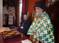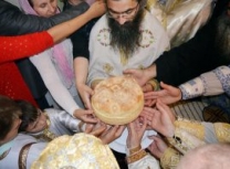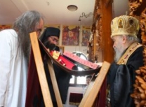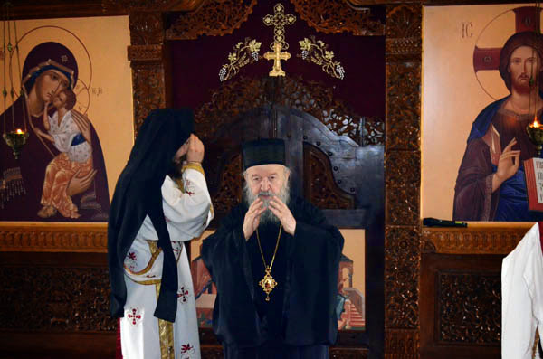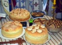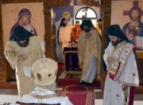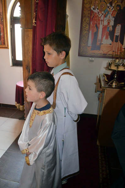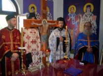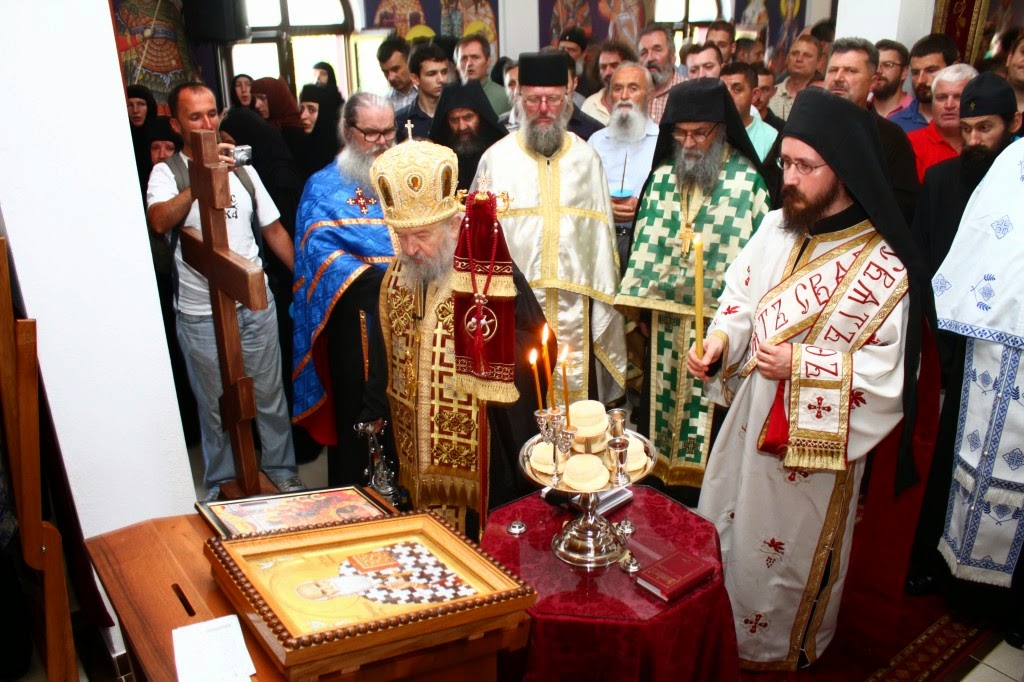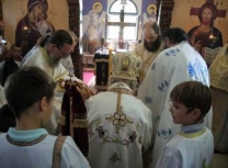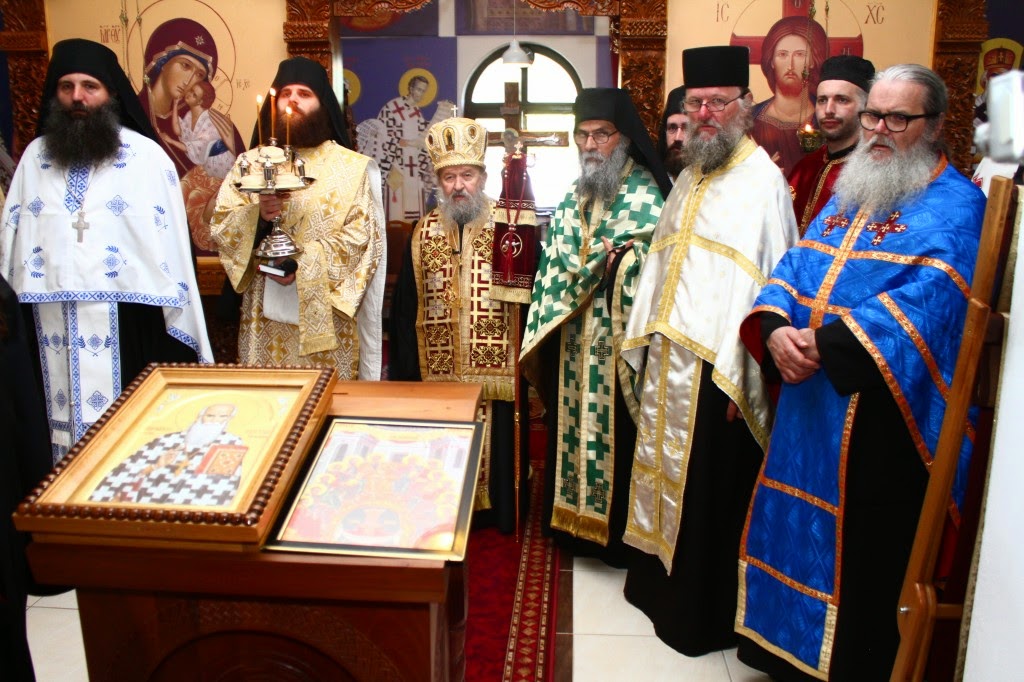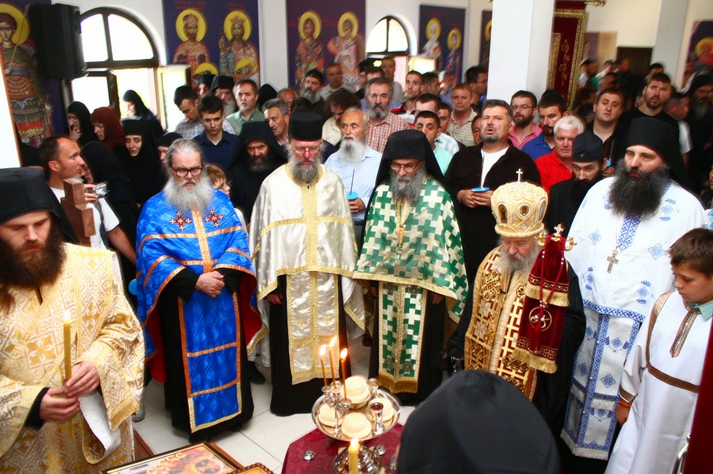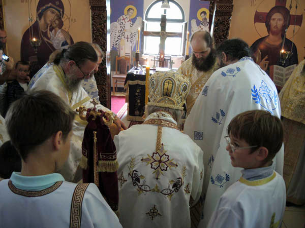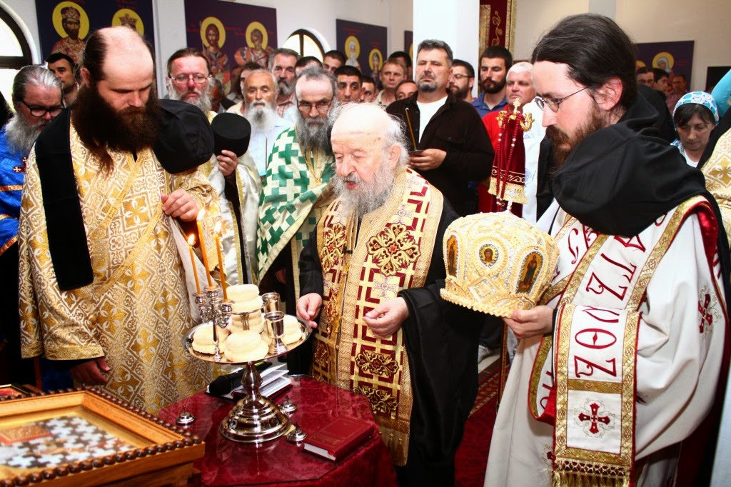 Владика Артемије је извршио чин резања славског колача и благосињања кољива, које су поред монаха Јустина, припремили и домаћини славе у Барајеву заједно са протосинђелом Наумом.