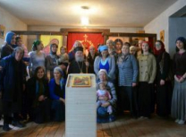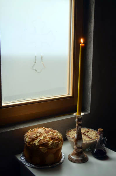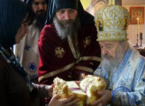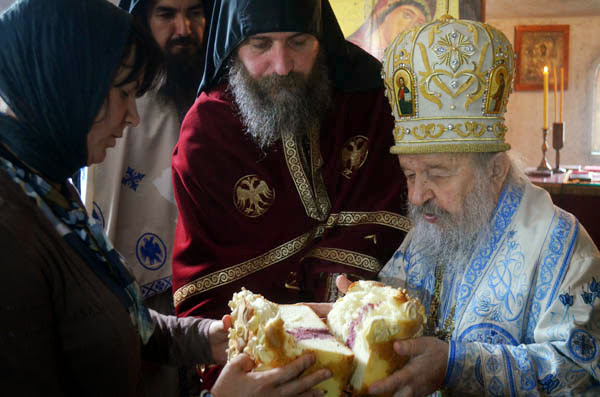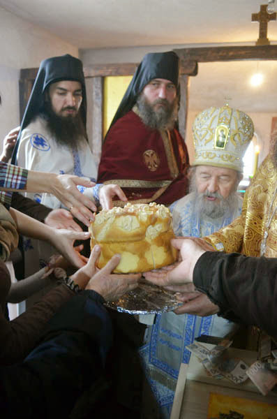 Владика је извршио чин сечења славског колача и благосиљања кољива, које су припремиле сестре са Косова и Метохије у част жена Мироносица.