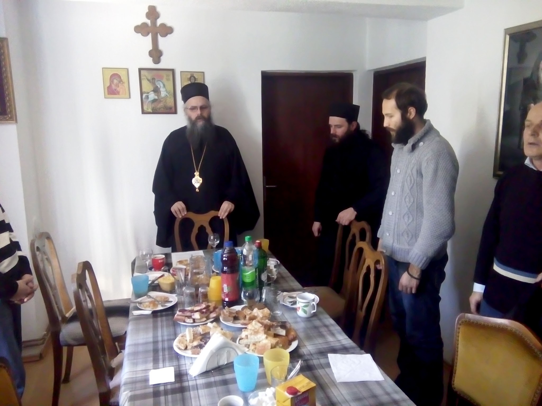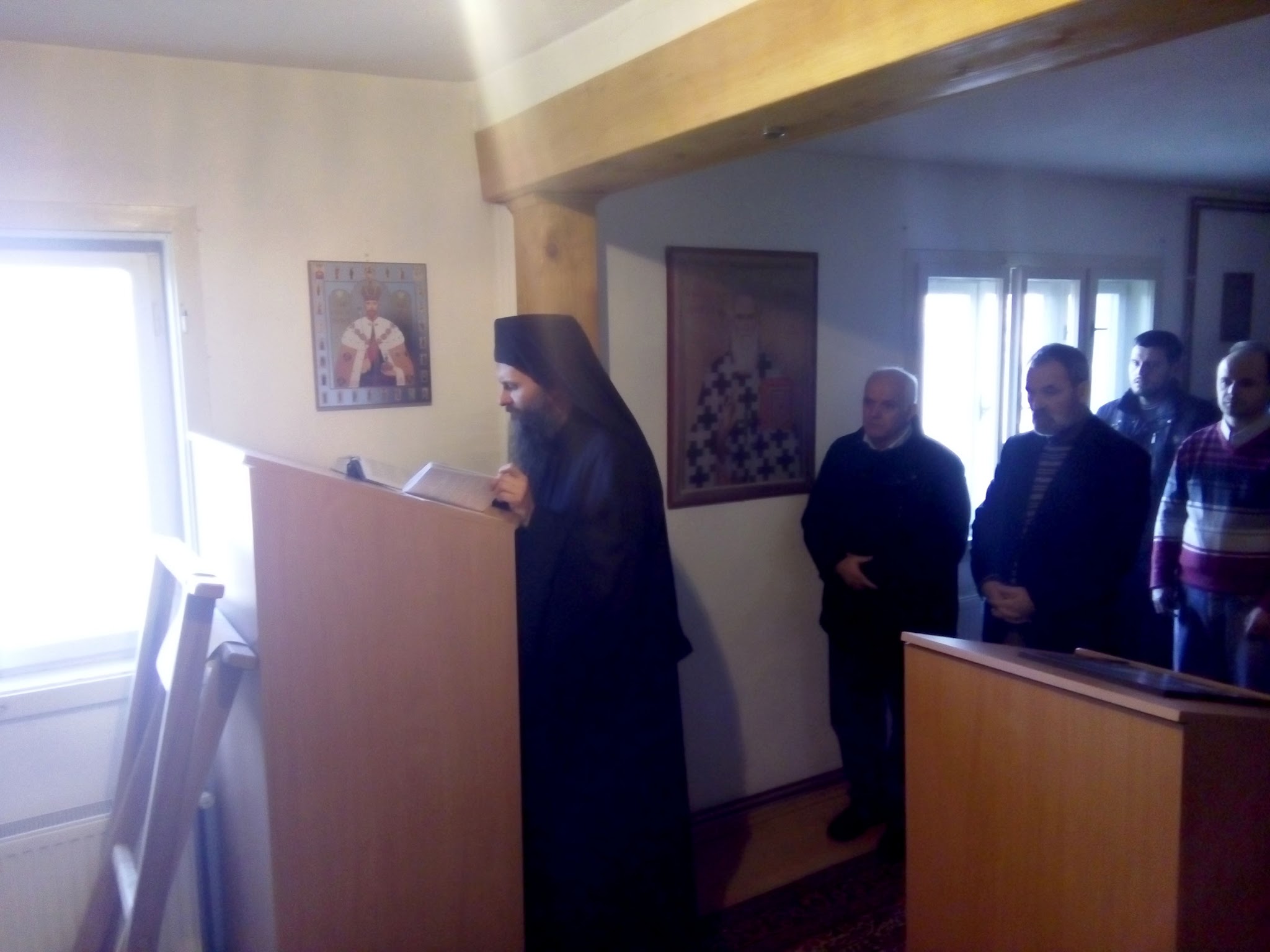 После Свете Литургије манастирско братство је приредило трпезу љубави за све присутне. Овом приликом је владика Максим одржао пригодно предавање о „општем стању у СПЦ и нашем исправном ставу у њему“. У предавању је продужио своју беседу изговорену на Литургији и проширио тему повезаности вере и трпљења. Такође, владика је подсетио да су јерес екуменизма и кварење вере у СПЦ саборни и заједнички проблем свих чланова Цркве који захтева деловање и заузимање у борби за веру свих њених чланова, а да решење свих проблема, и личних, и саборних, почиње практичним живљењем у православној вери, тј. исправљањем нас самих, уклањањем од греха, борбом са сопственим слабостима, једном речју истинским побожним животом у Христу, како бисмо имали снаге и нашли прави начин у супротстављању свеопштем духовном отпадништву у СПЦ. „Чување и одбрана вере православне је богочовечански и јеванђелски циљ, који, по речима светог Јустина Ћелијског, „захтева богочовечанске методе, које се рађају и настају у личном подвигу побожног живота у Христу, сваког од нас појединачно, а затим и саборно.“ То је владика изнео као решење садашњег, тешког стања у СПЦ, стања преовладавања екуменистички настројених пастира, склоних слободном и релативистичком односу према вери, моралу, богослужењу и свеукупном Светом Предању Цркве, као и прогону оних пастира и верника који се таквом отпадништву противе.