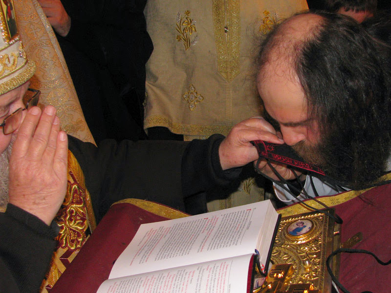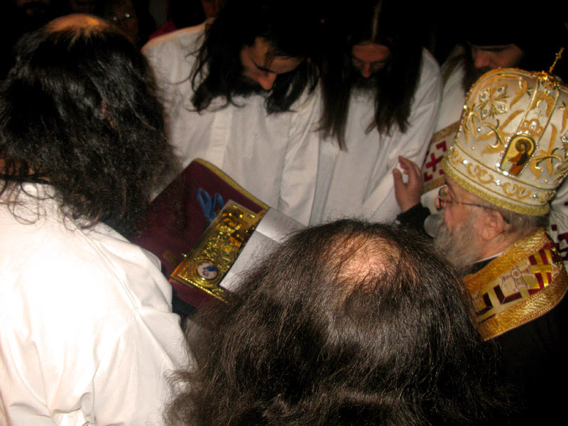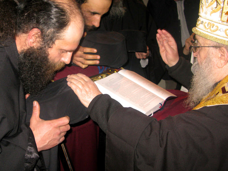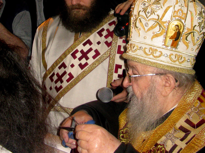 Преосвећеном Владици саслуживали су Јереј Небојша (Стевић), доскорашњи парох из Гаја (Епархија банатска), Јеромонах Варсануфије (Стошић), настојатељ обитељи, Јеромонах Иринеј (Ристић) и Јерођакон Дамјан (Ковачавић). Празничној служби присуствовало је бројно прогнано монаштво распете Епархије и око 500 верника из свих крајева Србије. На крају службе Владика је у чин мале схиме замонашио искушенике Драгана (Младеновића), Дејана (Стојановића), Марка (Јовановића) и Александра (Стопу) давши им монашка имена Василије, Григорије, Хризостом и Арсеније. Новопострижени монаси чланови су црноречког братства у егзилу а привео их је Архимандрит Николај (Николић), настојатељ у егзилу истоимене обитељи. После обављеног монашења Владика Артемије се присутнима обратио пригодном беседом (беседа се налази у прилогу).