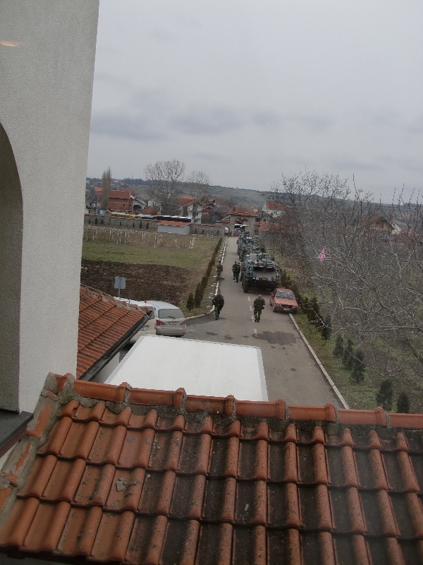 - Чињеница је да су сутрадан 14 фебруара, по благослову Владике Атанасија, све манастирске капије биле затворене за „Артемијеве монахе”. На главном улазу су били постављени дечански монаси и полицајци у цивилу. Иза њих су стајали војници КФОР–а, наоружани до зуба. На самом улазу зграде епископије су стајали војници КФОР-а под пуном ратном спремом. У манастирској порти могли су се видети оклопни транспортери КФОР- а и Косовска полиција. Овај „јуначки трио” дечански монаси-Тадићеви и Тачијеви полицајци-КФОР имао је задатак да спречи улазак „Артемијевих монаха” у манастир (видео запис и фотографије које ово потврђује погледајте у прилогу на крају текста). Свему томе треба додати и сведочење протосинђела Петра Улемека да га је 12. фебруара телефоном звао владика захумско-херцеговачки Григорије, молећи га да својим возилом превезе до манастира Грачанице неке телохранитеље из Требиња који треба да чувају манастир и епископију. Сазнавши да се, уствари, ради о батинашима који треба да Артемија чувају затвореног у Грачаници, а да не дозвољавају улазак у манастир монаштву рашкопризренске епархије, отац Петар је овај задатак одбио. Поставља се логично питање: Ако је смена Владике Артемија само унутарцрквено питање одакле присутност војника КФОР-а, полицајаца у цивилу и Косовске полиције у грачаничкој порти? По ком то закону, било црквеном или државном, православни монаси не могу да дођу до свог духовника да узму благослов и да питају за савет у новонасталој ситуацији? Ако Владика Атанасије има оправдање за такве своје поступке волео бих да их чујем. Ако их нема, онда заиста – Суди му по правди Твојој, – а не људској, – Господе Боже мој!