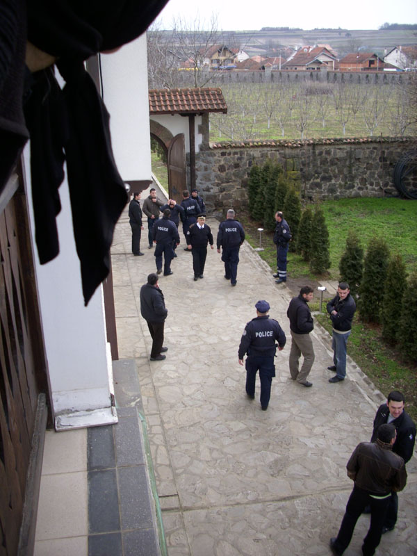 - Чињеница је да су 13. Фебруара, као и неколико дана пре тога, полицајци у цивилу „надзирали” манастирске капије и цео манастирски комплекс. Бројни специјалци су били и око зграде Патријаршије за време седнице СА Синода истог дана. Ово говори о чудној и невидљивој спрези Црква – држава која све време савршено функционише. Поставља се с тога логично питање: Ако је смена Владике Артемија била само унутарцрквено питање одакле онда појачана концентрација полицајаца на поменутим местима?