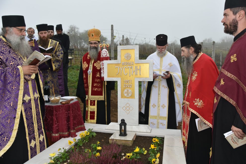 „Цео људски живот овде на Земљи је прожет крстом. Од рођења па до упокојења. И заиста, место пребивалишта нашег после овоземаљског живота до општега Васкрсења такође се обележава знаком крста, поставља се крст. Али, поред тога и сав људски живот овде на Земљи јесте крстоносни живот. И живот нашега монаха, оца Јустина, такође је био крстоносан. Целог живота, а посебно последње године свога живота, задњих десет година, он је узео можда један од најтежих крстова овде на Земљи, а то је крст монашки. Најтежи зато јер треба човек највећу жртву да учини носећи тај крст, а то је да се одрекне себе и своје воље. И заиста, отац Јустин је достојно носио тај крст монашки одсецања своје воље и послушања, чему су били сведок и братија ове свете обитељи и братија манастира Нове Никеје. Заиста, посебно њему није био тај крст лак јер је он дошао у позним годинама када је био већ оформљена личност, човек са својим карактером, са својим особинама. Али, заиста отац Јустин у свом монашком подвигу све је то бацио под ноге и заиста трудио се као најстарији монах у братству да заиста послужи свој братији у обитељи. И заиста, то је један од најлепших украса за монаха у том свом крстоношењу, то је да служи своме ближњем. Верујемо да је отац Јустин због тог смиреног ношења свога монашког крста и служења својој братији нашао милост код Господа и сместио се у рајска насеља.