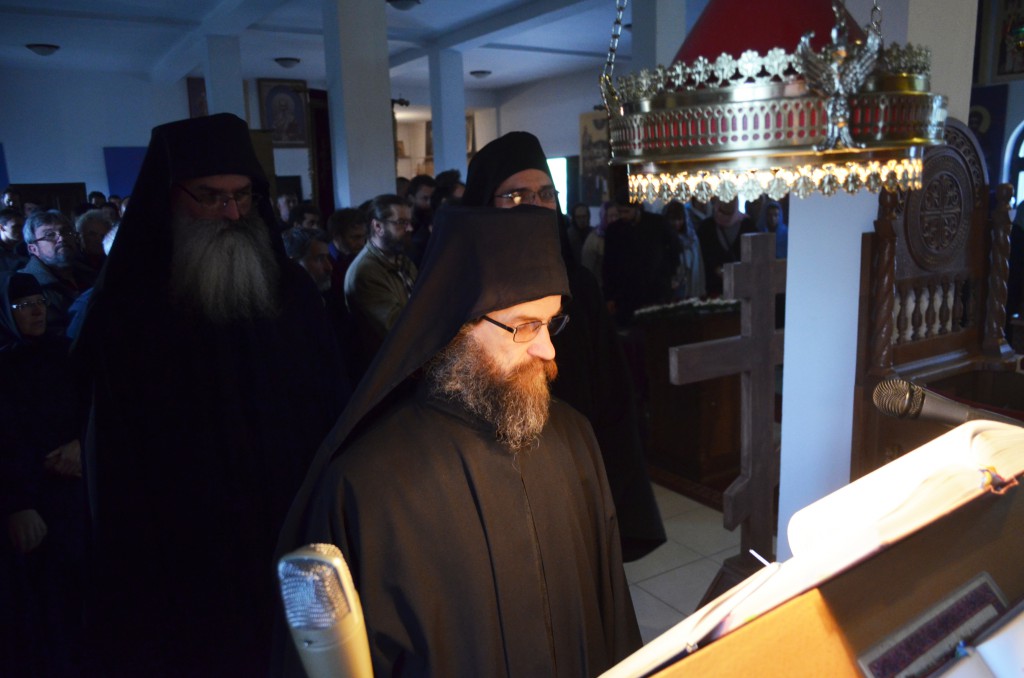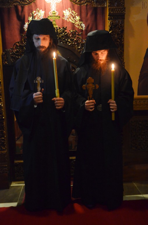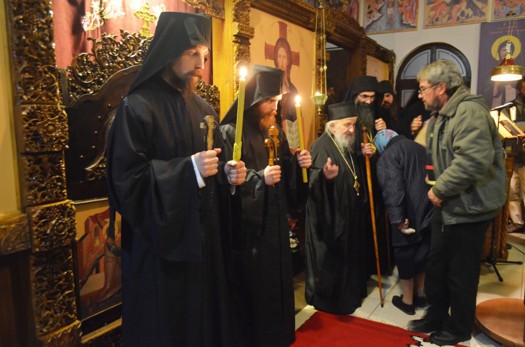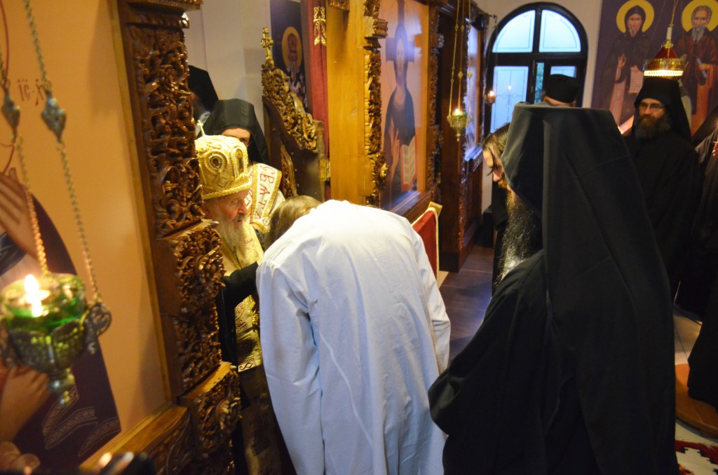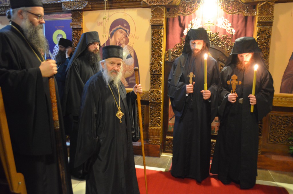 Након парастоса монаху Харитону, одслужено је Велико вечерње којим је началствовао архимандрит Варнава (Димитријевић). У току службе Епископ Артемије је замонашио у чин мале схиме искушенике Ивана (Арсеновића), сабрата манастира Светог Архангела Гаврила на Брезовици, и Душана (Морачанина), сабрата манастира Преподобног Јустина Ћелијског у Барајеву, давши им монашка имена Исидор (по Светом Исидору Пелусиоту) и Дионисије (по Светом Дионисију Ареопагиту). После чина монашења Владика Артемије се окупљеном монаштву и народу обратио пригодном беседом: