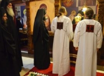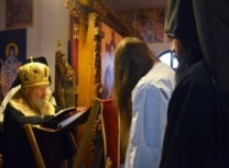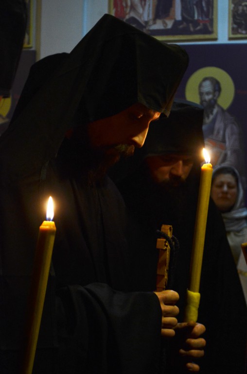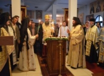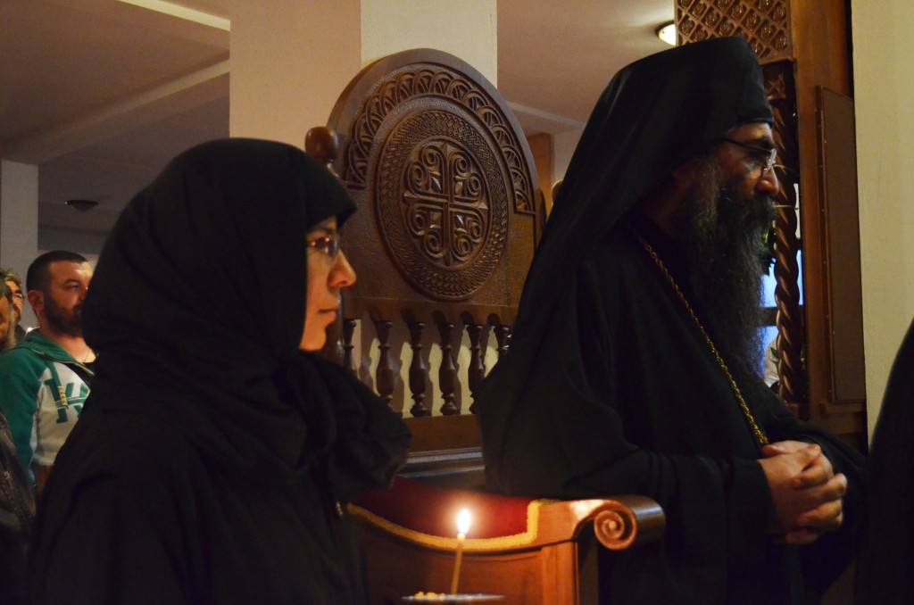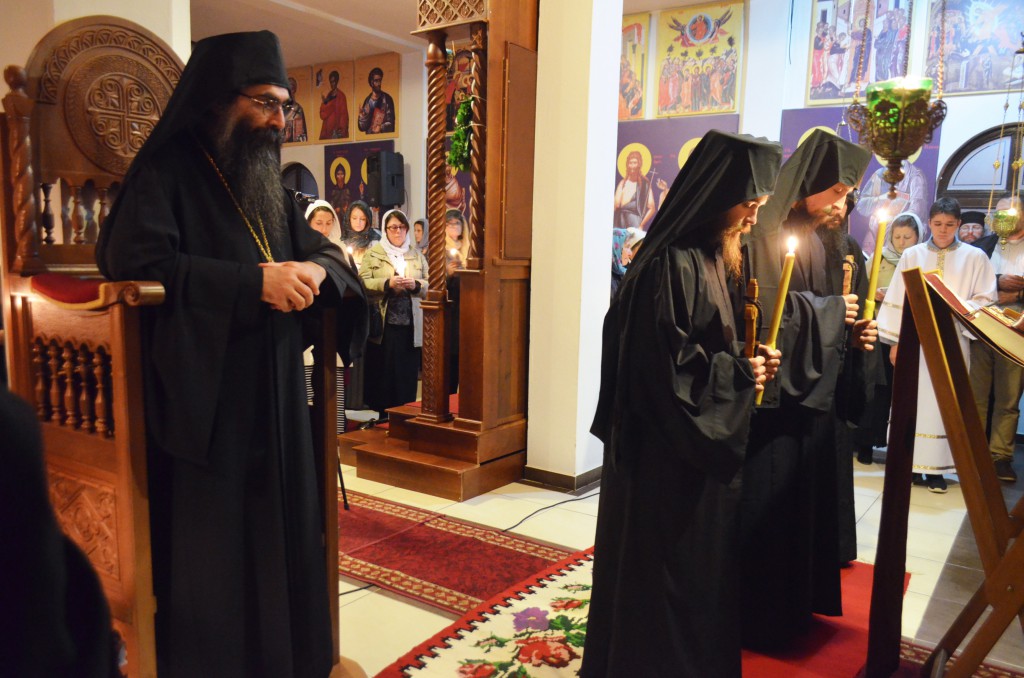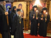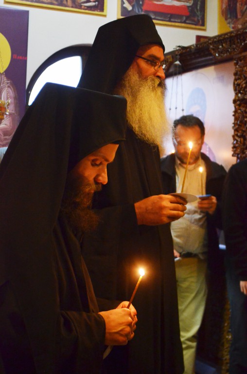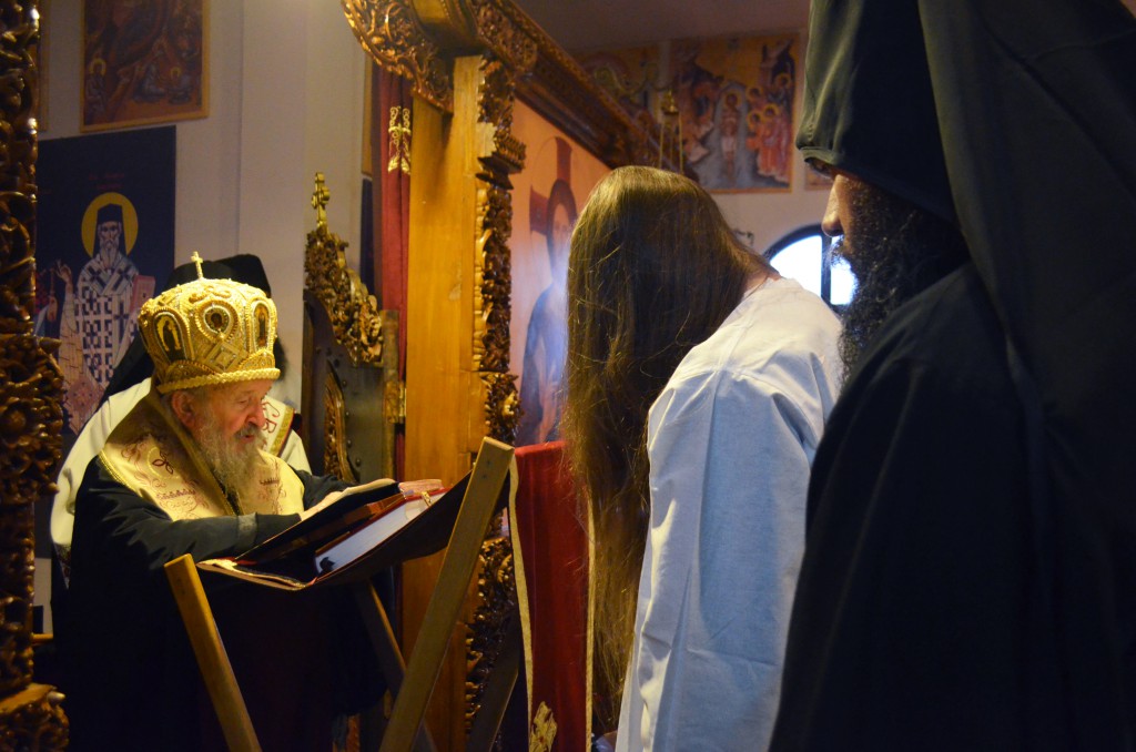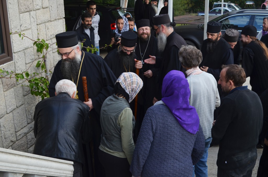 Након парастоса монаху Харитону, одслужено је Велико вечерње којим је началствовао архимандрит Варнава (Димитријевић). У току службе Епископ Артемије је замонашио у чин мале схиме искушенике Ивана (Арсеновића), сабрата манастира Светог Архангела Гаврила на Брезовици, и Душана (Морачанина), сабрата манастира Преподобног Јустина Ћелијског у Барајеву, давши им монашка имена Исидор (по Светом Исидору Пелусиоту) и Дионисије (по Светом Дионисију Ареопагиту). После чина монашења Владика Артемије се окупљеном монаштву и народу обратио пригодном беседом:
