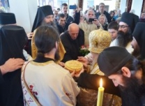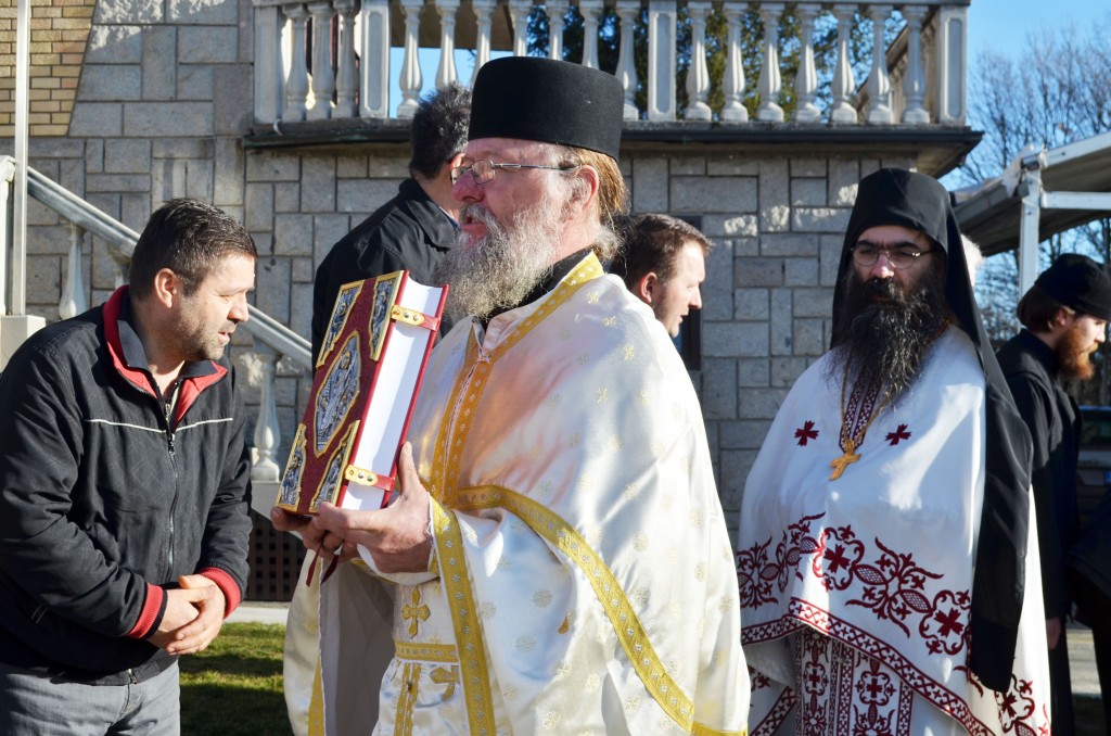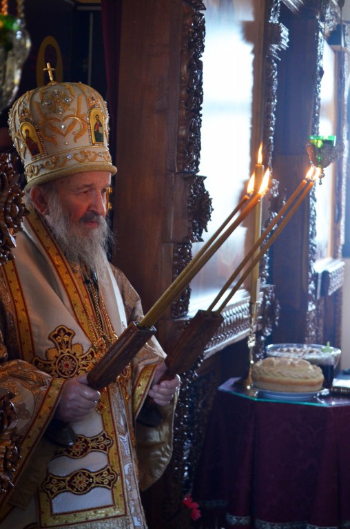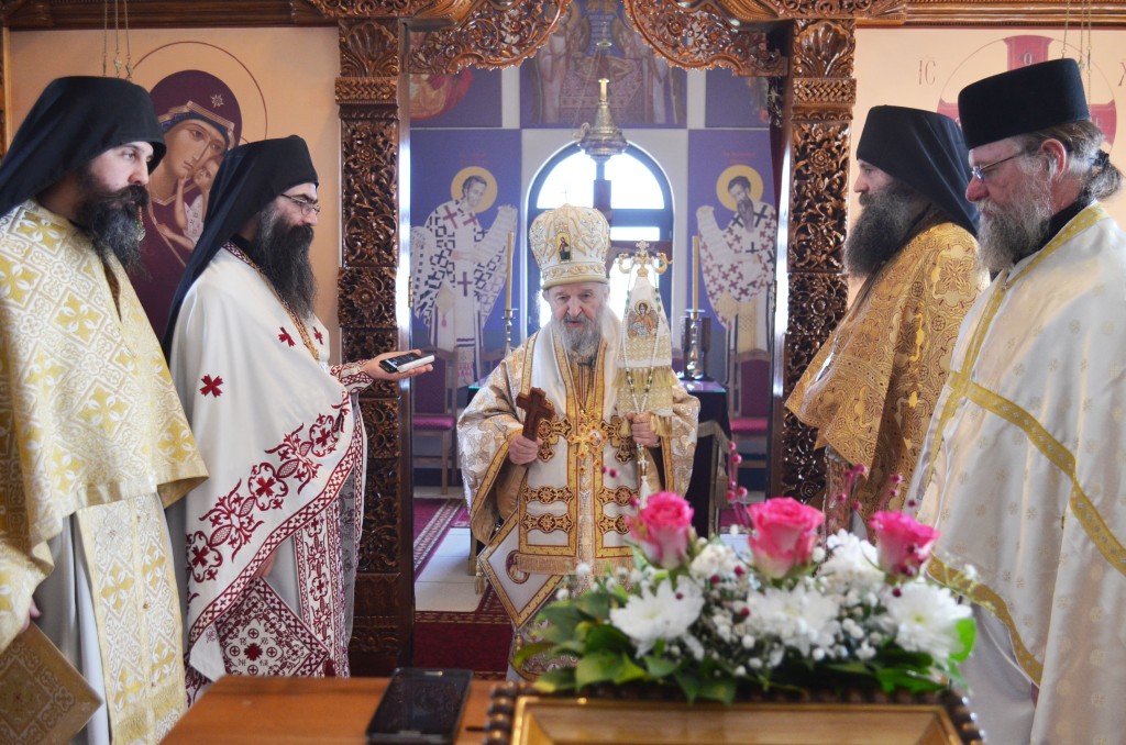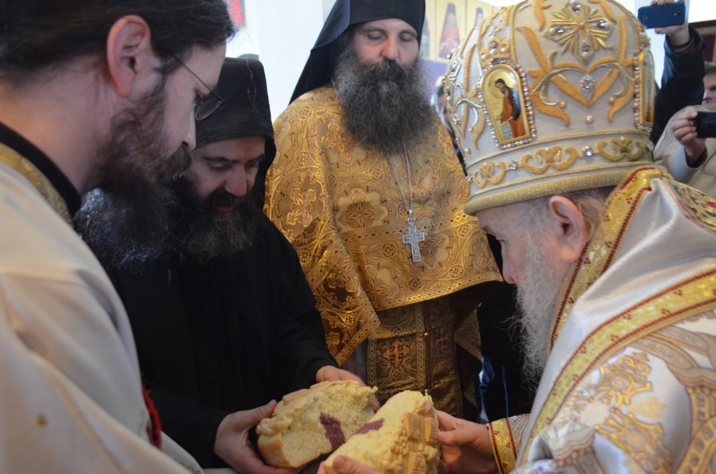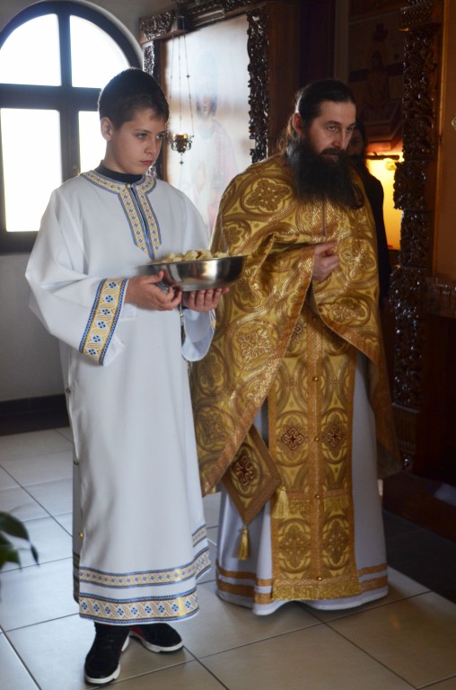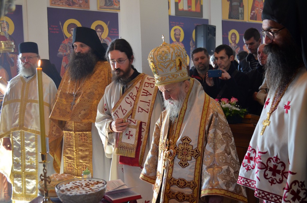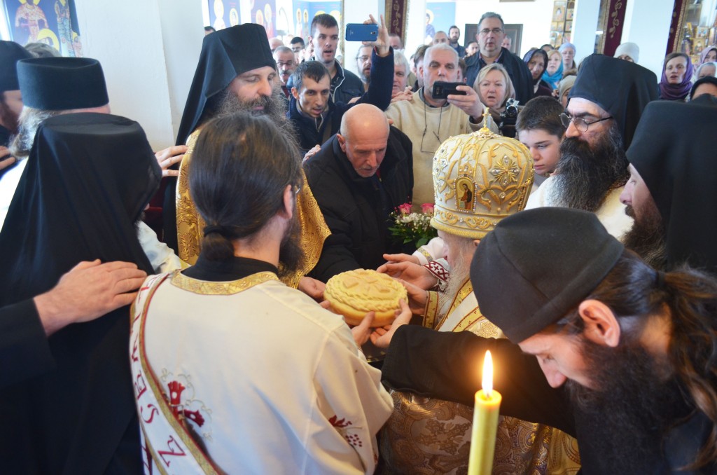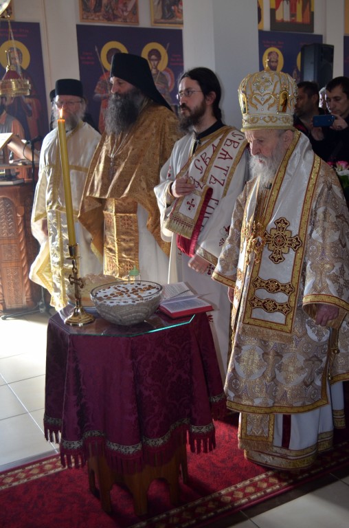После Свете Литургије Владика Артемије је обавио чин резања славског колача и благосиљања кољива које је у част Света Три Јерарха принео монах Василије, сабрат светојустиновског манастира, прослављајући на тај начин свој имендан.