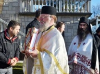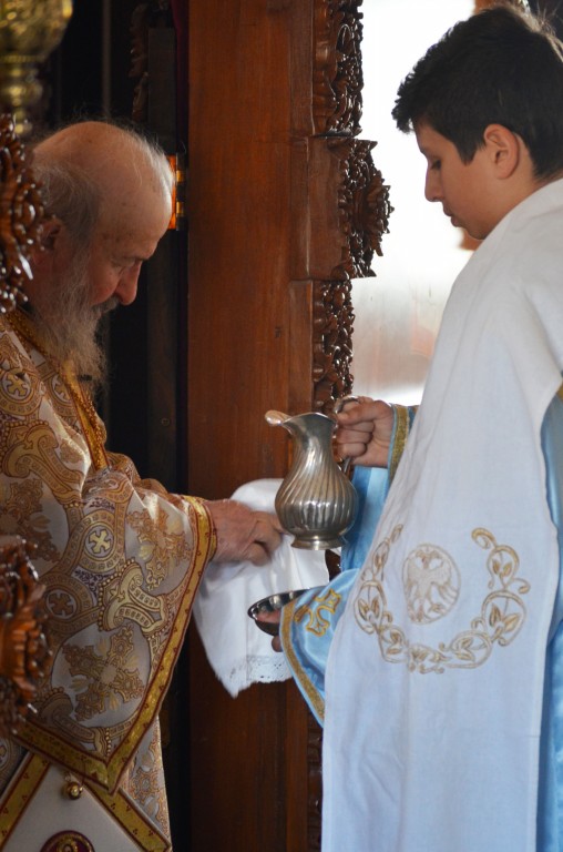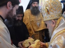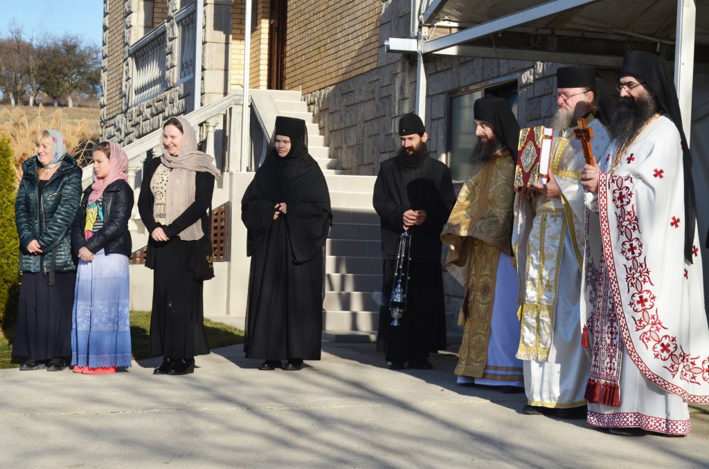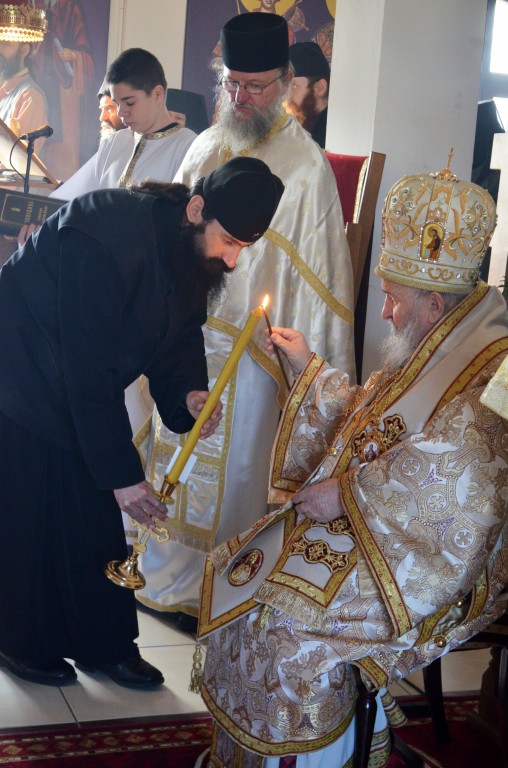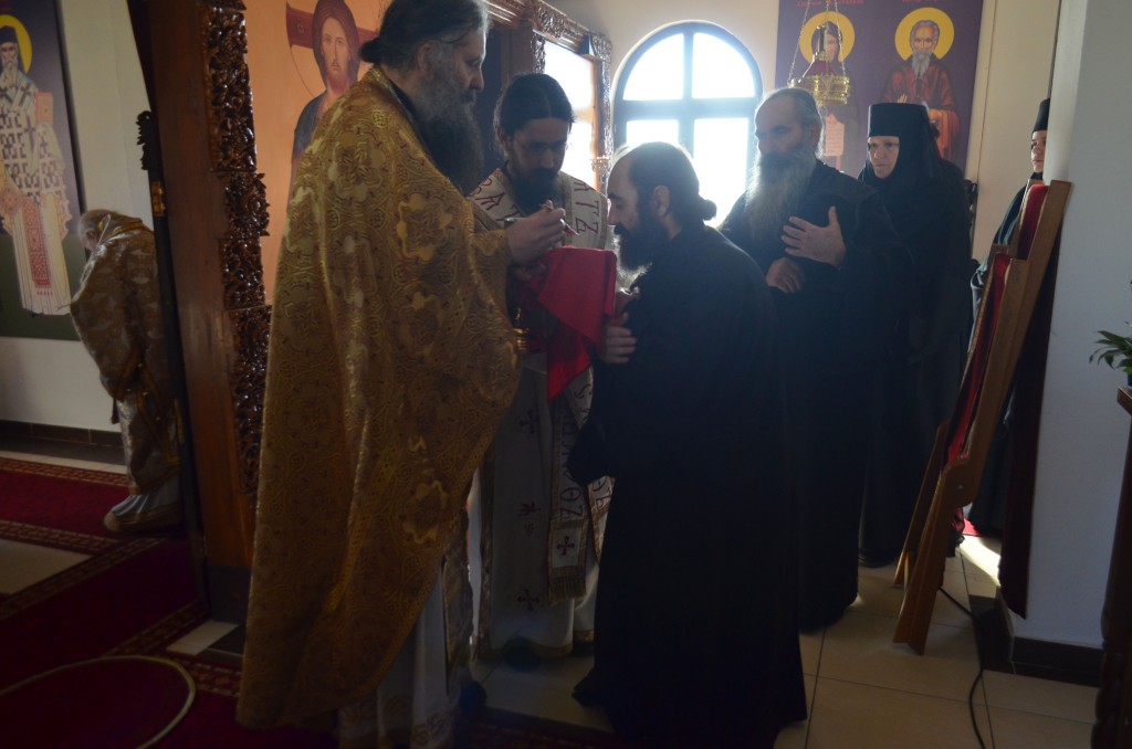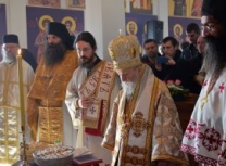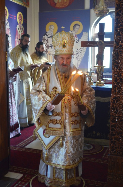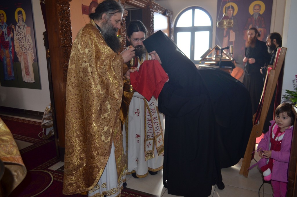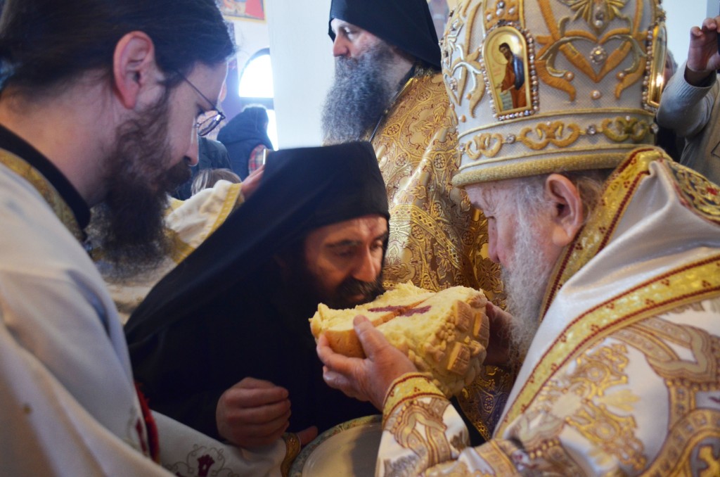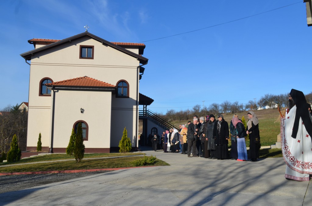 После Свете Литургије Владика Артемије је обавио чин резања славског колача и благосиљања кољива које је у част Света Три Јерарха принео монах Василије, сабрат светојустиновског манастира, прослављајући на тај начин свој имендан.
