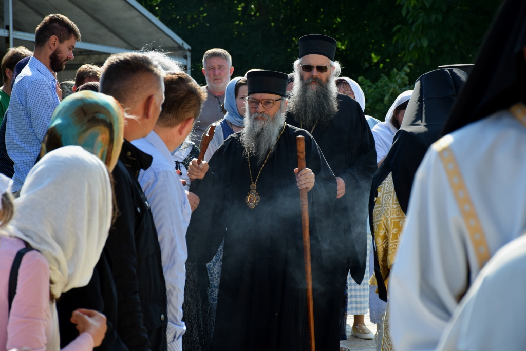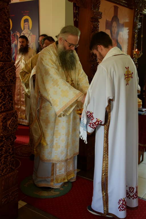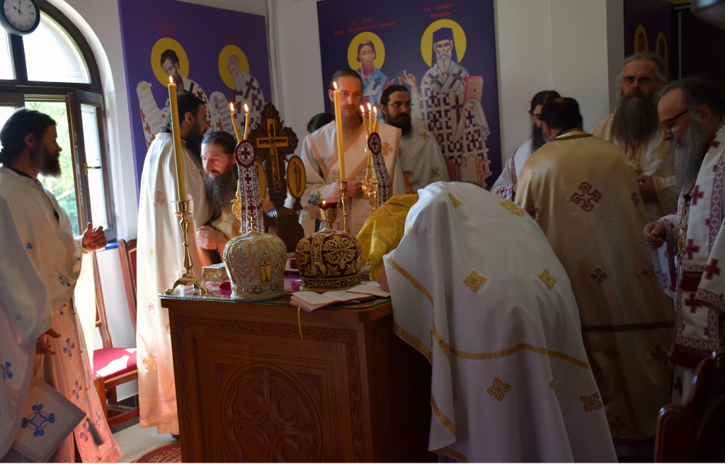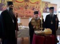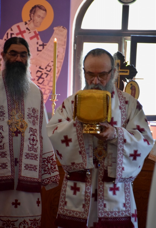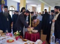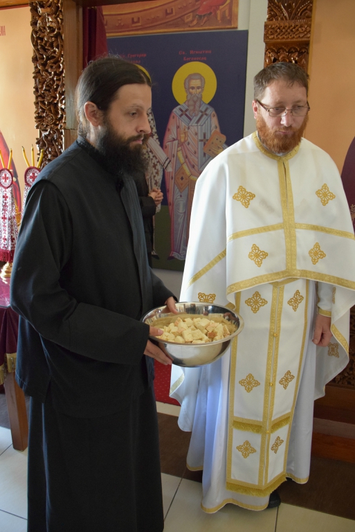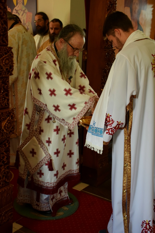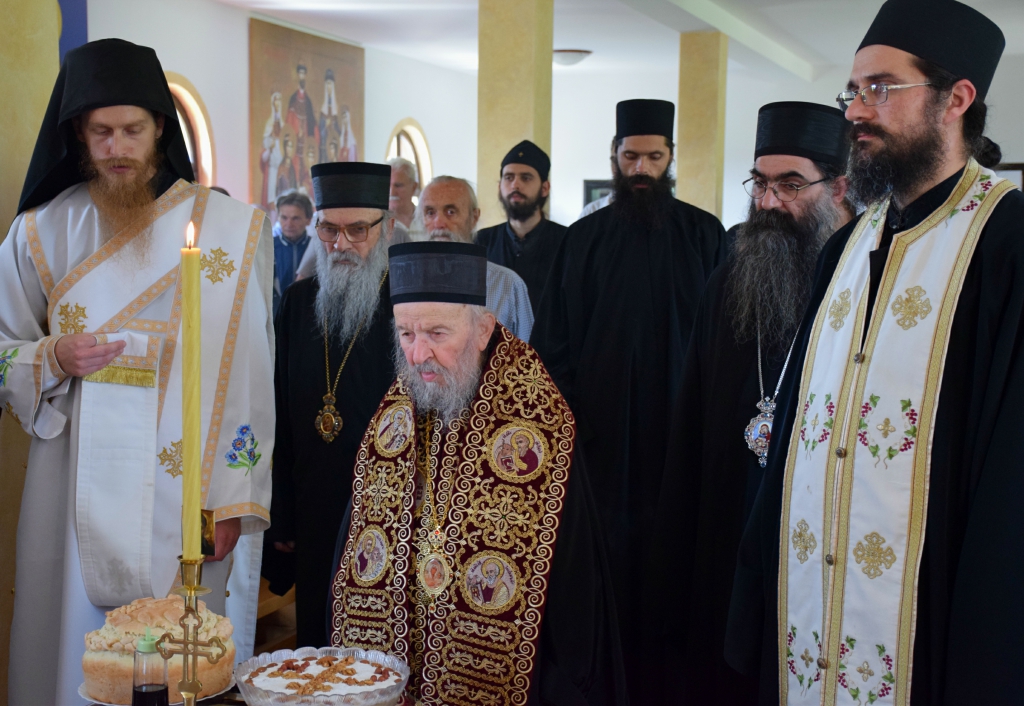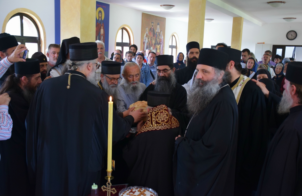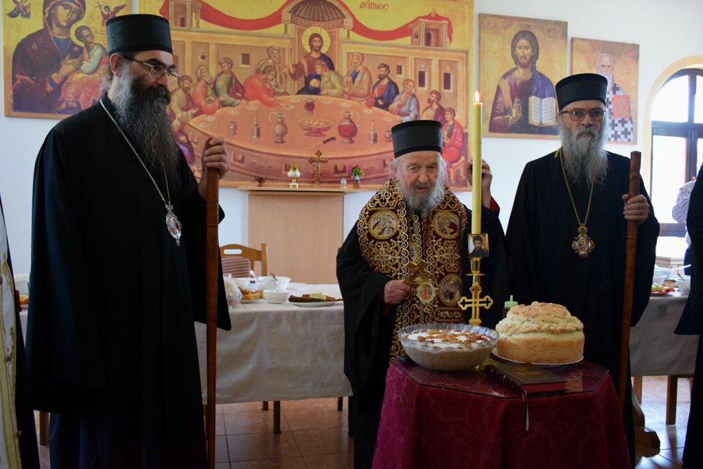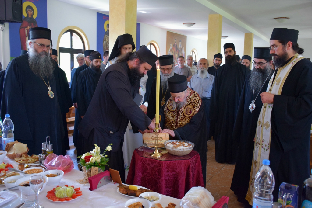 Након Свете Литургије, у манастирској трпезарији, Његово Преосвештенство Епископ рашко-призренски у егзилу Г.Г. Артемијe, обавио је чин резања славског колача и благосиљања жита које је у част Преподобног Наума Охридског принео Владика Наум.