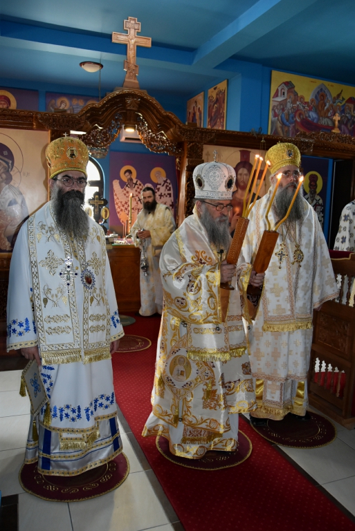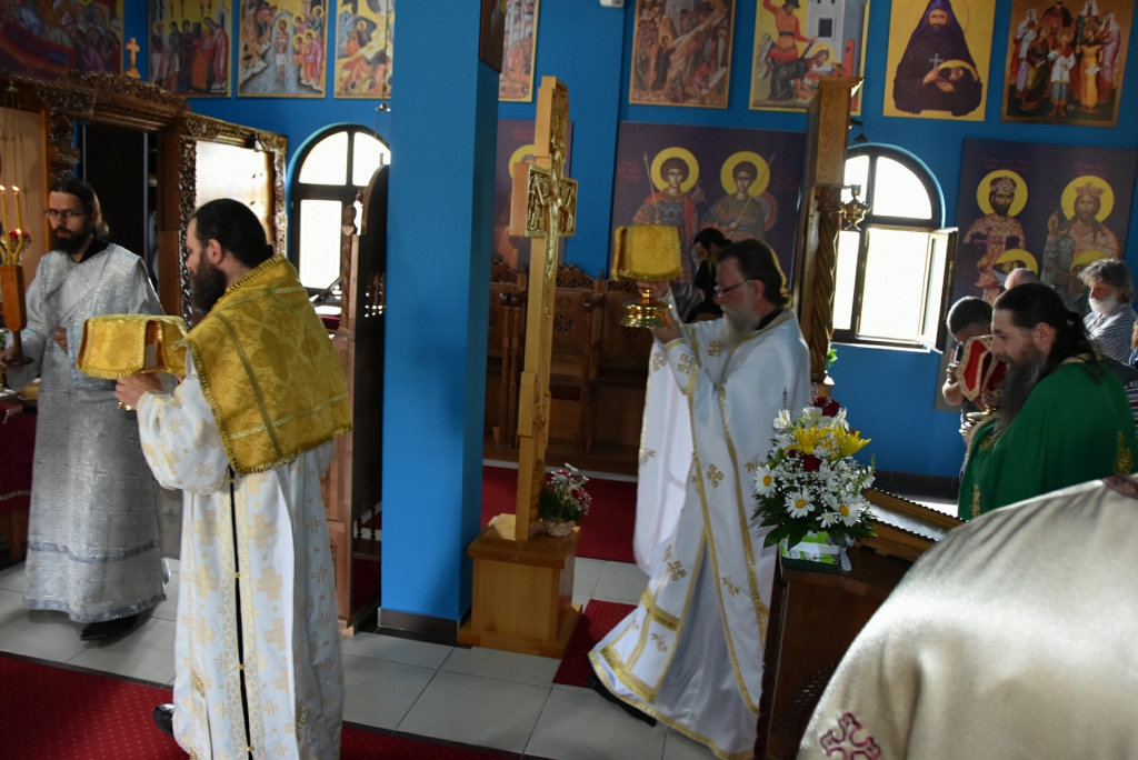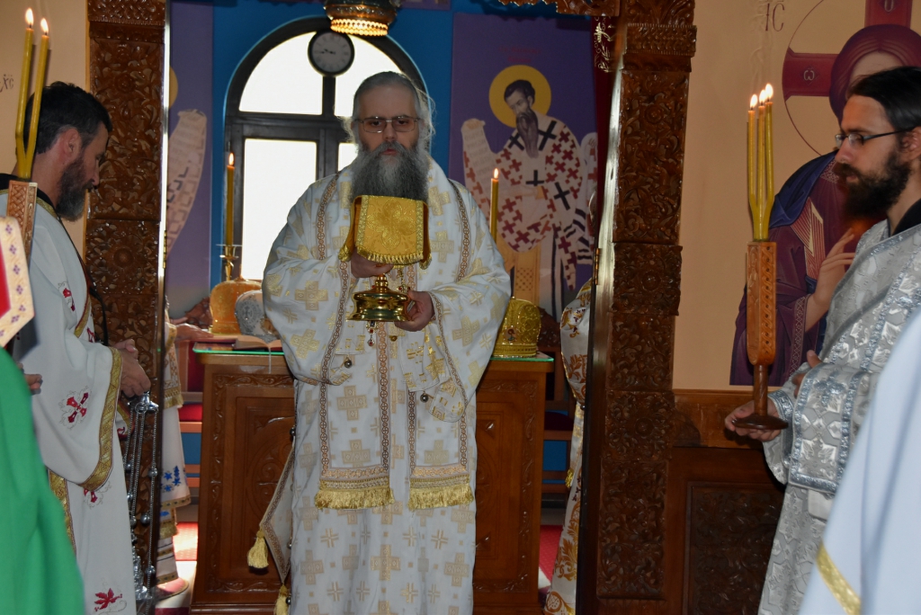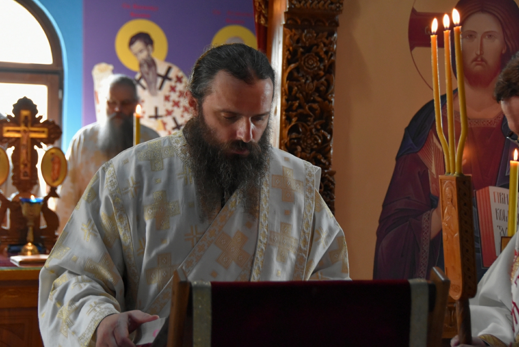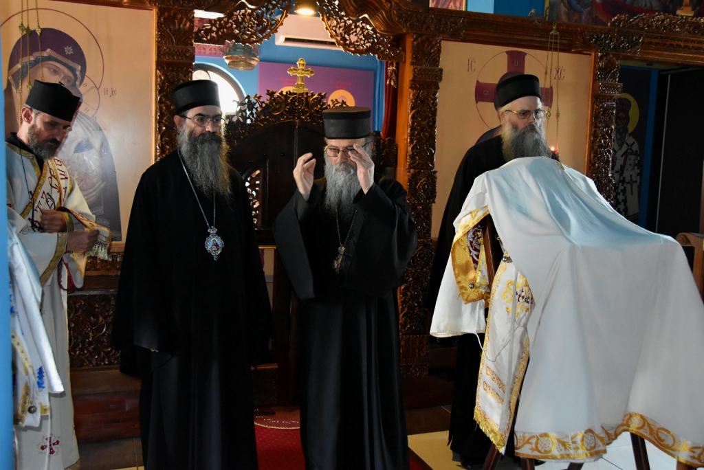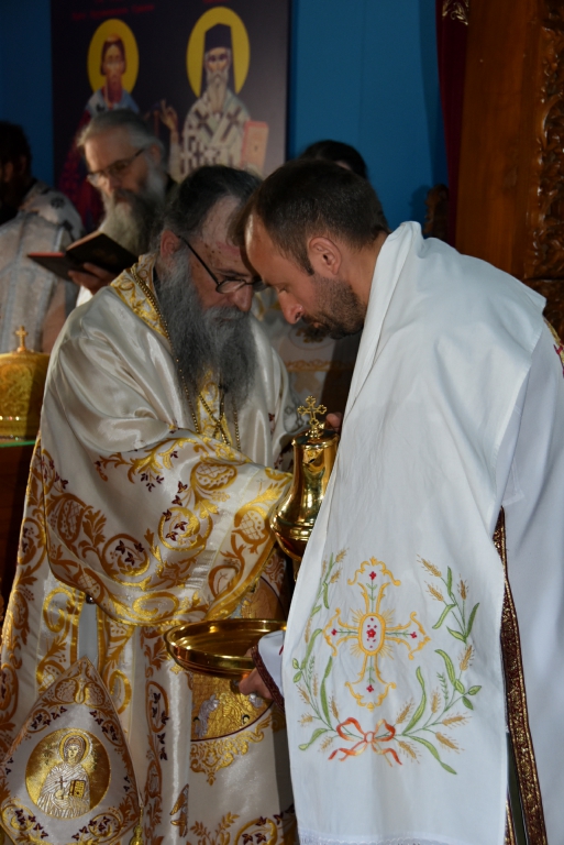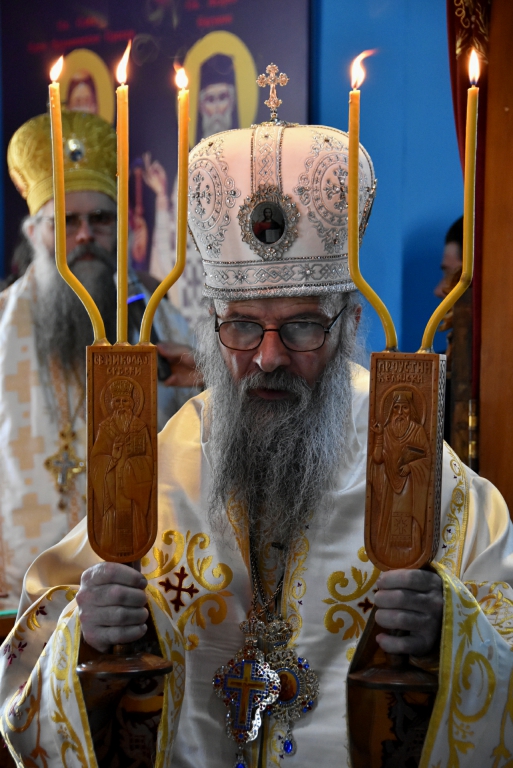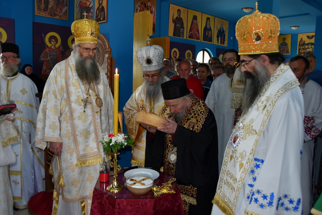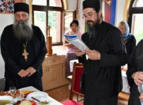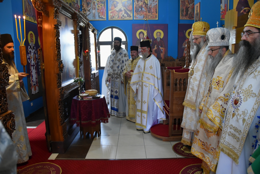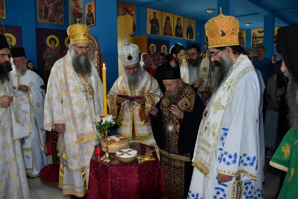 Након Свете Литургије, Његово Преосвештенство Епископ рашко-призренски у егзилу Г.Г. Артемијe, обавио је чин резања славског колача и благосиљања жита које је у част Преподобног Наума Охридског принео Владика Наум.