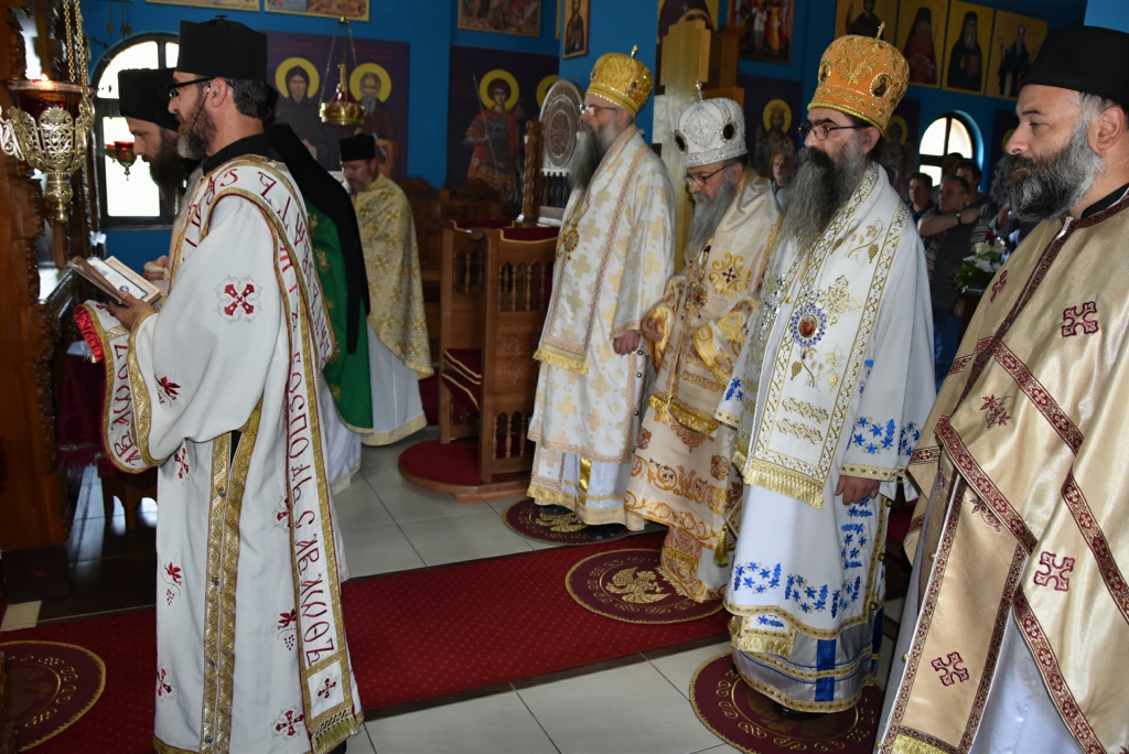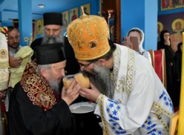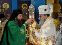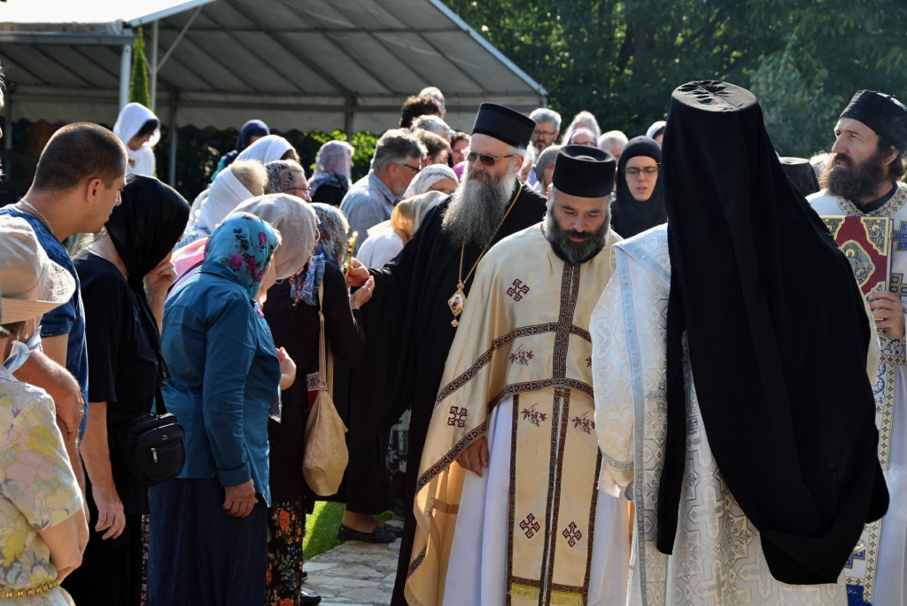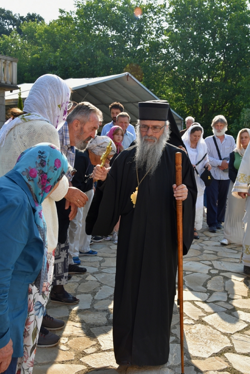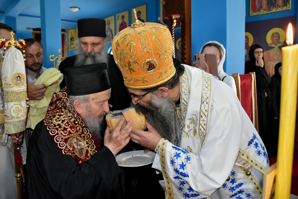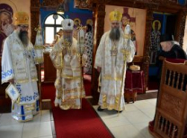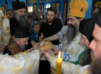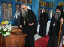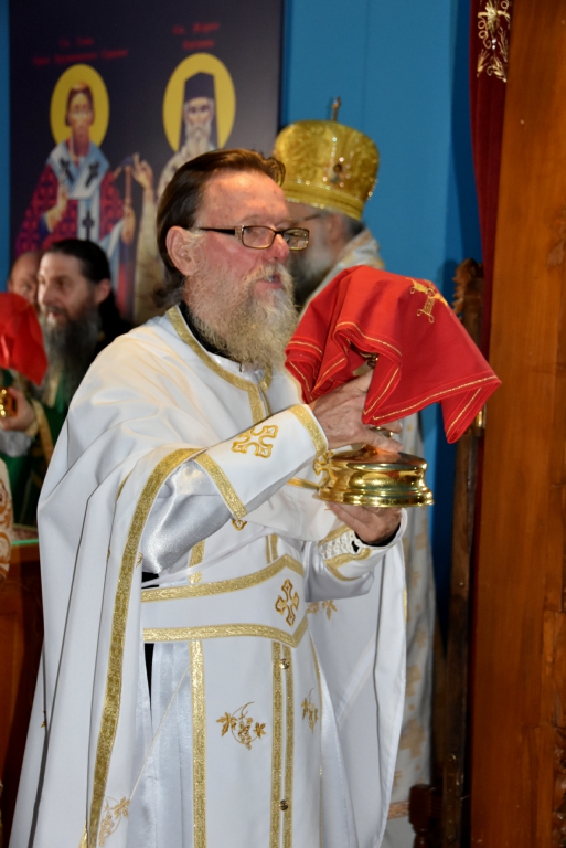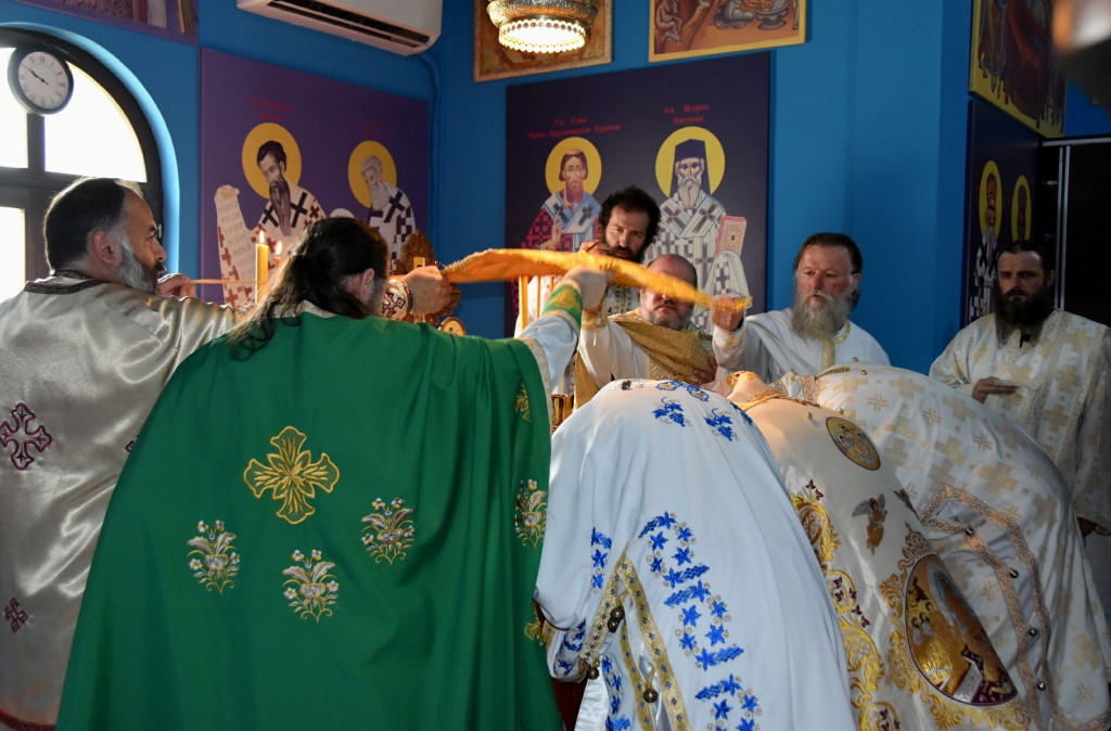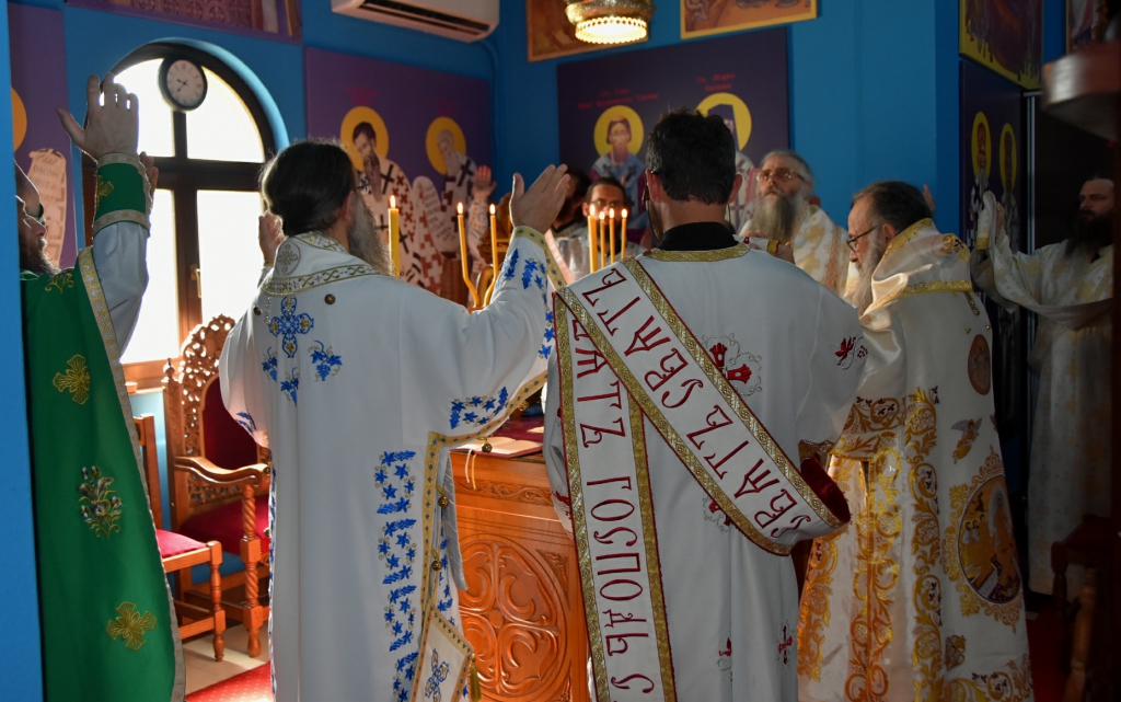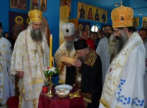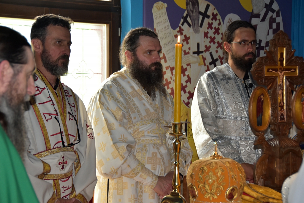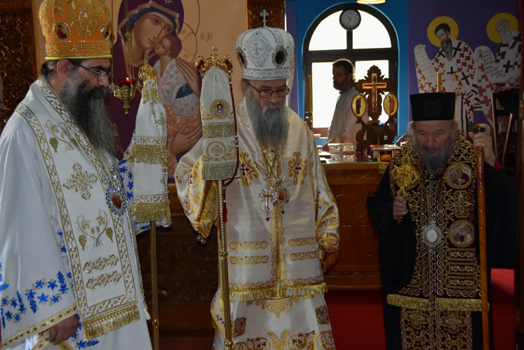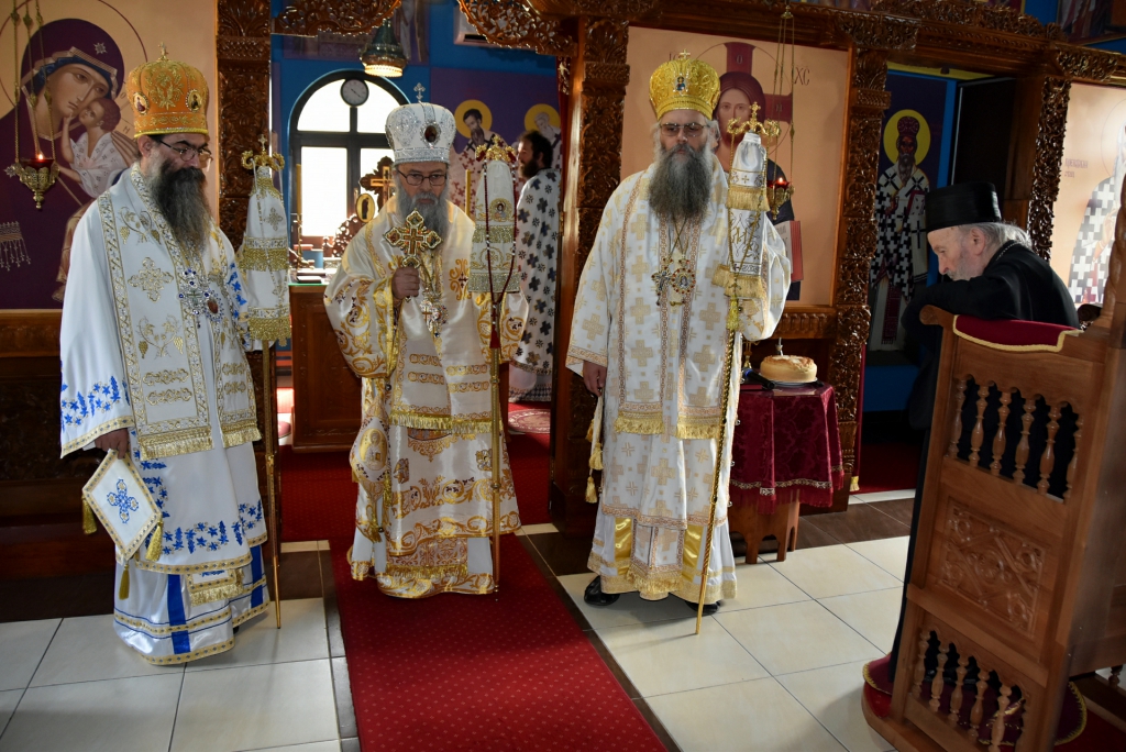 Након Свете Литургије, Његово Преосвештенство Епископ рашко-призренски у егзилу Г.Г. Артемијe, обавио је чин резања славског колача и благосиљања жита које је у част Преподобног Наума Охридског принео Владика Наум.