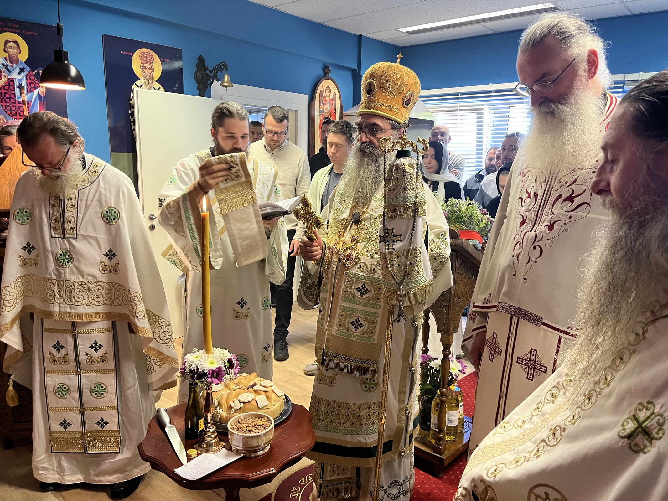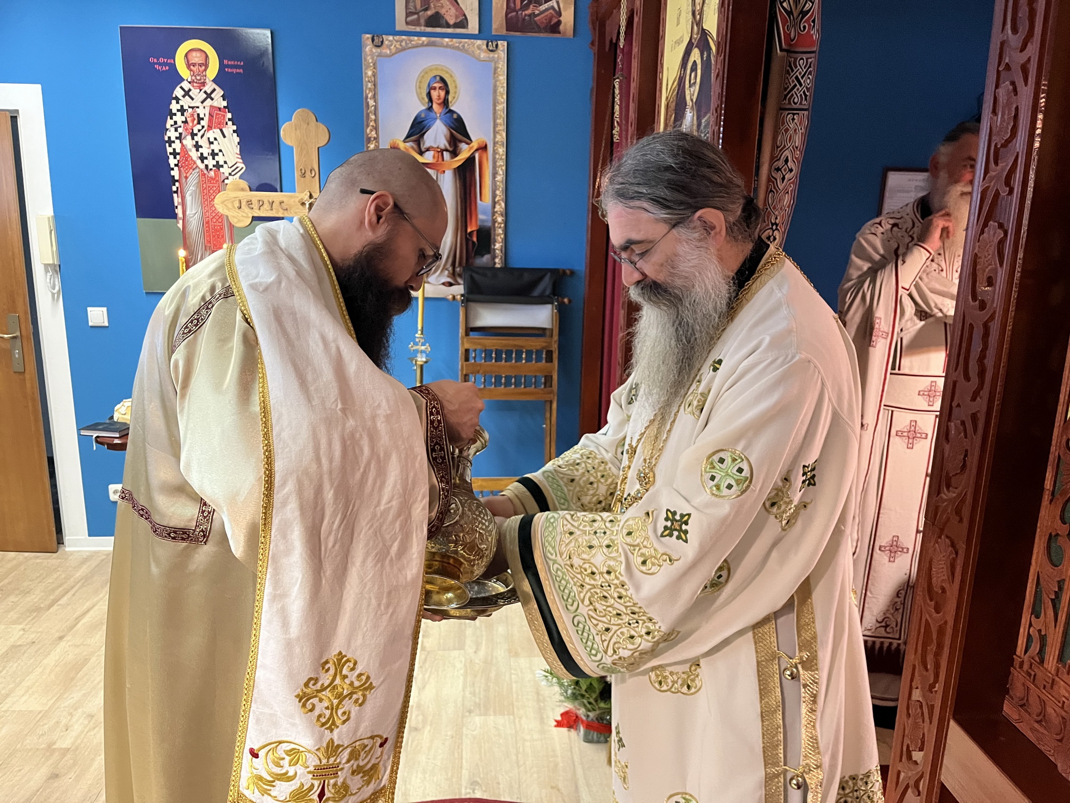 После Свете Литургије Владика Наум је извршио чин резања славског колача и благосиљања жита које су у славу и част Пресвете Богородице принели овогодишњи домаћини Александар Стојановић са породицом из Кобленца и Дарко Дубачкић из Офенбаха на Мајни. За следећу годину за домаћине су се пријавили Небојша Миловановић из Лангена и Александар Крстић из Франкфурта.