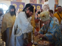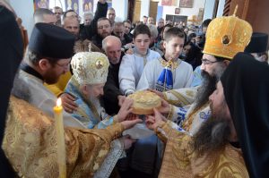 На крају Литургије, Владика Артемије је обавио чин резања славског колача и благосиљања жита које је манастирско братство принело у част светог оца нашег Саве.