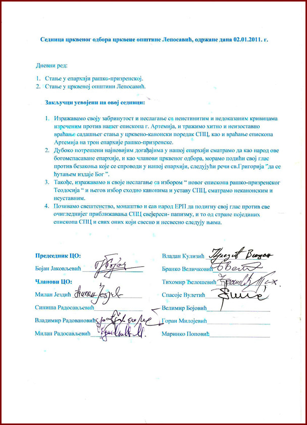 У прилогу вам достављамо закључке као и потписе Председника и чланова Црквеног Одбора са седнице Црквеног Одбора Црквене Општине Лепосавић, одржане дана 2.1.2011. године у Лепосавићу.