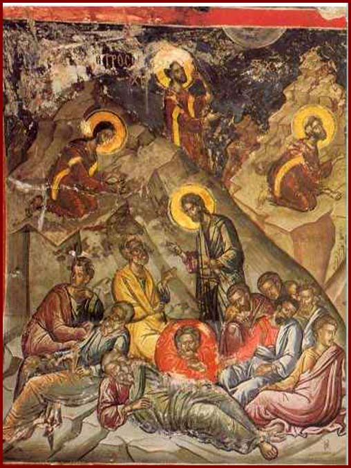 А ученици по вечери изађоше на гору Маслинску, у неко поље, које се зваше Гетсиманија. Пошто им много говораше, рече им Исус: сви ћете се ви саблазнити о мене ову ноћ. А Петар рече: ако и сви, ја се нећу Тебе одрећи, а беше касно, тојест дубока ноћ! А Исус рече: пре него што петао двапут запева, три пута ћеш ме се одрећи, као што је и било.