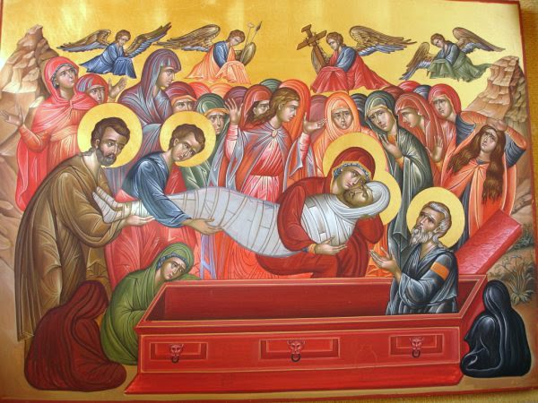 Но, Јосиф, скинувши, дакле, свето тело Господње, у гроб нови сахрањује, јер беше близу у врту, и камен врло велики на улазу гроба положи. А Јудејци по Петку, приступивши говоре Пилату: Господине, сетисмо се, да ова варалица рече, док још беше жив, после три дана устаћу. Сматрамо да би било добро да твоја власт нареди војницима да утврде гроб. Одговори Пилат: Ако је дакле варалица, што се бринете за његове речи?