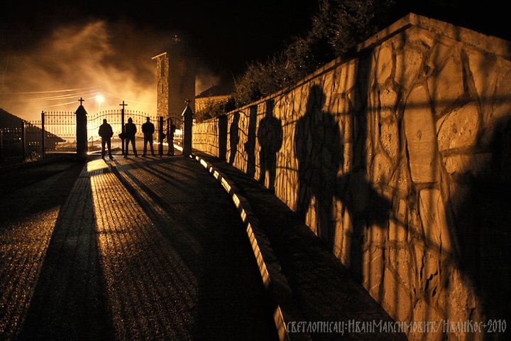 Чекамо, групица мештана Зубиног Потока и околине пред манастиром, монаси горе… Са оним пред капијом манастира, готово библијска сцена. Сам манастир на узвишењу, дрвени мост преко омање речице и осветљена црква са звоником на коме се вијори српска застава. Народ свестан своје физичке „немоћи“ али радостан, ведрог духа. Углавном се чују шале на рачун ситуације. Доле под капијом, униформисани полицајци са рукама на леђима, шетају лево десно, стража… од капије пут се даље спушта низ планину. Местимично, попут логорских ватри, назиру се светла од аутомобила. Сваки час пристижу возила. Низ кривудави пут, кроз грање, делују као бакље док прилазе. Слабо осветљене чете наоружаних војника корачају путем ка капији. Сијају бљештаве кациге, штитови се љуљају ритмом корака (специјалаца), чује се бат војничких чизама из мрака. Све их је више, гомилају се пред капијом…