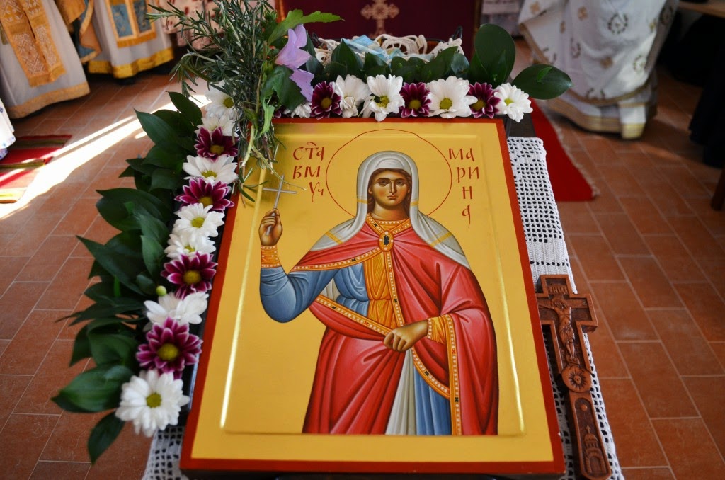 Огњена Марија, света мученица Марина, била је родом из Антиохије Писидијске, од родитеља незнабожачких. Тек у 12. својој години чу Марина за Господа Исуса Христа, како се ваплоти од Пречисте Дjеве, како чудеса многа сотвори, крсну смрт прими и славно васкрсе. Њено младо срце распали се љубављу према Господу, и она се заветоваше никад се не удавати, и још жељаше свом душом пострадати за Христа и крстити се у крви мучеништва. Њен отац омрзну је због вере њене и не сматраше је ћерком. Намесник царски, Олимврије, сазнавши од Марине да је она хришћанка, пожели од ње најпре да му буде жена.