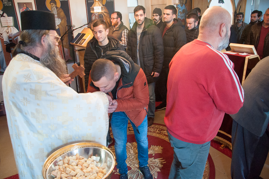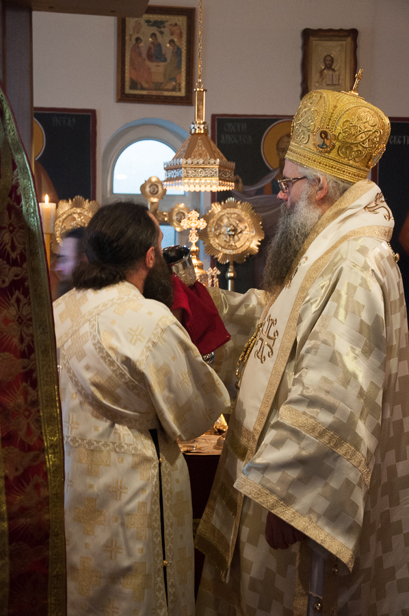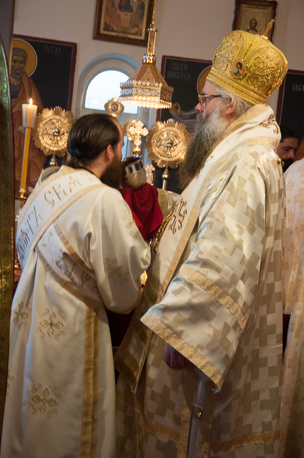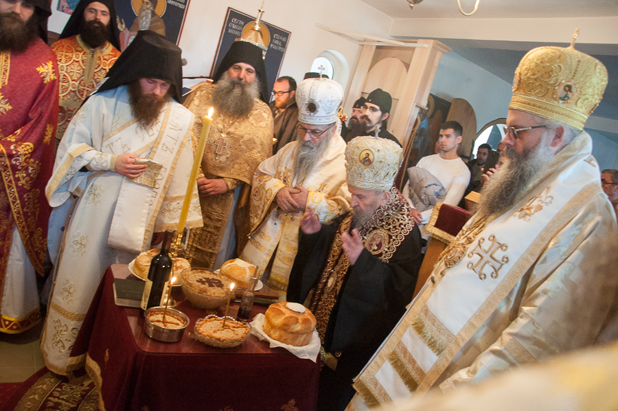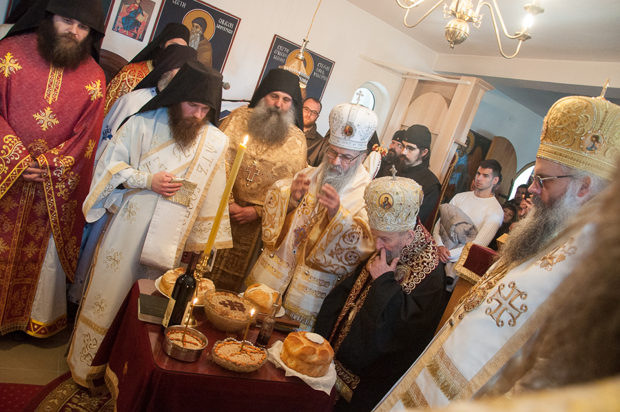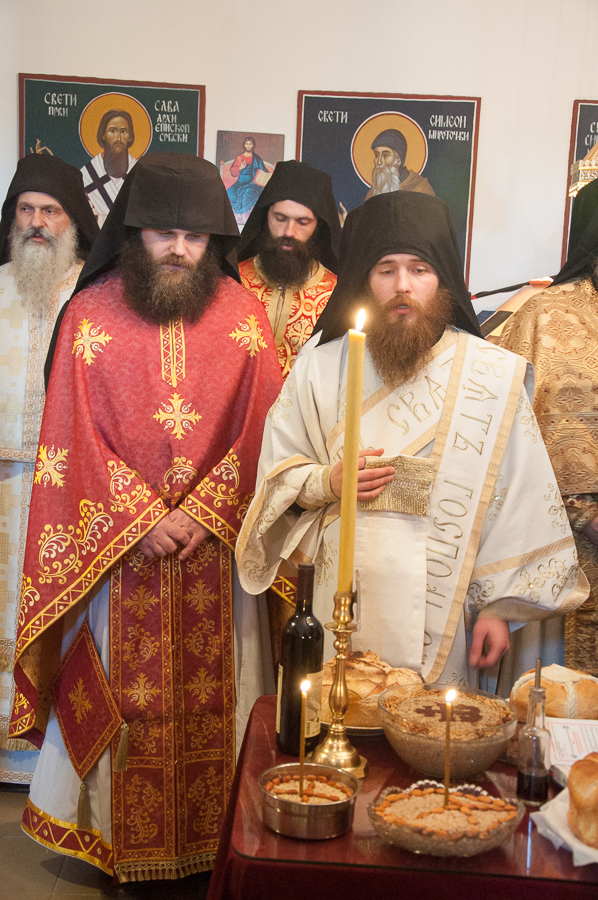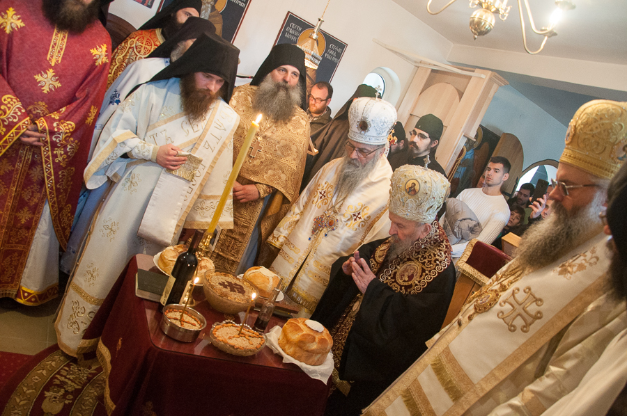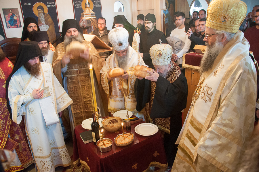 Након Свете Литургије Владика Артемијe је обавио чин резања славског колача и благосиљања жита које је у част Преподобног Максима Исповедника принео Владика Максим.