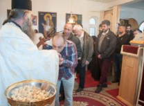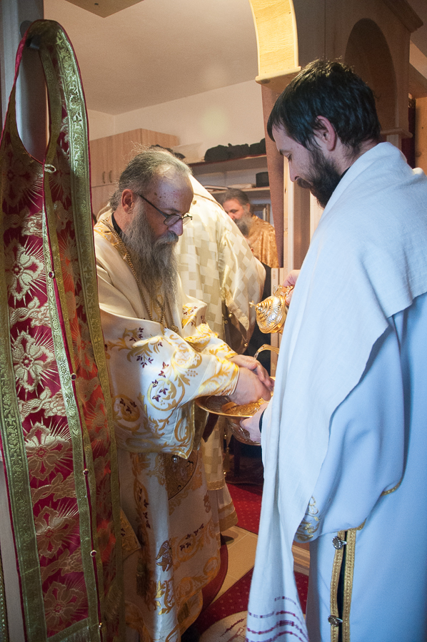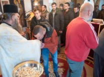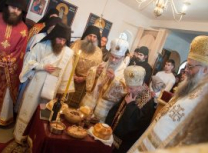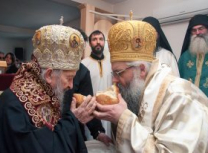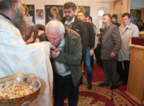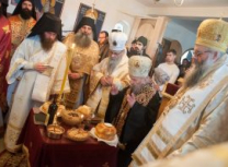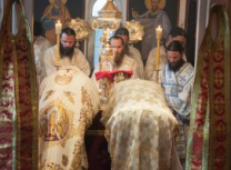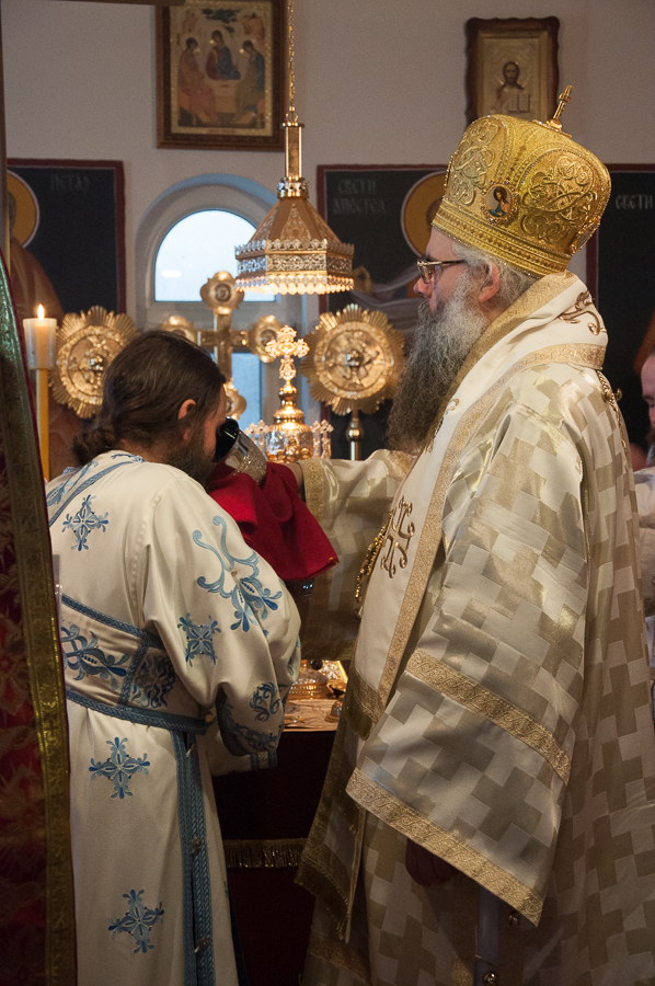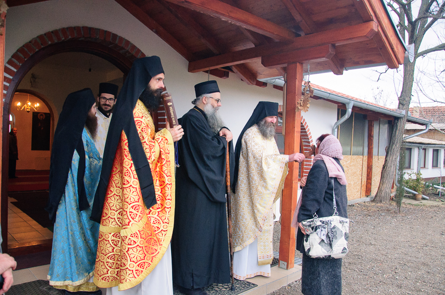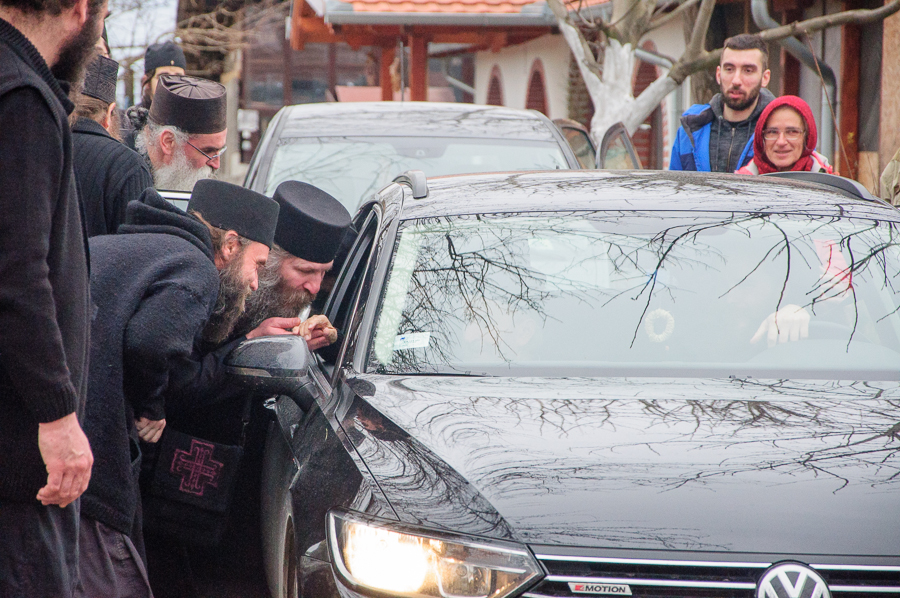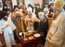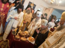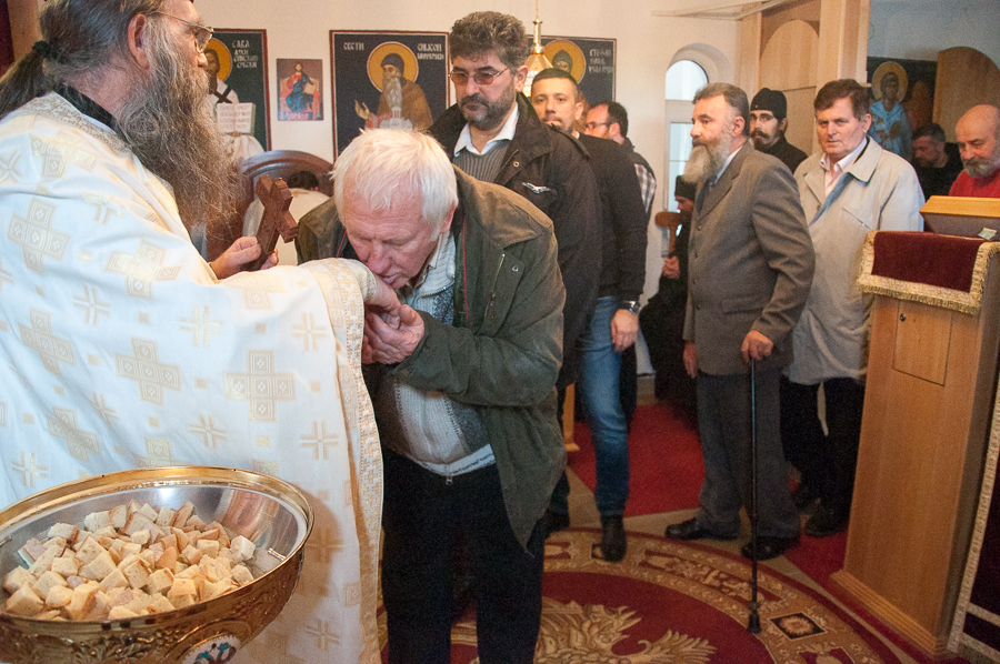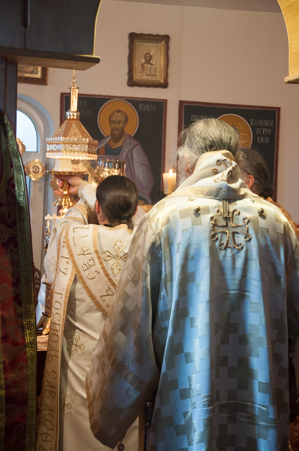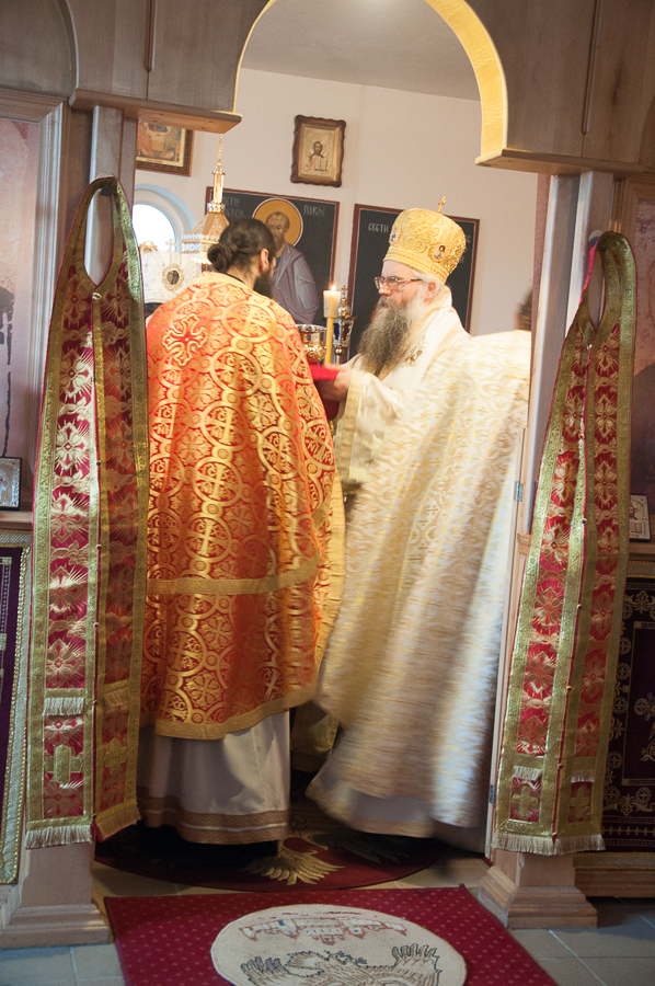 Након Свете Литургије Владика Артемијe је обавио чин резања славског колача и благосиљања жита које је у част Преподобног Максима Исповедника принео Владика Максим.