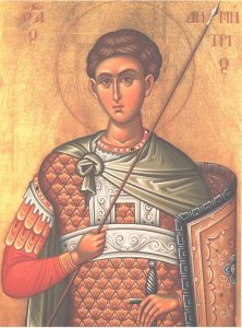 Свети великомученик Димитрије рођен је у Солуну. Овај славни и чудотворни светитељ био је једино дете добрих и благородних, али бездетних родитеља. Измољен од Бога, као једини и дуго чекани, с великом пажњом је однегован и васпитаван. Отац му је био војвода, а кад је он умро, христоборни цар Максимијан поставио је Димитрија уместо оца за солунског војводу, и том приликом му рече: Чувај отачаство своје, и очисти га од безбожних хришћана и убиј свакога који призива име Распетога… Димитрије се, примивши се тог положаја, трудио да на сваки начин помогне хришћанском живљу. Неко време успевао је тајно то да ради; међутим, како то није могао сакрити, он поче јавно да штити хришћане и да народ одвраћа од многобоштва и упућује их на Христов пут. Када је цар сазнао за дела Димитријева, разгневи се и одлучи да сам то провери. Једном враћајући се из рата са Самаритима цар посети Солун и одмах стаде проверавати да ли је истина оно што је чуо о Димитрију.