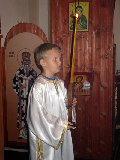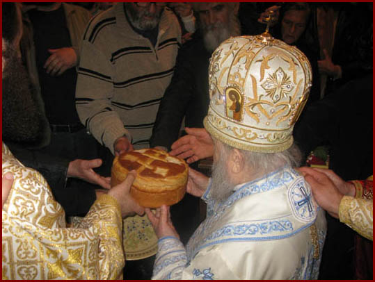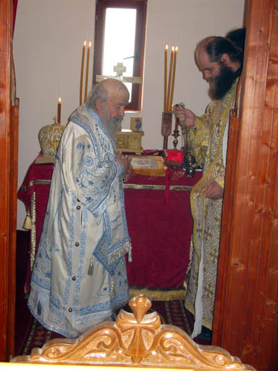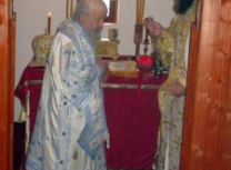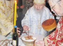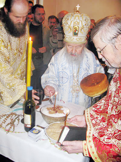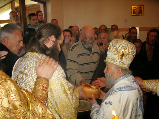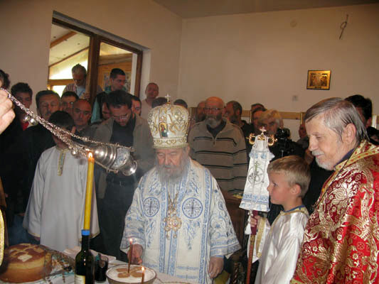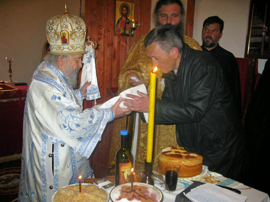 Владика је извршио чин сечења славског колача и благосиљања кољива, које су припремили домаћини славе отац Небојша и Стојан Јанковић из Смедерева.