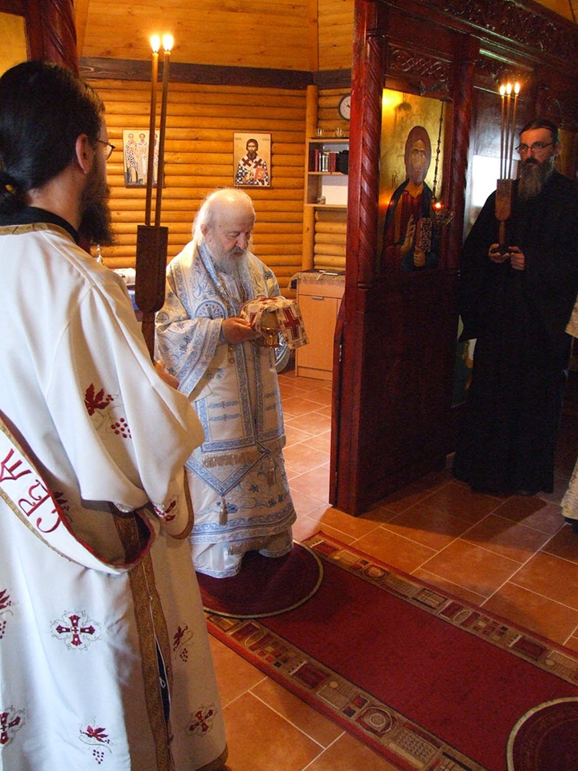 Епископ Артемије је извршио чин сечења славског колача и благосиљања кољива, које су поред настојатеља протосинђела Романа, припремили и овогодишњи домаћини славе.