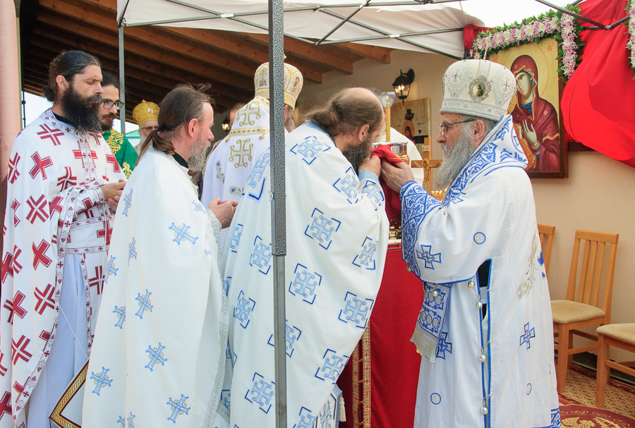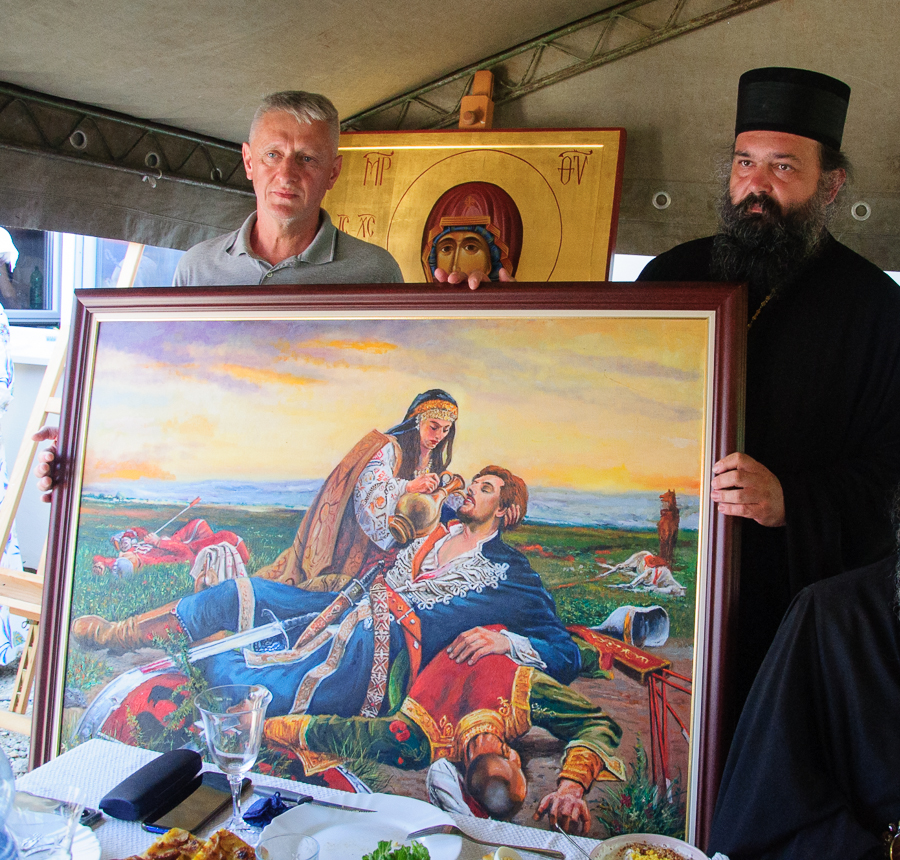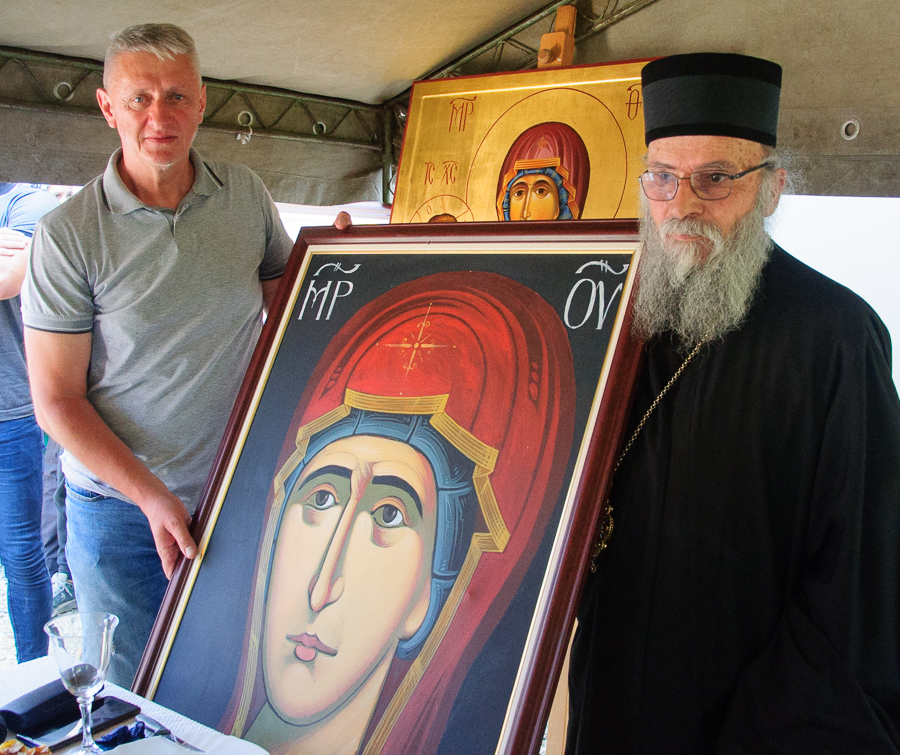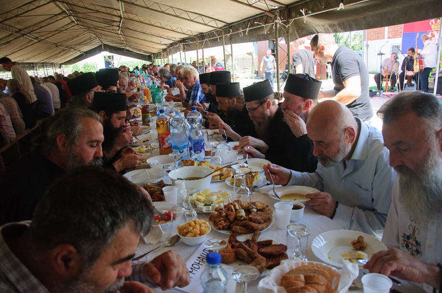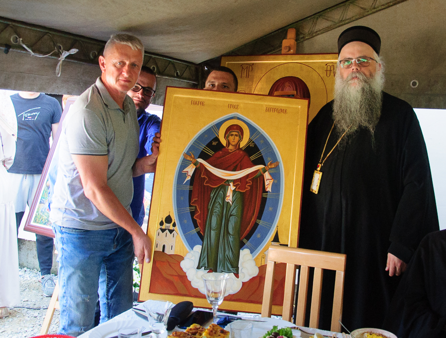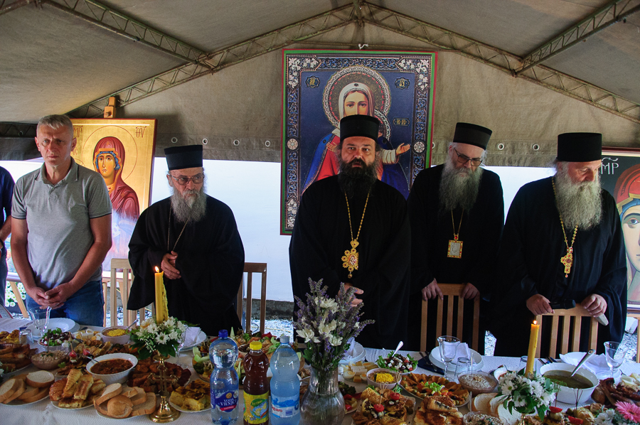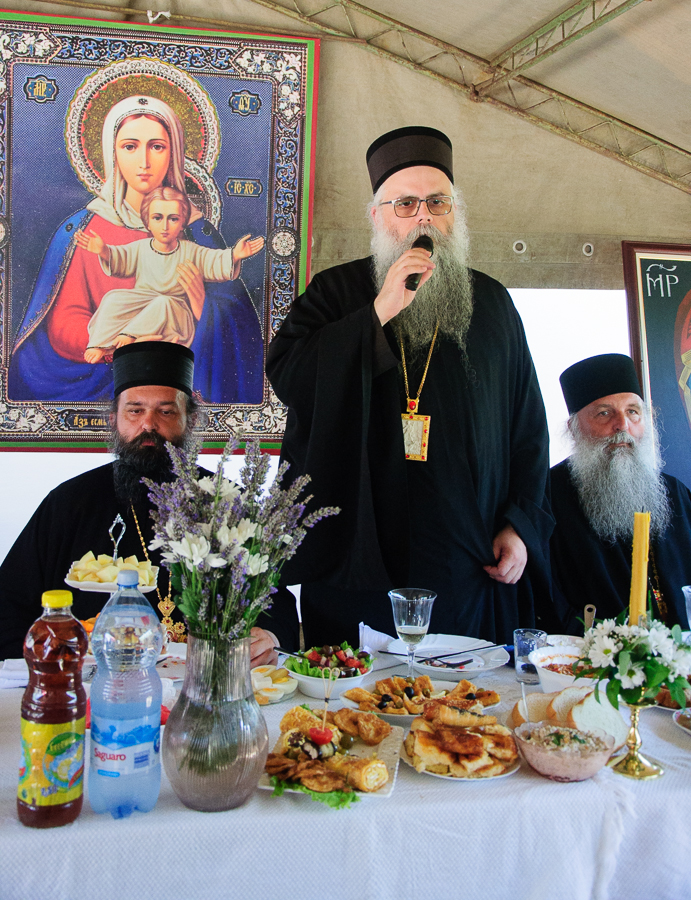 Након Литургије сви присутни су се укрепили на трпези љубави коју су припремили братство манастира и домаћини славе. Присутнима су се том приликом пригодним беседама обратили Владика Максим и ктитор манастира Милан Рељић и том приликом у своје и име своје породице даривао преосвећене Владике Ксенофонта, Николаја и Максима иконама Пресвете Богородице и копијом чувене слике „Косовке девојка“, а сам манастир је даривао иконом Богородице Тројеручице у ком ће на даље почивати на утеху и радост свима вернима.
