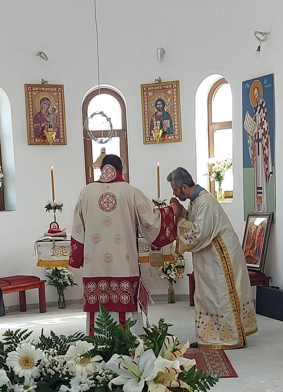 Другог дана Васкрса, на Васкрсни понедељак, Његово Преосвештенство Епископ рашко-призренски у егзилу Г.Г. Ксенофонт служио је свету Архијерејску Литургију у манастиру Светог Преображења Господњег у Леушићима. Литургији је присуствовало око 60 верника.