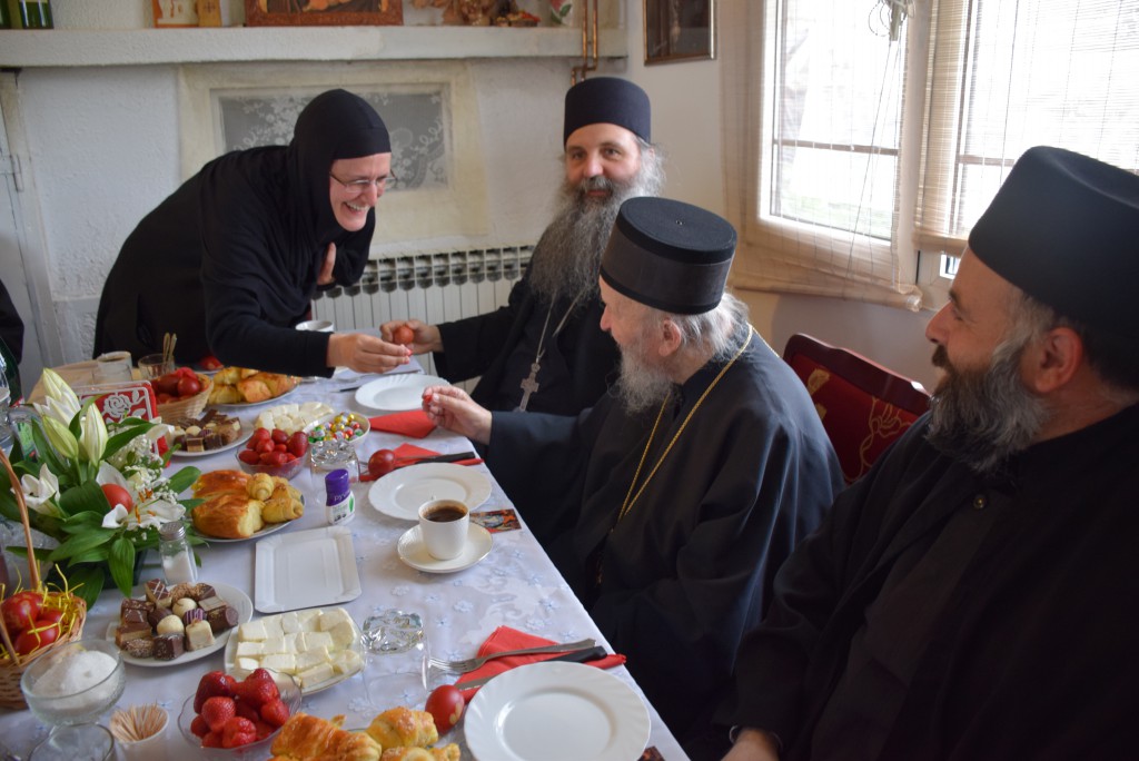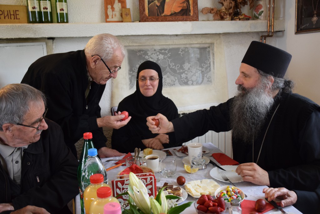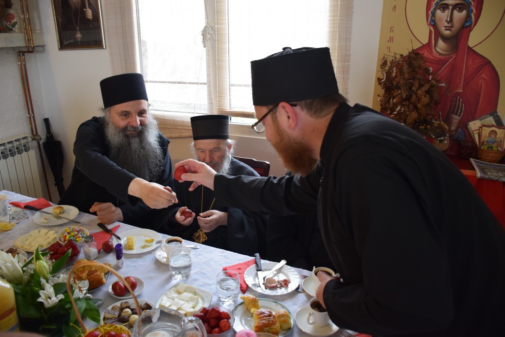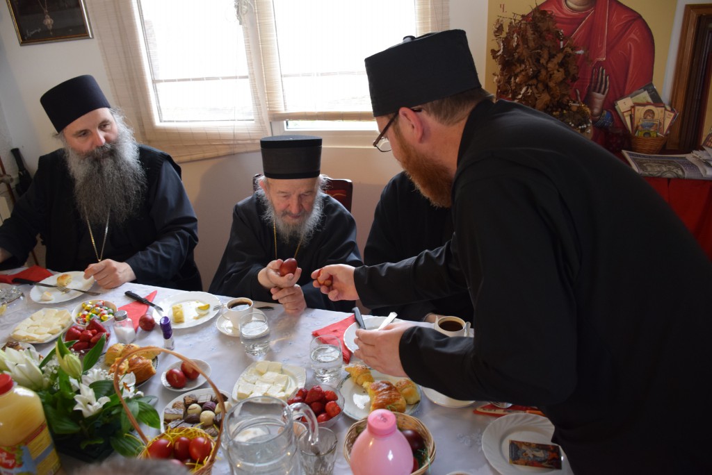 “Господ је пострадао, јер је дошао да узме грехе света на себе безгрешног, да пострада за све људе да би све људе искупио од страдања, да би људе ослободио од троглаве аждаје – греха, смрти и ђавола. Јер иза свакога греха се крије ђаво и сваки грех води у смрт. Тако је речено Адаму још у Рају да не једе плод са једнога дрвета: „Ако будеш јео умрећеш.“ Адам чуо, па заборавио, превари га змија, превари га Ева, његова супруга. И тако је он тада умро не телом, али духом, јер се био одвојио од Бога. А живот људи је у Богу и са Богом. Господ пострадавши за нас људе, распет је на крсту, погребен у гроб. Кад су људи мислили да је све завршено, Он је устао из гроба трећи дан, васкрсао у слави. Родило се сунце правде после мркле и дуге ноћи незнања и неправде. И тако је људима показао да је Он заиста истинити и прави Бог који је дошао на земљу ради нас људи и ради нашега спасења. Показао је и шта је човек. Прави човек је човек без греха или бар човек који се бори са гресима, који не робује гресима. Зато је пред славно Васкрсење Његово, света Црква одредила пост од седам недеља да се појачаном молитвом, појачаним постом, светом тајном Покајања и Исповести и светом тајном Причешћа да се припремимо као људи и да Господа Васкрслога сретнемо очишћени душом и телом, да би се могли Његовом васкрсењу и ми радовати као што се радује небо и земља и преисподња, као што каже црквена песма. Тако да, ето, ми смо се припремали, дочекали смо Његово славно васкрсење – радујемо се. Господ је донео радост не само за један дан. У овој песми каже се: „Ово је дан којега створи Господ да се радујемо и веселимо у Њему.“ Када каже ово је дан тај, то није овај дан астрономски, један дан па заборавимо. То је дан који траје до другога доласка Господа Христа. А да је тако показује се што свака недеља, сваких седам дана ми прослављамо Васкрсење Христово. Педесет три недеље у години, педесет три пута ми славимо Васкрсење Христово. А ово Васкрсење које смо пре два дана дочекали и прославили, њега празнујемо пуних четрдесет дана до Спасовдана, и поздрављамо се оним сверадосним поздравом: Христос Васкрсе! и одговарамо са: Ваистину Васкрсе!“