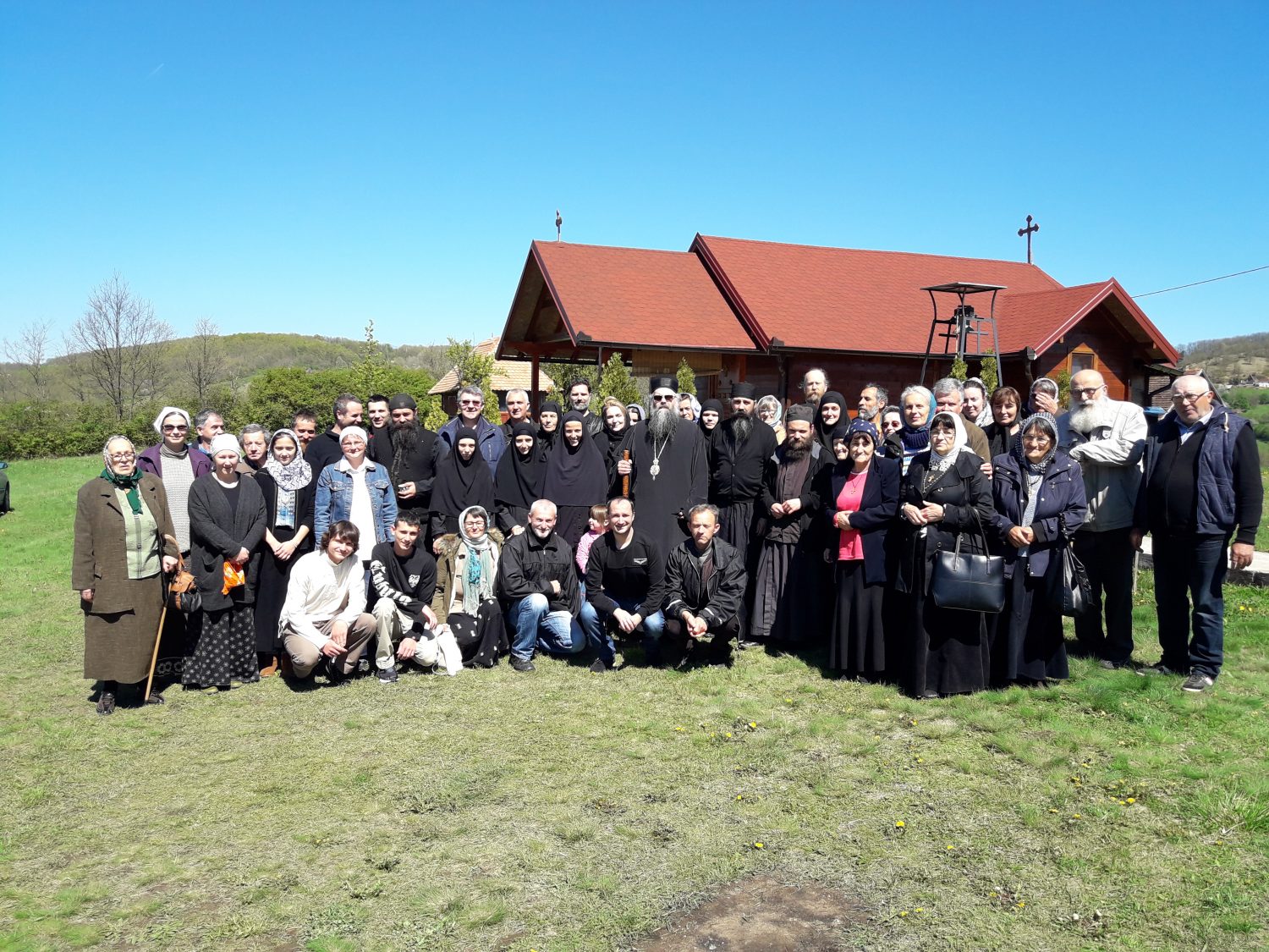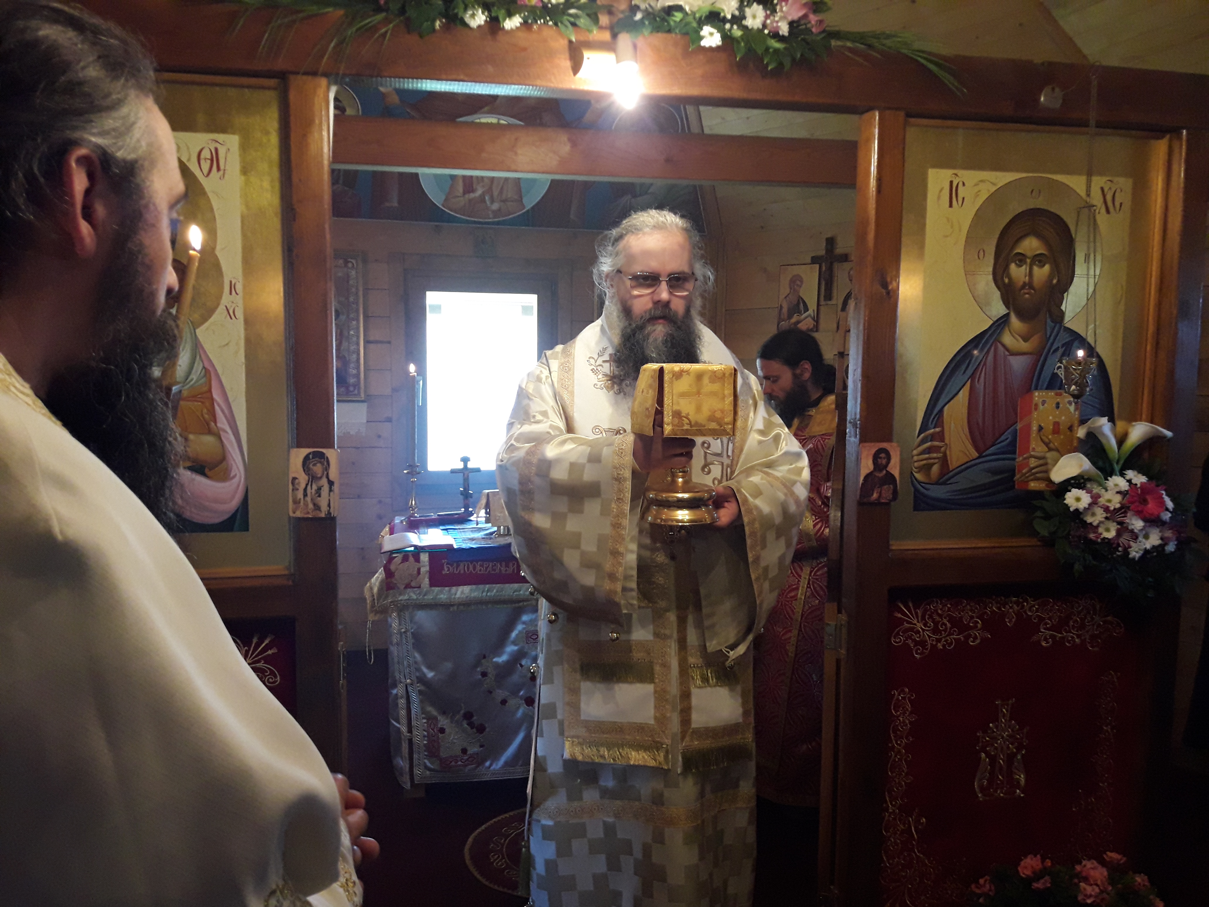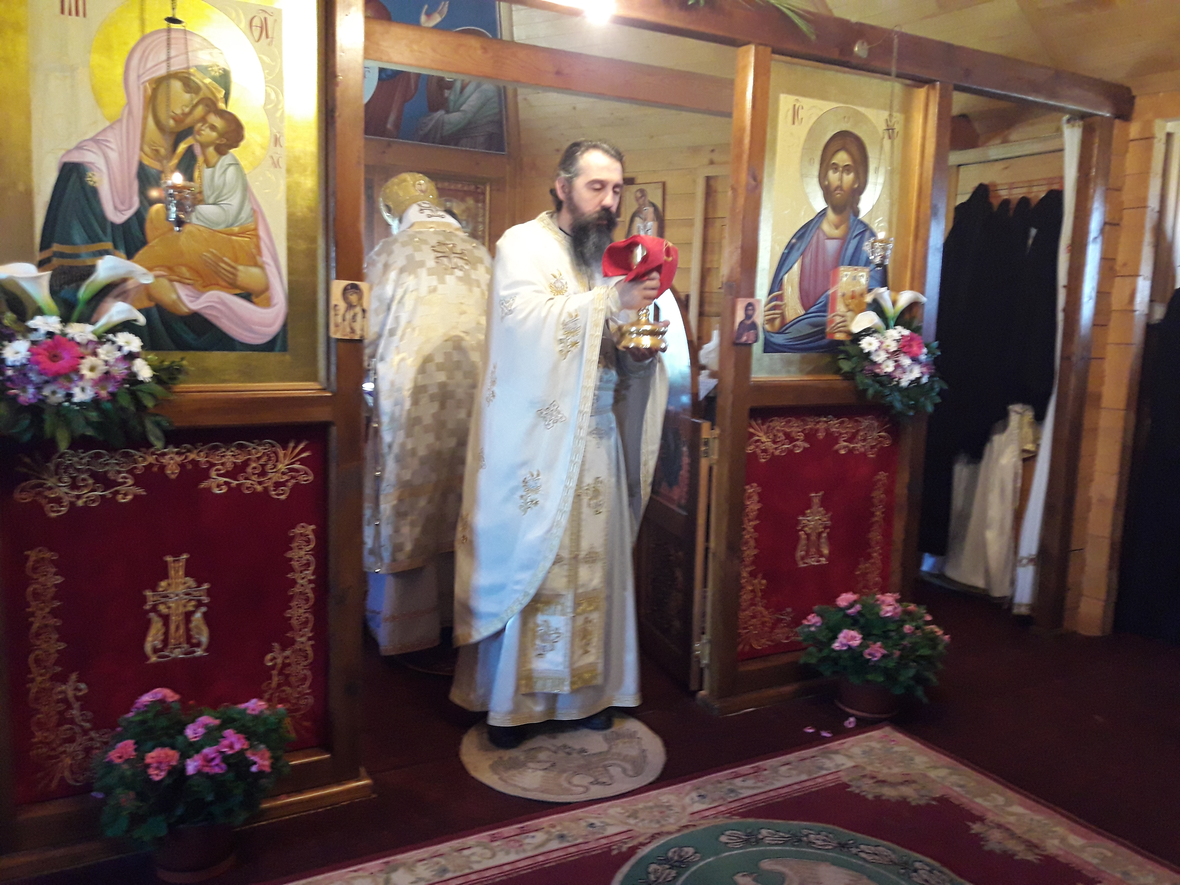 На Васкрсни уторак, 5/18. априла, Његово Преосвештенство хорепископ новобрдски и панонски Г.Г. Максим служио је Свету Архијерејску Литургију у манастиру Светог Преображења Господњег у Леушићу уз саслужење протосинђела Иринеја (Ристића) и јерођакона Онуфрија (Ђурђева). Литургији је присуствовало око 50 светосаваца.