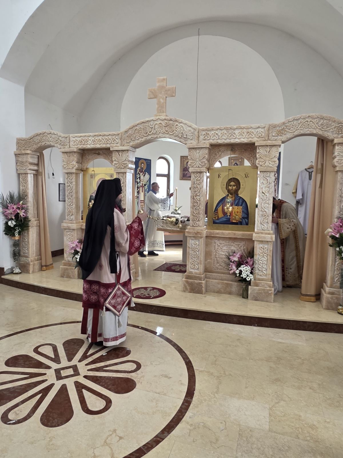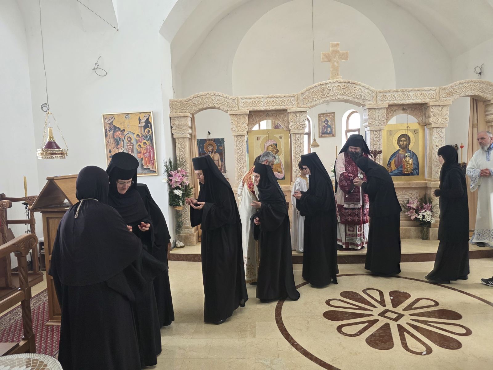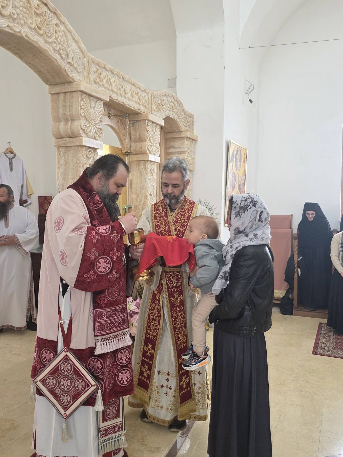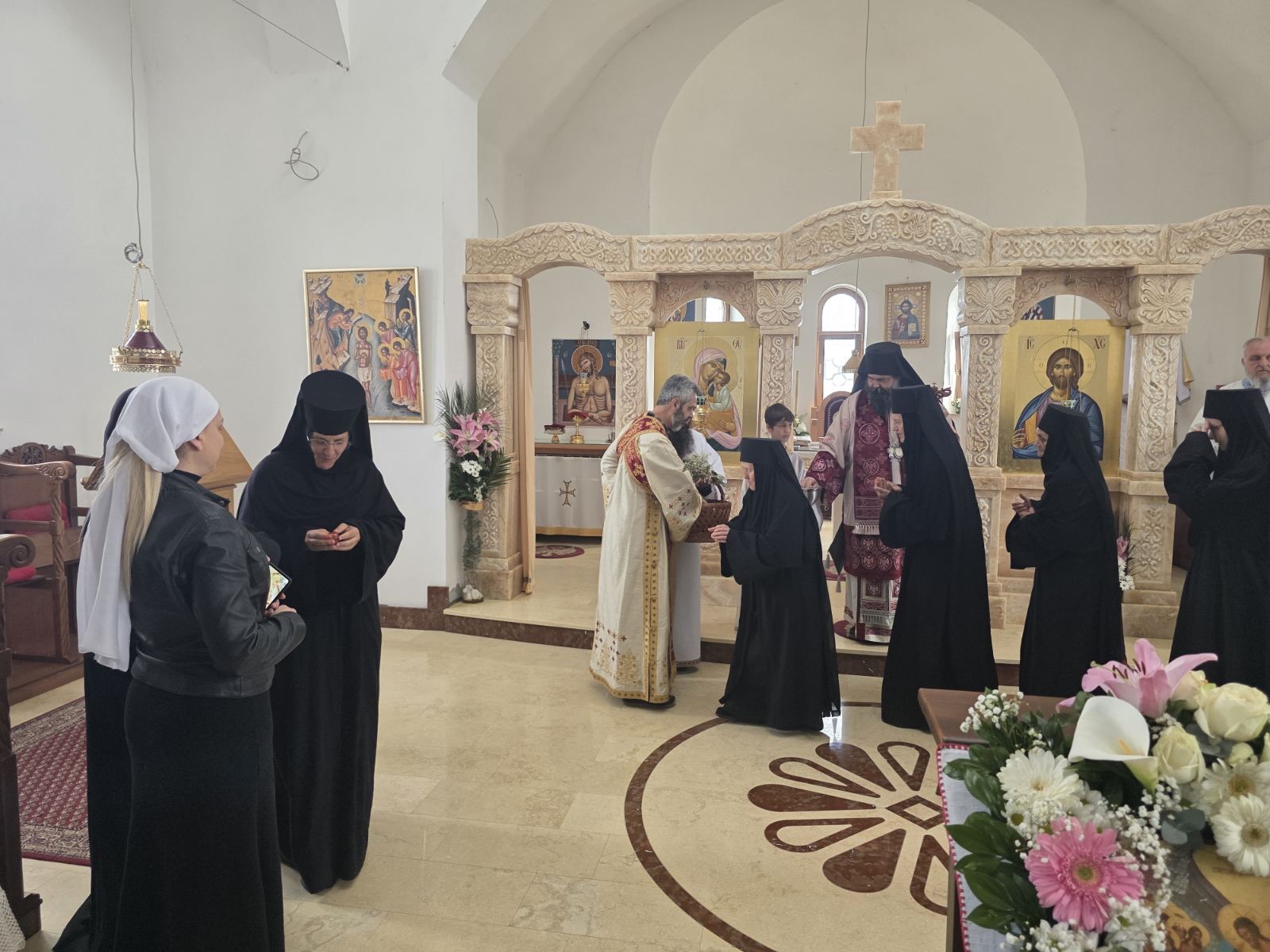 Другог дана Васкрса, на Васкршњи понедељак, 13. априла, Његово Преосвештенство Епископ рашко-призренски у егзилу Г.Г. Ксенофонт служио је Свету Архијерејску Литургију у манастиру Светог Преображења Господњег у Леушићима. Литургији је присуствовало око 70 верника. Најмлађи од њих сјединили су се са васкрслим Господом кроз Свето Причешће.