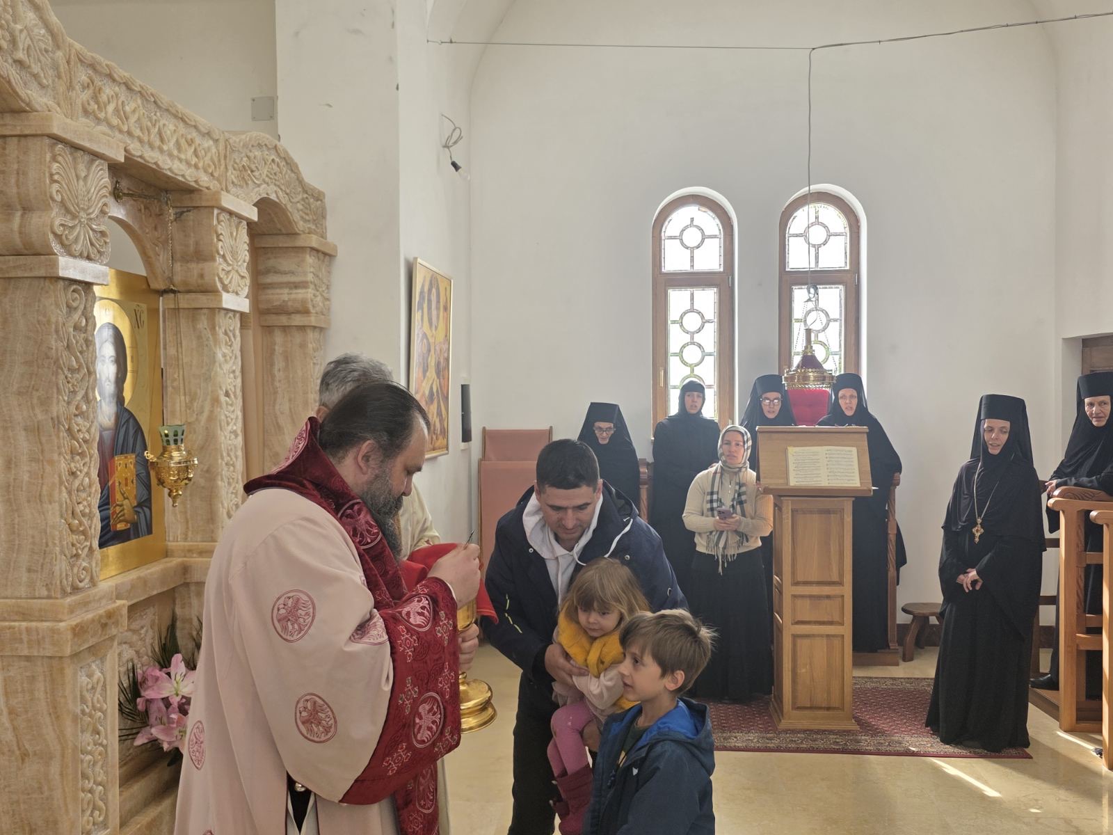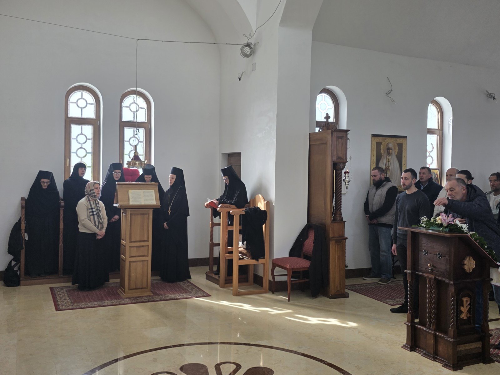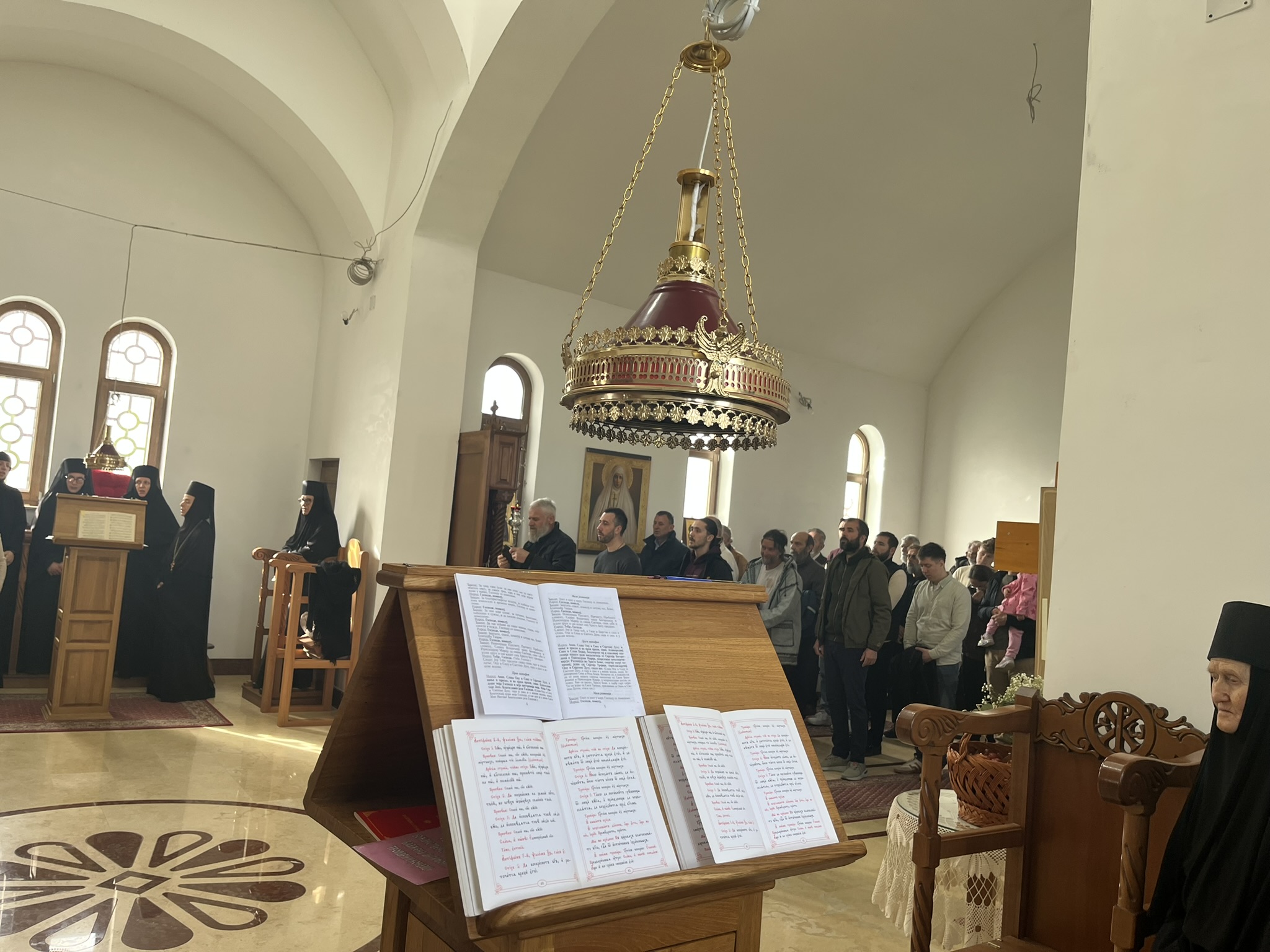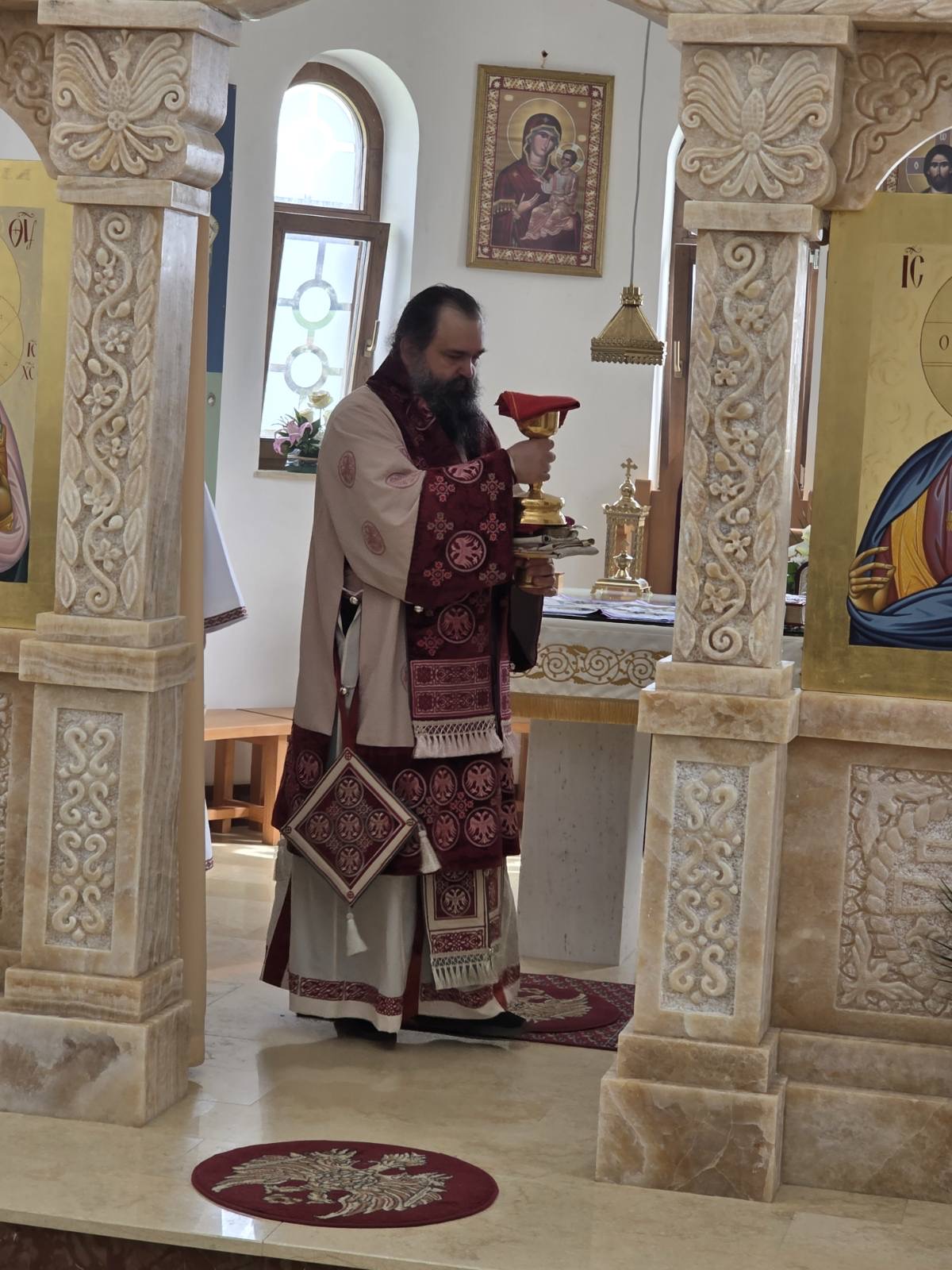 Другог дана Васкрса, на Васкршњи понедељак, 13. априла, Његово Преосвештенство Епископ рашко-призренски у егзилу Г.Г. Ксенофонт служио је Свету Архијерејску Литургију у манастиру Светог Преображења Господњег у Леушићима. Литургији је присуствовало око 70 верника. Најмлађи од њих сјединили су се са васкрслим Господом кроз Свето Причешће.