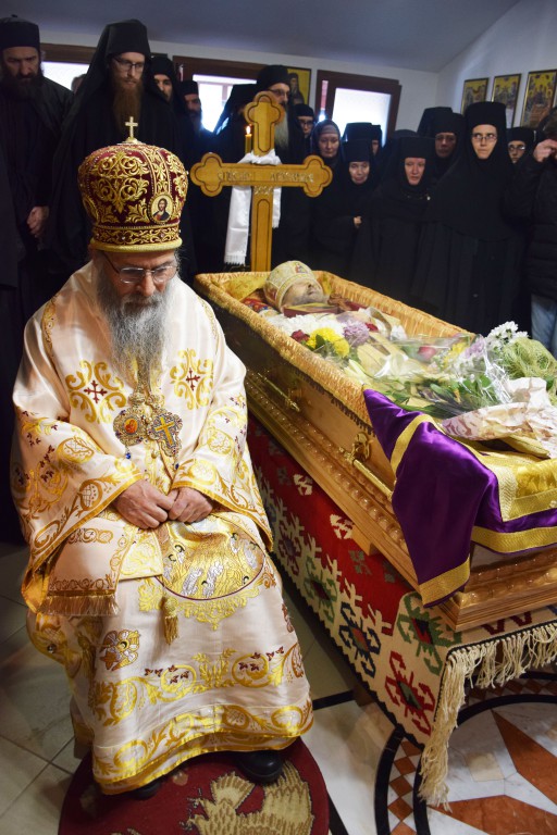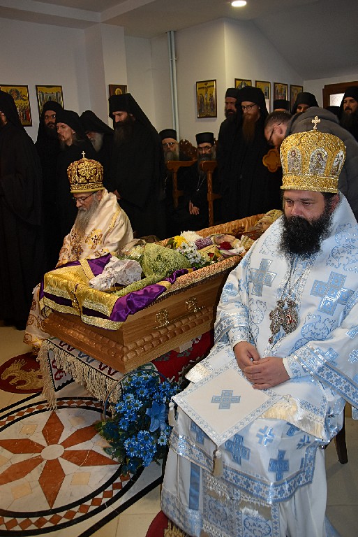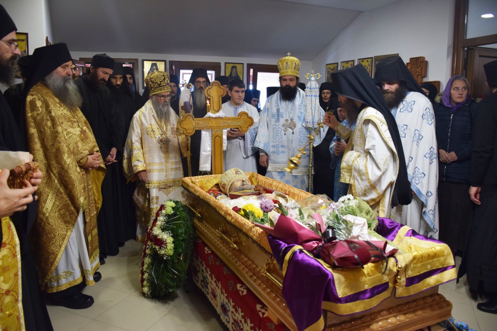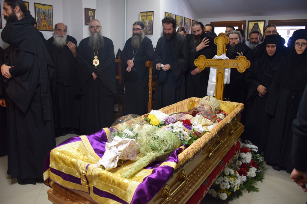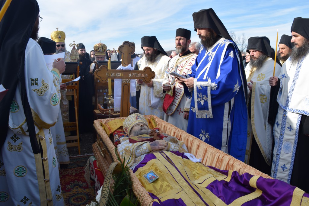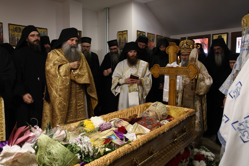 Тачно у подне почело је служење опела у порти манастира. Опело је служио Преосвећени Хорепископ Николај уз саслужење Преосвећених Хорепископа Максима, Наума и Ксенофонта, бројног свештенства и монаштва епархије. Поред монаштва епархије и већег броја верника молитвено учешће су узеле и монахиње из манастира Ћелије предвођене игуманијом Гликеријом, којима је Владика Артемије 16 година био духовник.