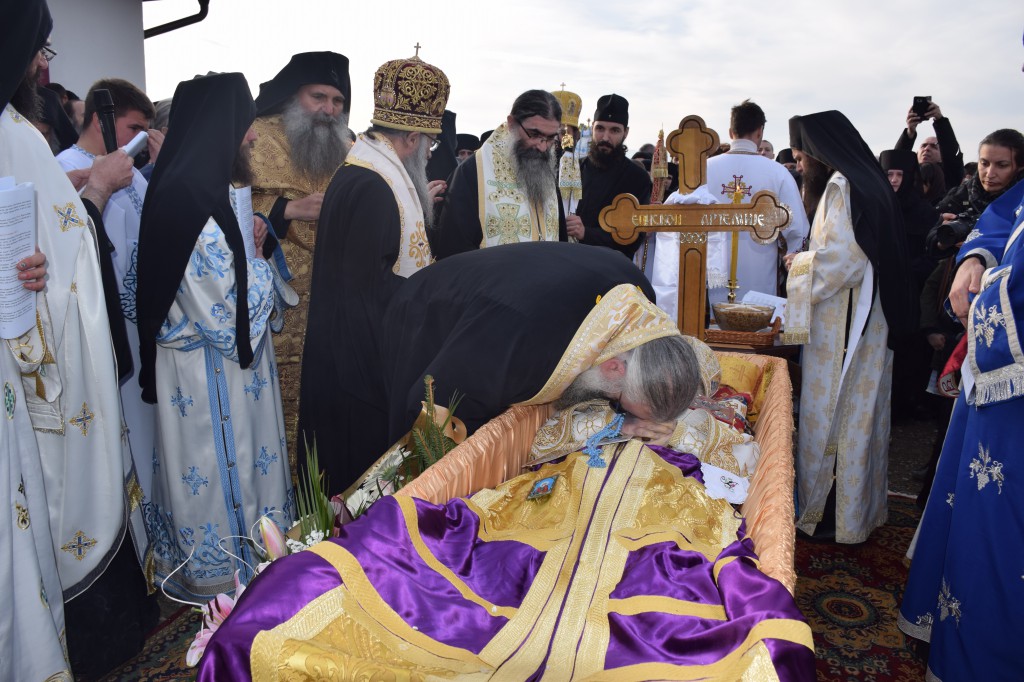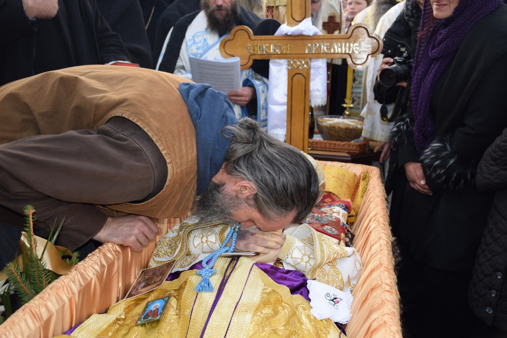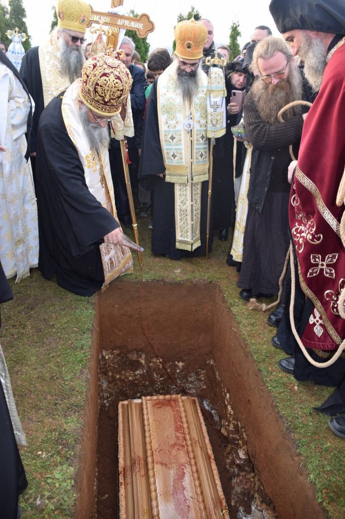 Потом је тело блаженопочившег Владике Артемија предато мајци земљи да га чува до свеопштег васкрсења. Најпре су епископи на ковчег бацили донету земљу са Косова и Метохије а потом и сви верни по грумен лелићке земље уз појање победничке химне „ХРИСТОС ВАСКРСЕ ИЗ МРТВИХ, СМРЋУ СМРТ УНИШТИ, И СВИМА У ГРОБОВИМА ЖИВОТ ДАРОВА”.
